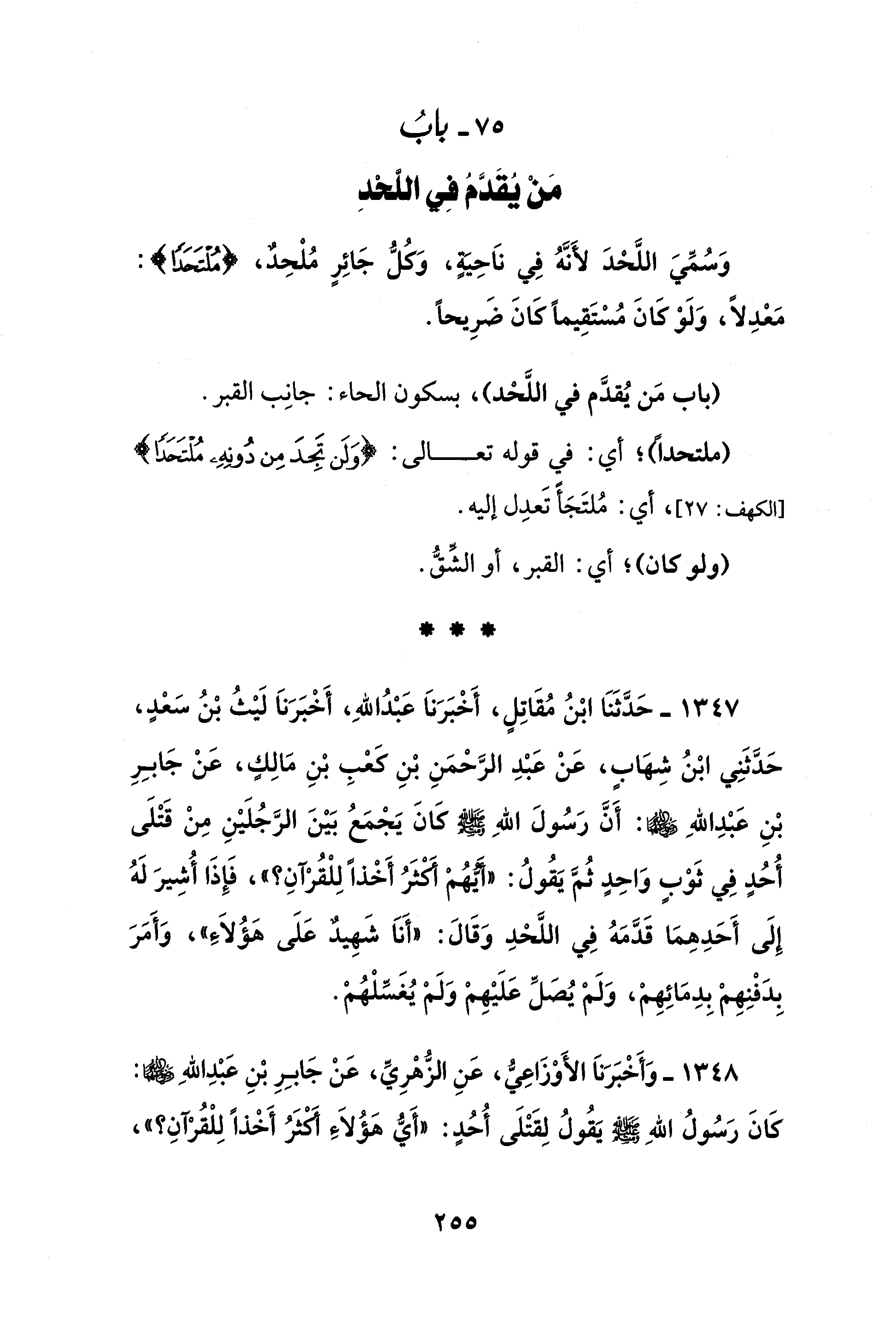 1347 - حَدَّثَنَا ابْنُ مُقَاتِلٍ، أَخْبَرَناَ عَبْدُ اللهِ، أَخْبَرَناَ لَيْثُ بْنُ سَعْدٍ، حَدَّثَنِي ابْنُ شِهَابٍ، عَنْ عَبْدِ الرَّحْمَنِ بْنِ كعْبِ بْنِ مَالِكٍ، عَنْ جَابِرِ بْنِ عَبْدِ اللهِ - رضي الله عنهما - أَنَّ رَسُولَ اللهِ - صلى الله عليه وسلم - كَانَ يَجْمَعُ بَيْنَ الرَّجُلَيْنِ مِنْ قَتْلَى أُحُدٍ فِي ثَوْبٍ وَاحِدٍ ثُمَّ يَقُولُ: "أَيُّهُمْ أَكْثَرُ أَخْذًا لِلْقُرْآنِ؟ "، فَإِذَا أُشِيرَ لَهُ إِلَى أَحَدِهِمَا قَدَّمَهُ فِي اللَّحْدِ وَقَالَ: "أَناَ شَهِيدٌ عَلَى هَؤُلاَءِ"، وَأَمَرَ بِدَفْنِهِمْ بِدِمَائِهِمْ، وَلَمْ يُصَلِّ عَلَيْهِمْ وَلَمْ يُغَسِّلْهُمْ.