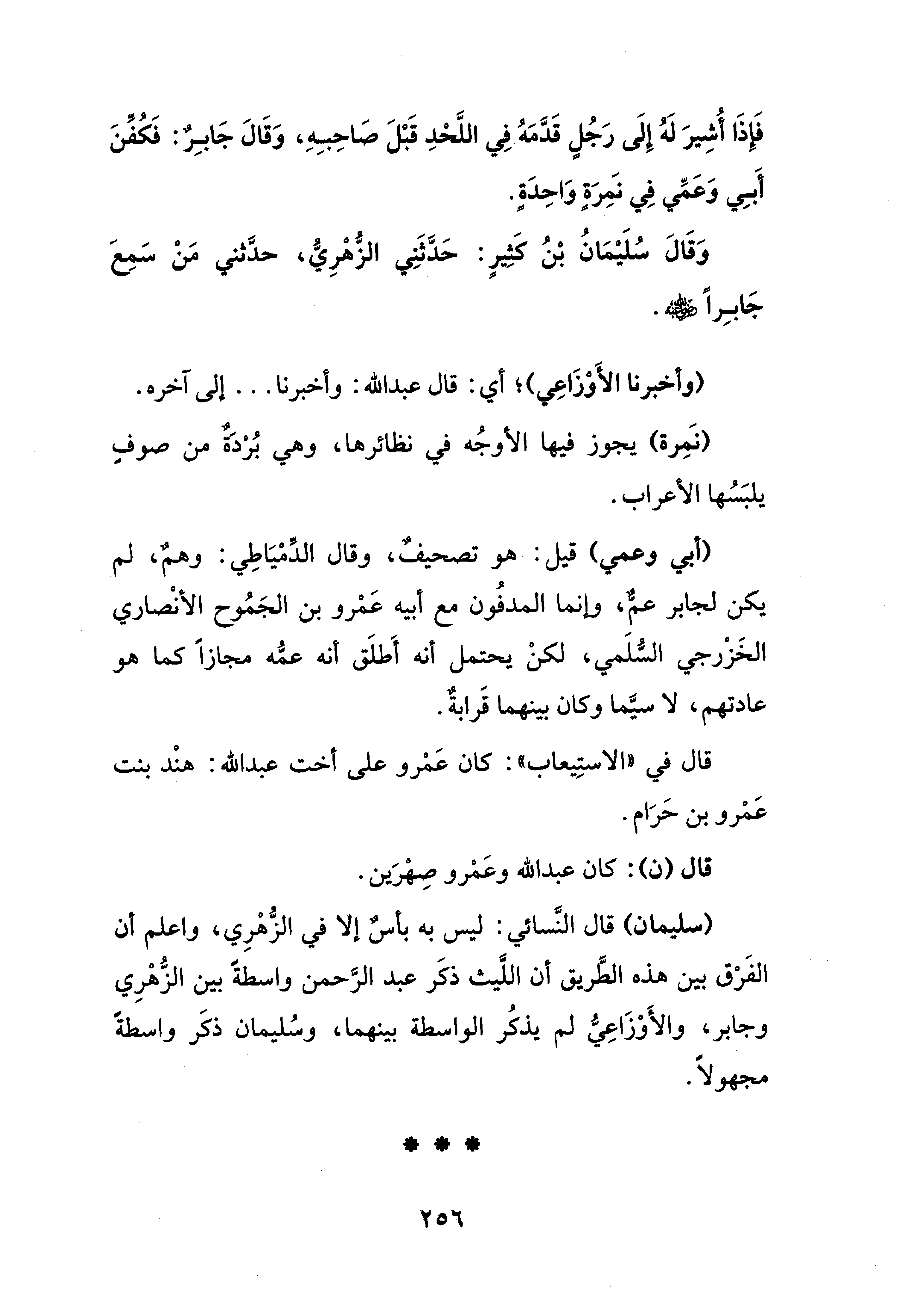 (أبي وعمي) قيل: هو تصحيفٌ، وقال الدِّمْيَاطِي: وهمٌ، لم يكن لجابر عمٌّ، وإنما المدفُون مع أبيه عَمْرو بن الجَمُوح الأنْصاري الخَزْرجي السُّلَمي، لكنْ يحتمل أنه أَطلَق أنه عمُّه مجازًا كما هو عادتهم، لا سيَّما وكان بينهما قَرابةٌ.