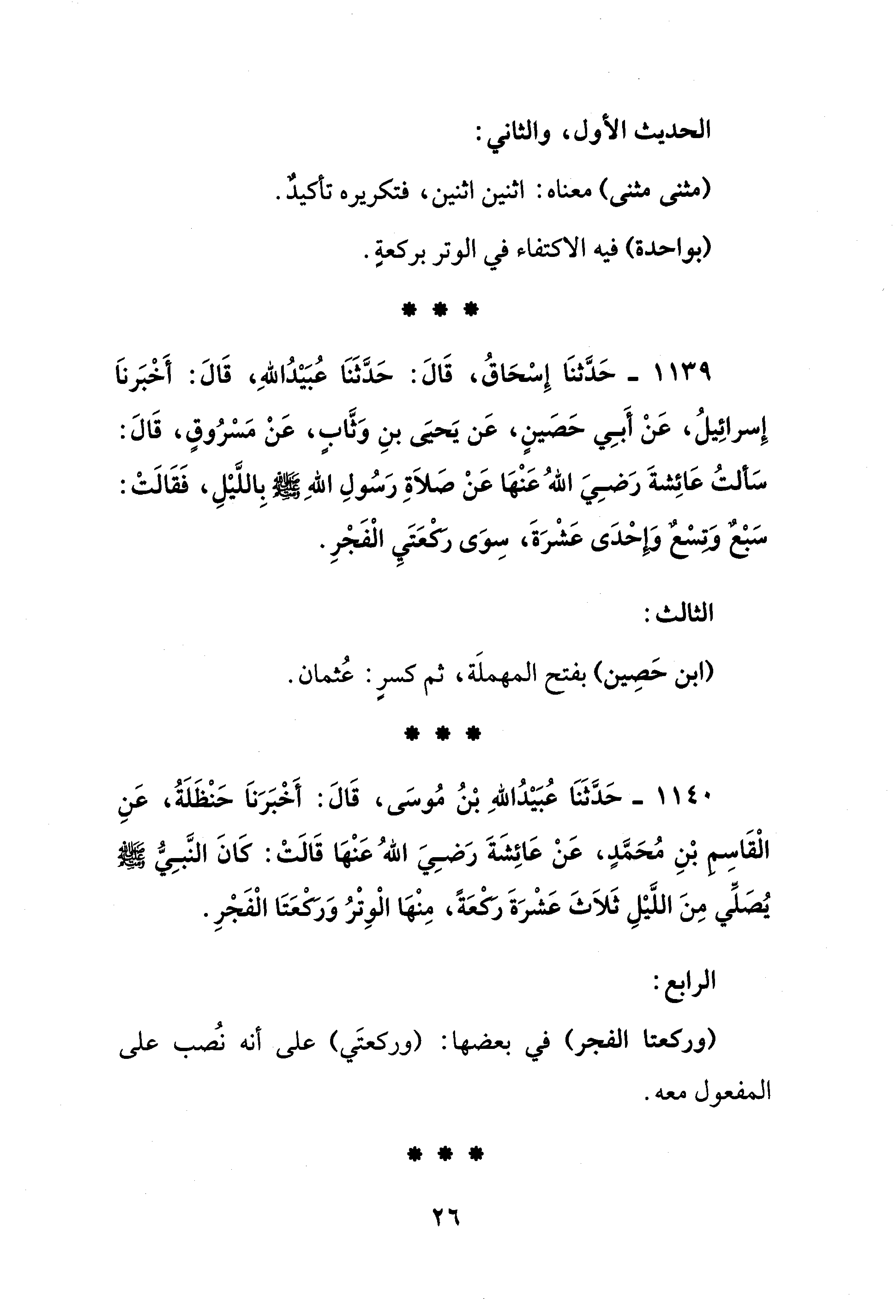 1139 - حَدَّثنَا إِسْحَاقُ، قَالَ: حَدَّثَنَا عُبَيْدُ اللهِ، قَالَ: أَخْبَرناَ إِسرائِيلُ، عَنْ أَبِي حَصَينٍ، عَن يَحيَى بنِ وَثَّابٍ، عَنْ مَسْرُوقٍ، قَالَ: سَألتُ عَائِشةَ رَضِيَ اللهُ عَنْهَا عَنْ صَلاَةِ رَسُولِ اللهِ - صلى الله عليه وسلم - بِاللَّيْلِ، فَقَالَتْ: سَبْعٌ وتِسْعٌ وإحْدَى عَشْرَةَ، سِوَى ركعَتَيِ الْفَجْرِ.