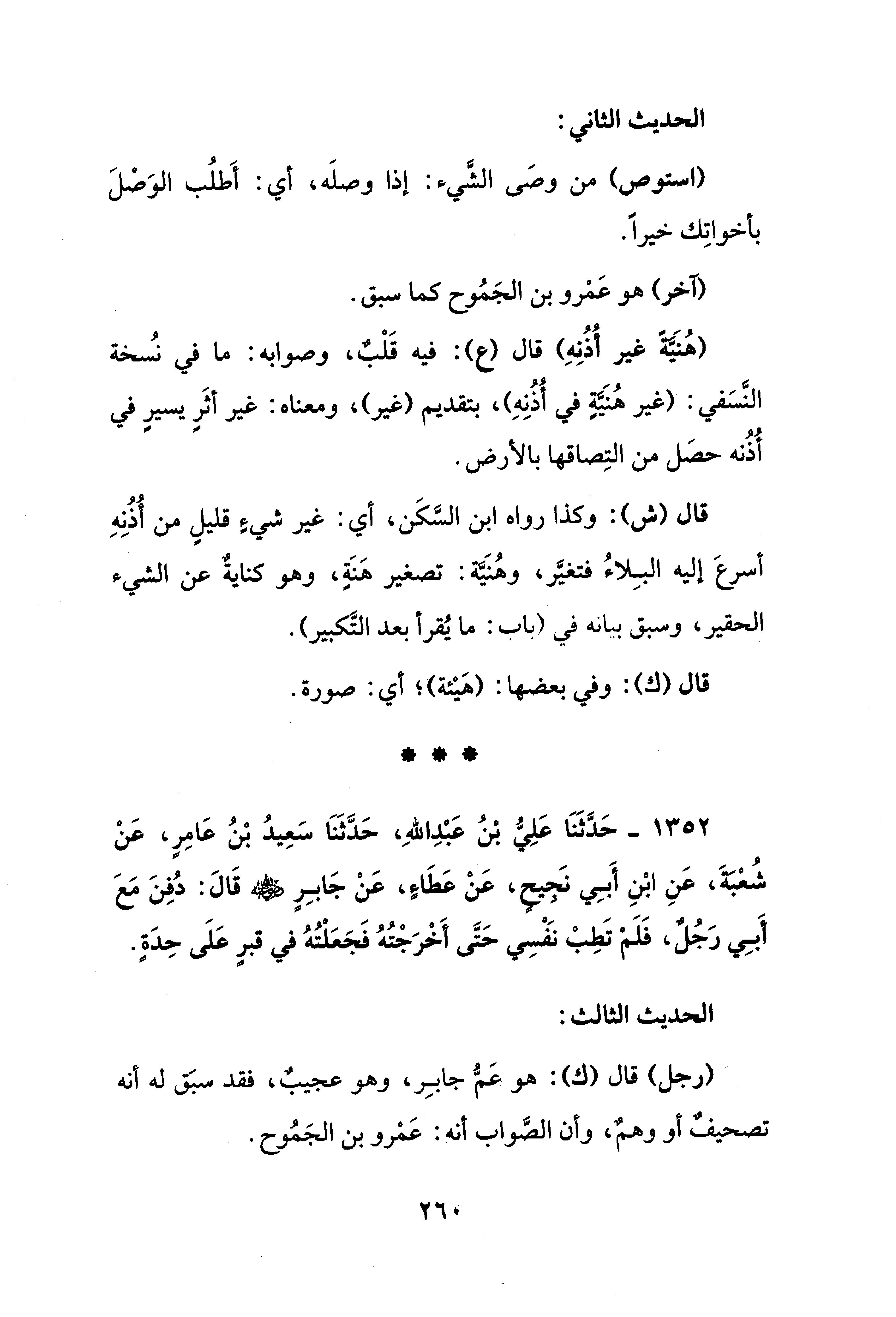 (هُنَيَّةً غير أُذُنِهِ) قال (ع): فيه قَلْبٌ، وصوابه: ما في نُسخة النَّسَفي: (غير هُنَيَةٍ في أُذُنِهِ)، بتقديم (غير)، ومعناه: غير أثَرٍ يسيرٍ في أُذُنه حصَل من التِصاقها بالأرض.
