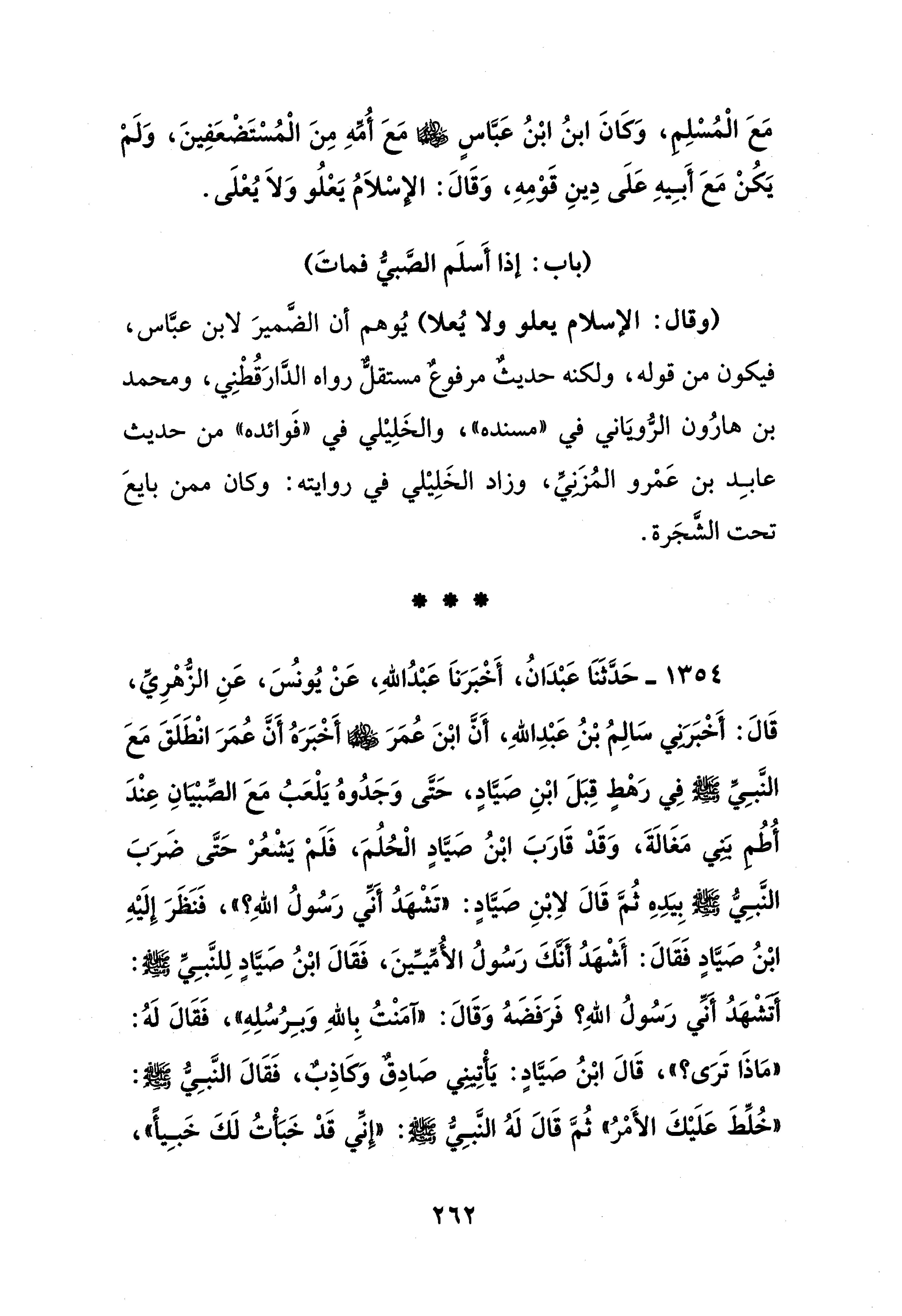 1354 - حَدَّثَنَا عَبْدَانُ، أَخْبَرَناَ عَبْدُ اللهِ، عَنْ يُونُسَ، عَنِ الزُّهْرِيِّ، قَالَ: أَخْبَرَنِي سَالِمُ بْنُ عَبْدِ اللهِ، أَنَّ ابْنَ عُمَرَ - رضي الله عنهما - أَخْبَرَهُ أَنَّ عُمَرَ انْطَلَقَ مَعَ النَّبِيِّ - صلى الله عليه وسلم - فِي رَهْطٍ قِبَلَ ابْنِ صَيَّادٍ، حَتَّى وَجَدُوهُ يَلْعَبُ مَعَ الصِّبْيَانِ عِنْدَ أُطُم بَنِي مغَالَةَ، وَقَدْ قَارَبَ ابْنُ صَيَّادٍ الْحُلُمَ، فَلَمْ يَشْعُرْ حَتَّى ضَرَبَ النَّبِيُّ - صلى الله عليه وسلم - بِيَدِهِ ثُمَّ قَالَ لاِبْنِ صَيَّادٍ: "تَشْهَدُ أَنِّي رَسُولُ اللهِ؟ "، فَنَظَرَ إِلَيْهِ ابْنُ صَيَّادٍ فَقَالَ: أَشْهَدُ أَنَّكَ رَسُولُ الأُمِّيِّينَ، فَقَالَ ابْنُ صَيَّادٍ لِلنَّبِيِّ - صلى الله عليه وسلم -: أتَشْهَدُ أَنِّي رَسُولُ اللهِ؟ فَرَفَضَهُ وَقَالَ: "آمَنْتُ بِاللهِ وَبِرُسُلِهِ"، فَقَالَ لَهُ: "مَاذَا تَرَى؟ "، قَالَ ابْنُ صَيَّادٍ: يَأْتِينِي صَادِقٌ وَكَاذِبٌ، فَقَالَ النَّبِيُّ - صلى الله عليه وسلم -: "خُلِّطَ عَلَيْكَ الأَمْرُ" ثُمَّ قَالَ لَهُ النَّبِيُّ - صلى الله عليه وسلم -: "إِنِّي قَدْ خَبَأْتُ لَكَ خَبِيأً"،