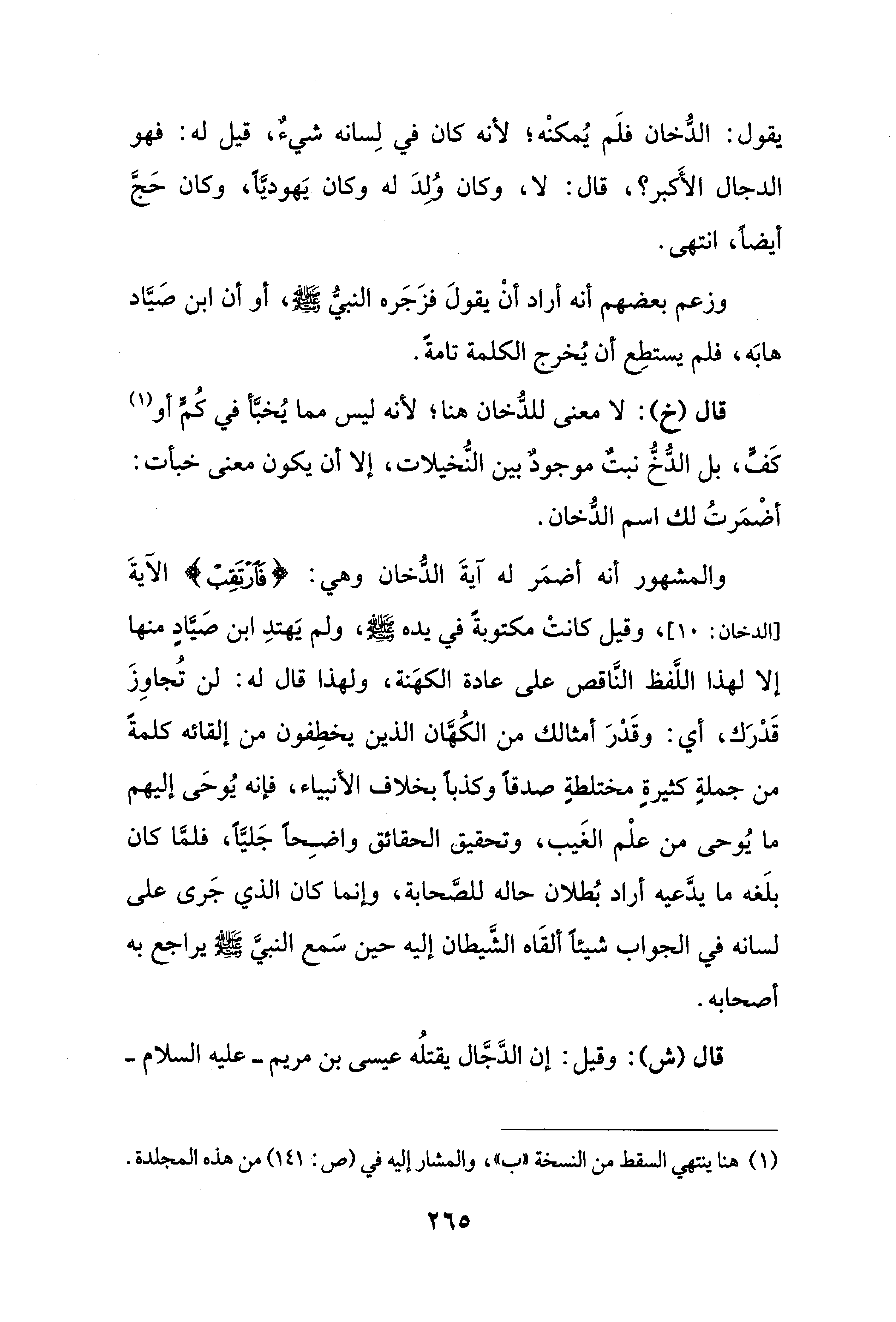 يقول: الدُّخان فلَم يُمكنْه؛ لأنه كان في لِسانه شيءٌ، قيل له: فهو الدجال الأَكبر؟، قال: لا، وكان وُلِدَ له وكان يَهوديًّا، وكان حَجَّ أيضًا، انتهى.