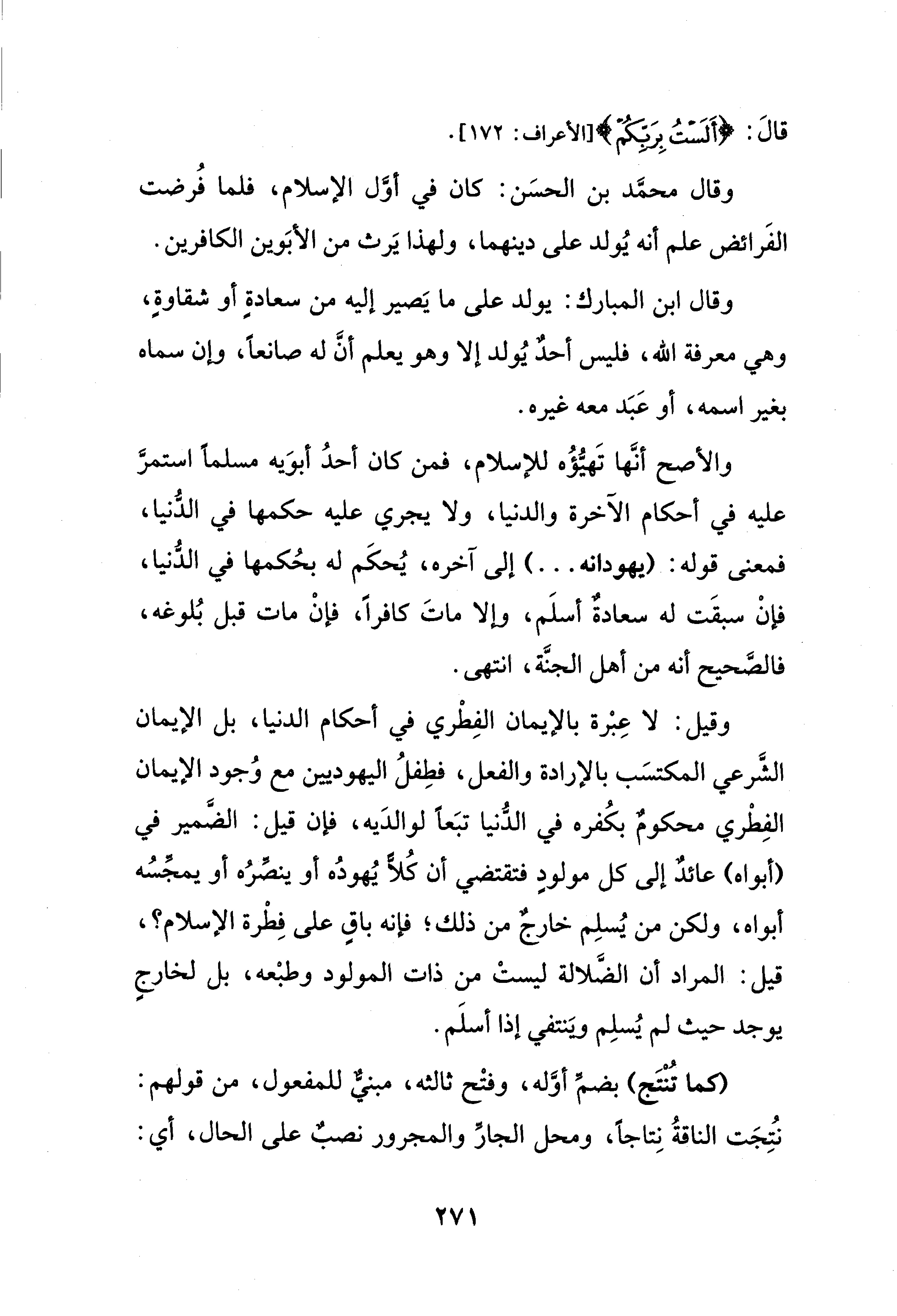 وقيل: لا عِبْرة بالإيمان الفِطْري في أحكام الدنيا، بل الإيمان الشَّرعي المكتسَب بالإرادة والفعل، فطِفلُ اليهوديين مع وُجود الإيمان الفِطْري محكومٌ بكُفره في الدُّنيا تبَعًا لوالدَيه، فإن قيل: الضَّمير في (أبواه) عائدٌ إلى كل مولودٍ فتقتضي أن كُلًّا يُهودُه أو ينصِّرُه أو يمجِّسُه أبواه، ولكن من يُسلِم خارجٌ من ذلك؛ فإنه باقٍ على فِطْرة الإسلام؟، قيل: المراد أن الضَّلالة ليستْ من ذات المولود وطبْعه، بل لخارجٍ يوجد حيث لم يُسلِم ويَنتفي إذا أسلَم.