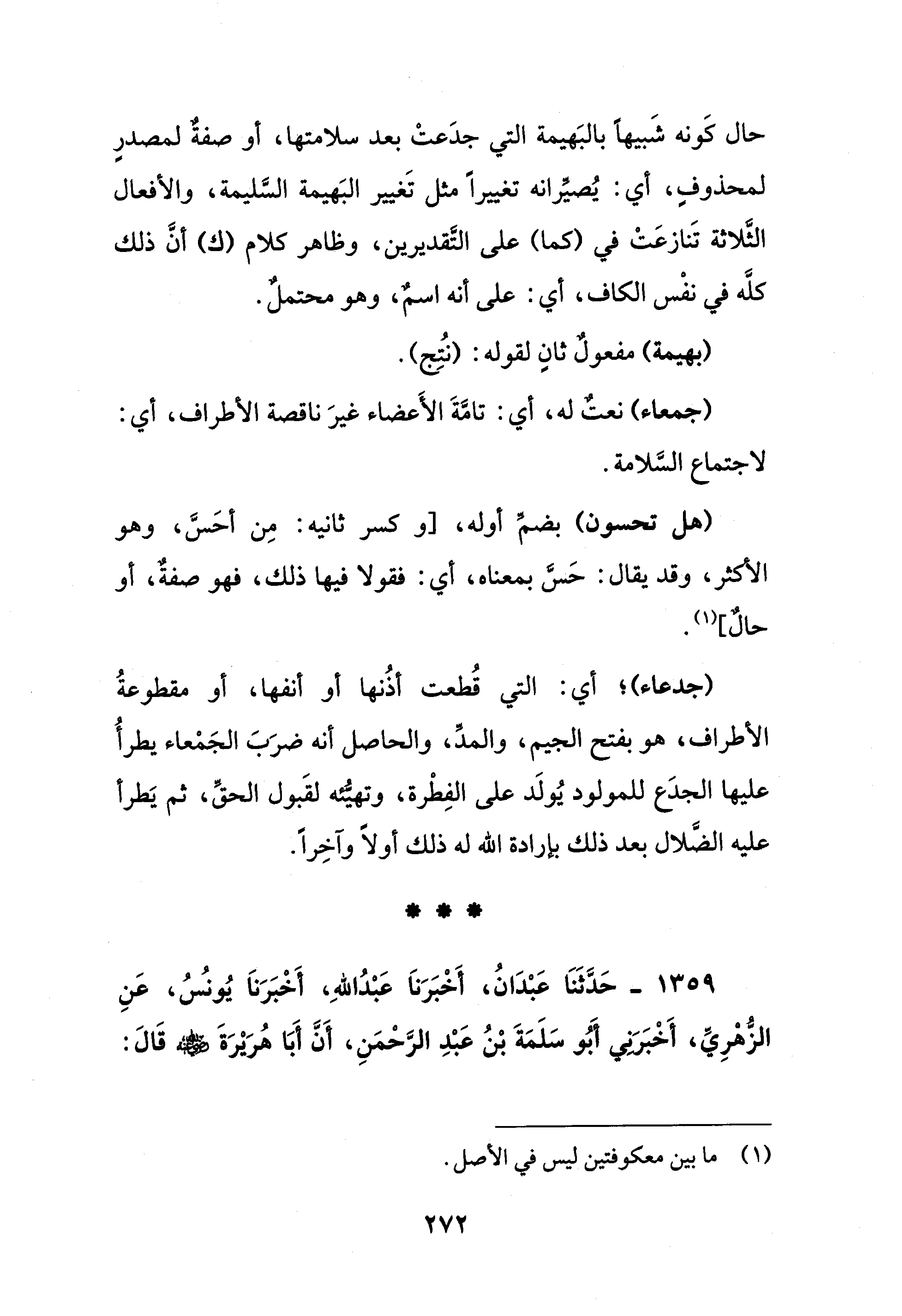 (جدعاء)؛ أي: التي قُطعت أذُنها أو أنفها، أو مقطوعةُ الأطراف، هو بفتح الجيم، والمدِّ، والحاصل أنه ضرَبَ الجَمْعاء يطرأُ عليها الجدَع للمولود يُولَد على الفِطْرة، وتهيُّئه لقَبول الحقِّ، ثم يَطرأ عليه الضَّلال بعد ذلك بإرادة الله له ذلك أولًا وآخِرًا.