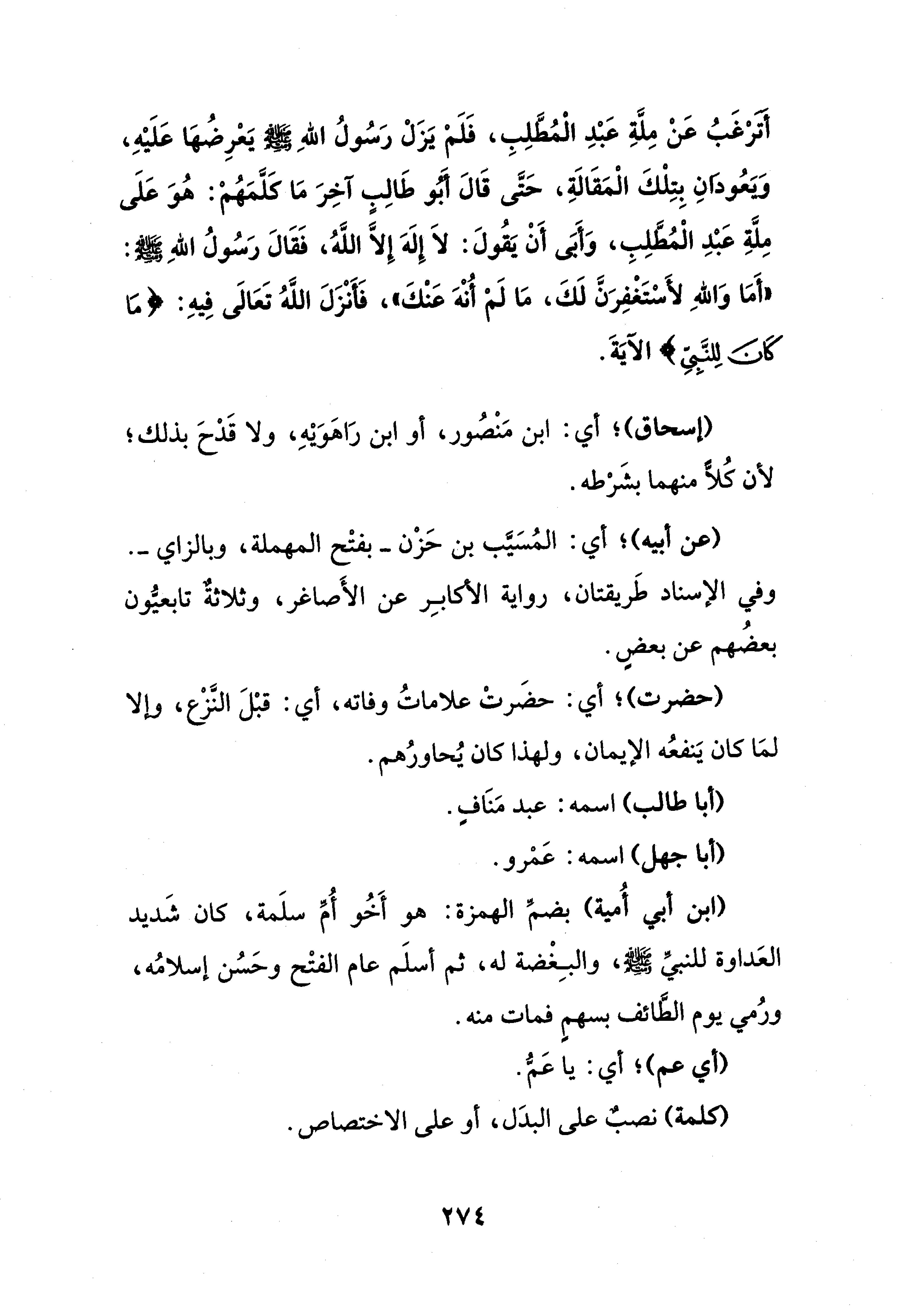 أتَرْغَبُ عَنْ مِلَّةِ عَبْدِ الْمُطَّلِبِ، فَلَمْ يَزَلْ رَسُولُ اللهِ - صلى الله عليه وسلم - يَعْرِضُهَا عَلَيْهِ، وَيَعُودَانِ بِتِلْكَ الْمَقَالَةِ، حَتَّى قَالَ أَبُو طَالِبٍ آخِرَ مَا كلَّمَهُمْ: هُوَ عَلَى مِلَّةِ عَبْدِ الْمُطَّلِبِ، وَأَبَى أَنْ يَقُولَ: لاَ إِلَهَ إِلَّا اللهُ، فَقَالَ رَسُولُ اللهِ - صلى الله عليه وسلم -: "أَمَا وَاللهِ لأَسْتَغْفِرَنَّ لَكَ، مَا لَمْ أُنْهَ عَنْكَ"، فَأَنْزَلَ اللهُ تَعَالَى فِيهِ: {مَا كاَنَ لِلنَّبِيِّ} الآيَةَ.