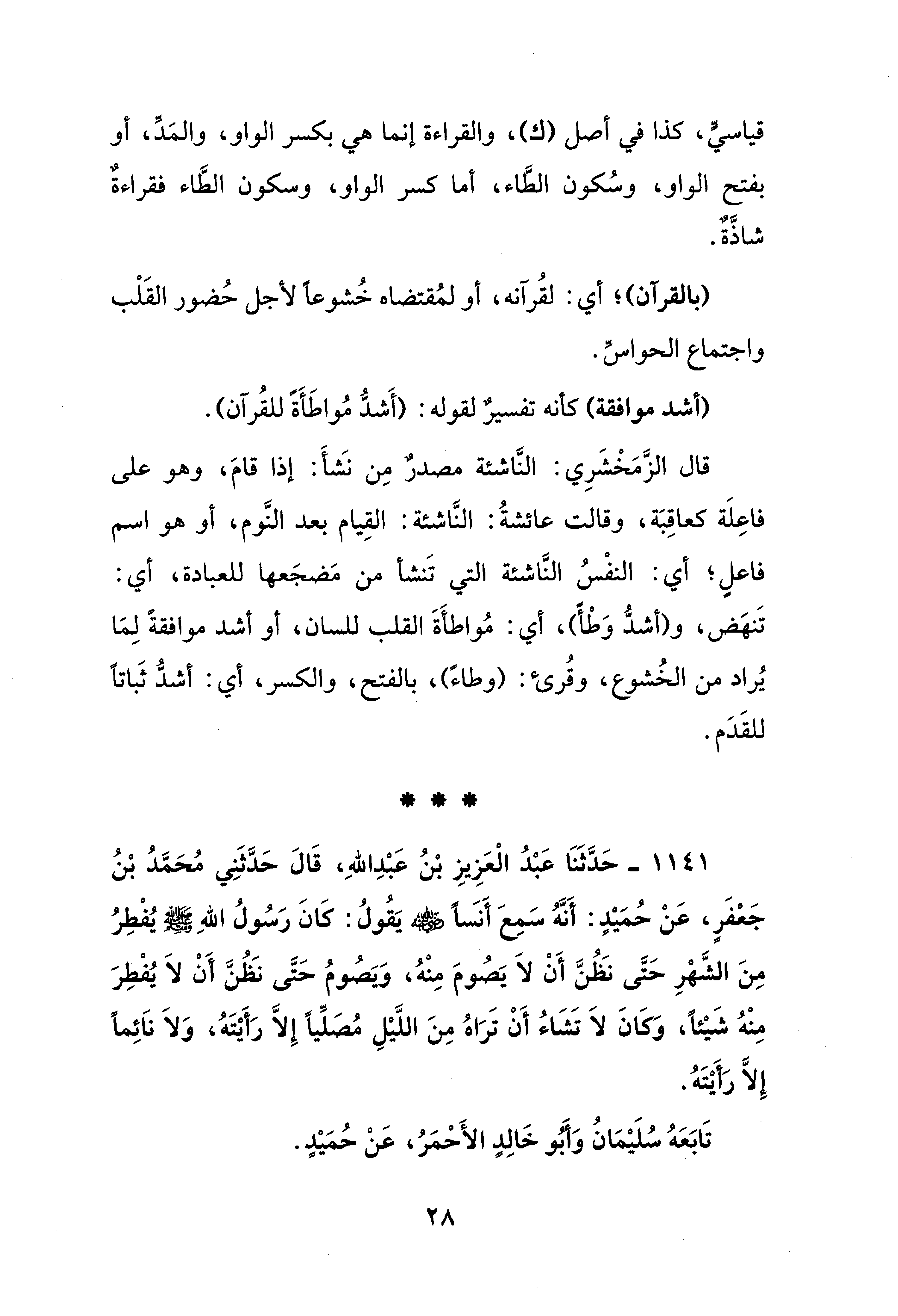 قال الزَّمَخْشَرِي: النَّاشئة مصدرٌ مِن نشَأ: إذا قامَ، وهو على فاعِلَة كعاقِبة، وقالت عائشةُ: النَّاشئة: القِيام بعد النَّوم، أو هو اسم فاعلٍ؛ أي: النفْسُ النَّاشئة التي تَنشأ من مَضجَعها للعبادة، أي: تَنهَض، و (أشدُّ وَطْأ)، أي: مُواطأَةَ القلب للسان، أو أشد موافقةَ لِمَا يُراد من الخُشوع، وقُرئ: (وطاءً)، بالفتح، والكسر، أي: أشدُّ ثَباتًا للقَدَم.
