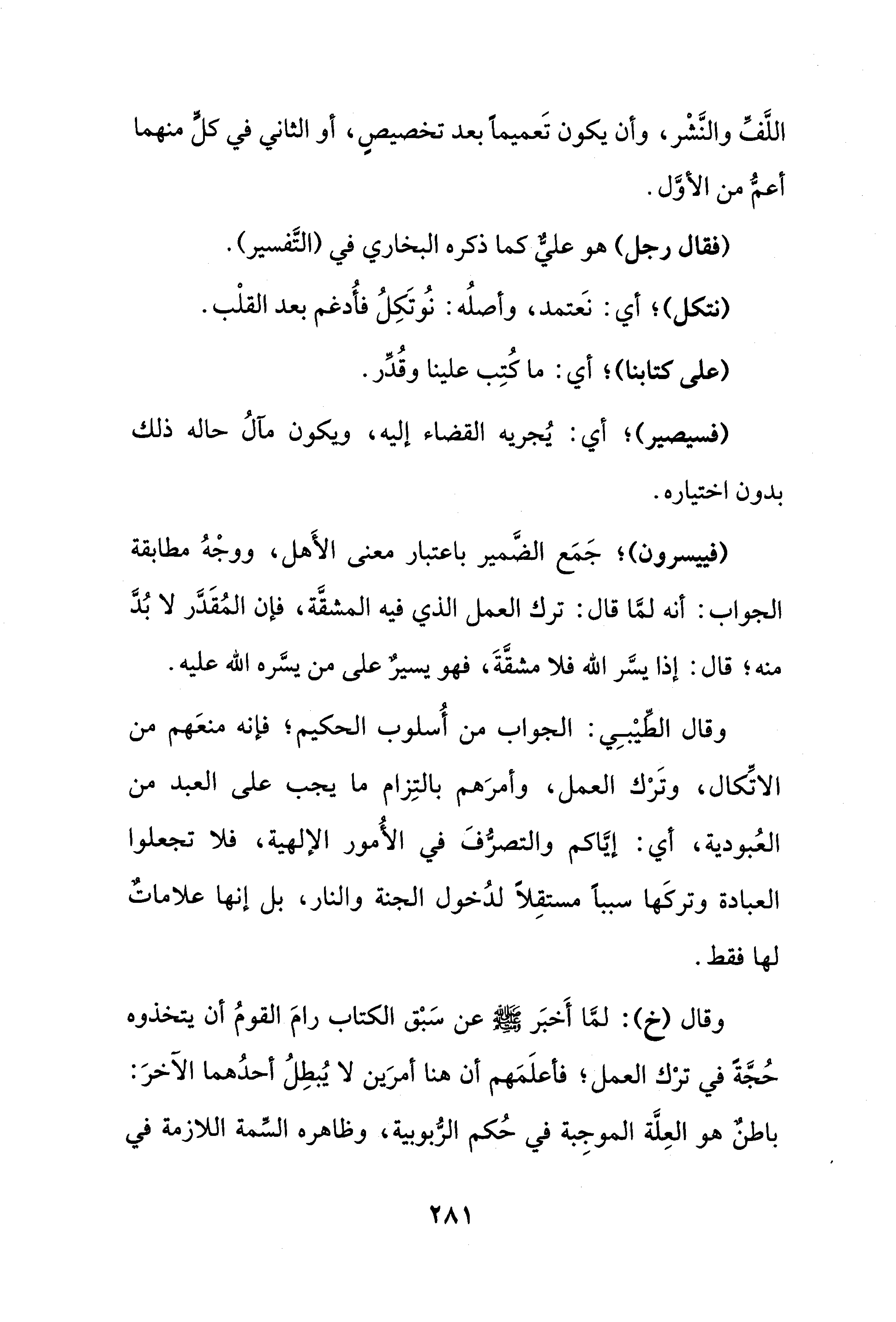وقال (خ): لمَّا أَخبَر - صلى الله عليه وسلم - عن سَبْق الكتاب رامَ القومُ أن يتخذوه حُجَّةً في ترْك العمل؛ فأعلَمَهم أن هنا أمرَين لا يُبطِلُ أحدُهما الآخرَ: باطنٌ هو العِلَّة الموجِبة في حُكم الرُّبوبية، وظاهره السِّمة اللازمة في