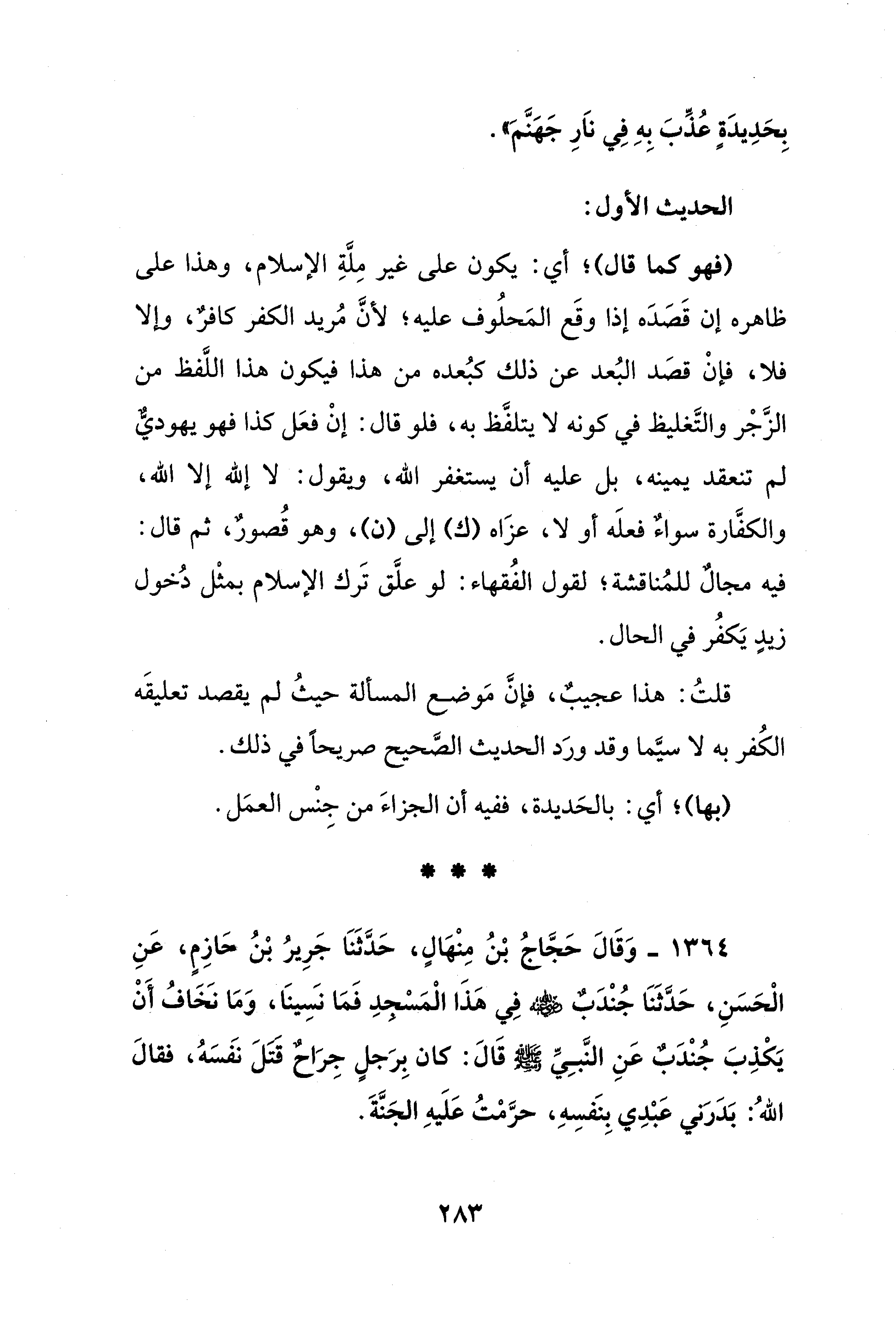1364 - وَقَالَ حَجَّاجُ بْنُ مِنْهَالٍ، حَدَّثَنَا جَرِيرُ بْنُ حَازِمٍ، عَنِ الْحَسَنِ، حَدَّثَنَا جُنْدَبٌ - رضي الله عنه - فِي هَذَا الْمَسْجدِ فَمَا نَسِينَا، وَمَا نَخَافُ أَنْ يَكْذِبَ جُنْدَبٌ عَنِ النَّبِيِّ - صلى الله عليه وسلم - قَالَ: كان بِرَجلٍ جِرَاحٌ قَتَلَ نَفسَهُ، فقالَ اللهُ: بَدَرَني عَبْدِي بِنَفسِهِ، حرَّمْتُ عَلَيهِ الجَنَّةَ.
