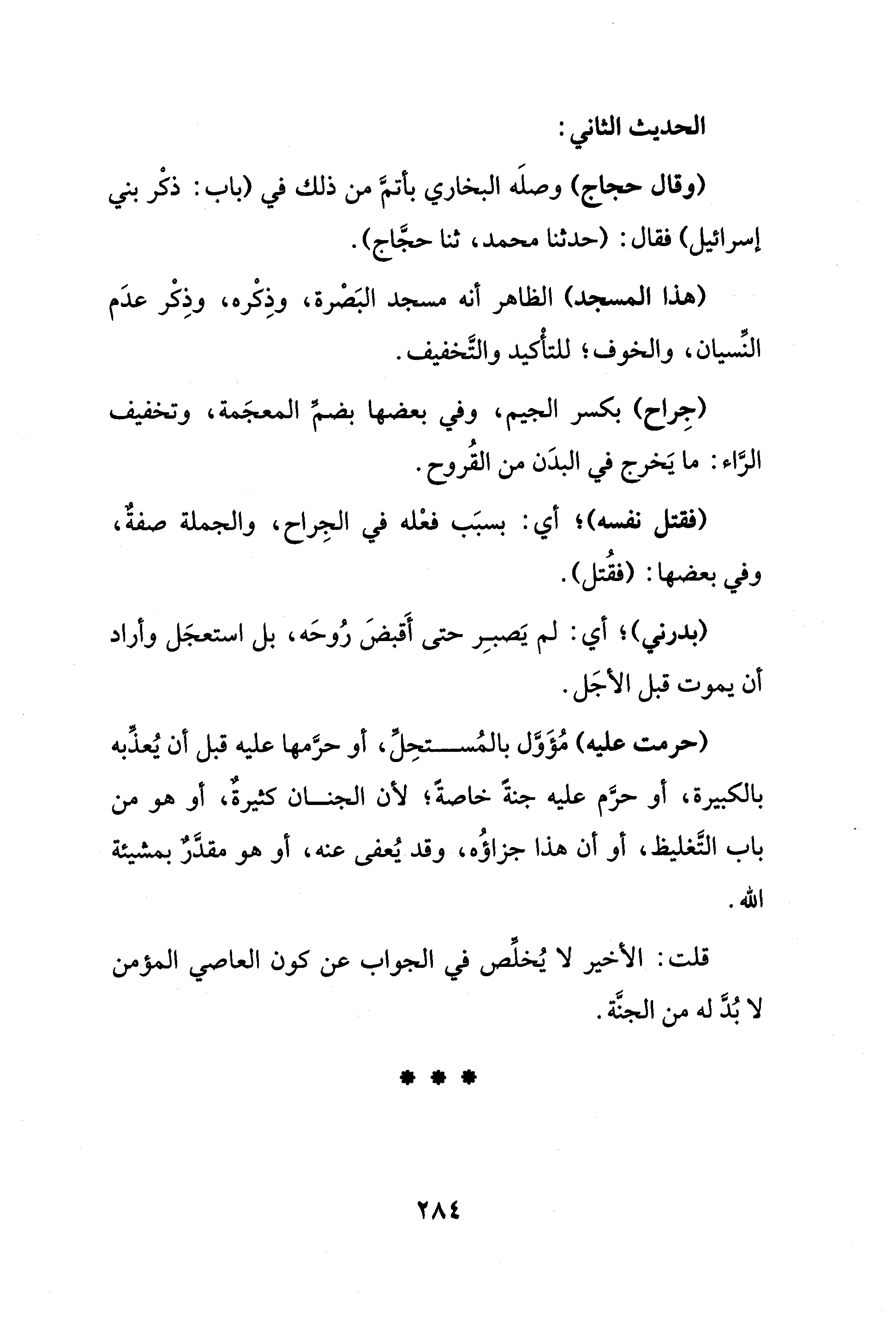 (حرمت عليه) مُؤَوَّل بالمُستحِلِّ، أو حرَّمها عليه قبل أن يُعذِّبه بالكبيرة، أو حرَّم عليه جنةً خاصةً؛ لأن الجنان كثيرةٌ، أو هو من باب التَّغليظ، أو أن هذا جزاؤُه، وقد يُعفى عنه، أو هو مقدَّرٌ بمشيئة الله.