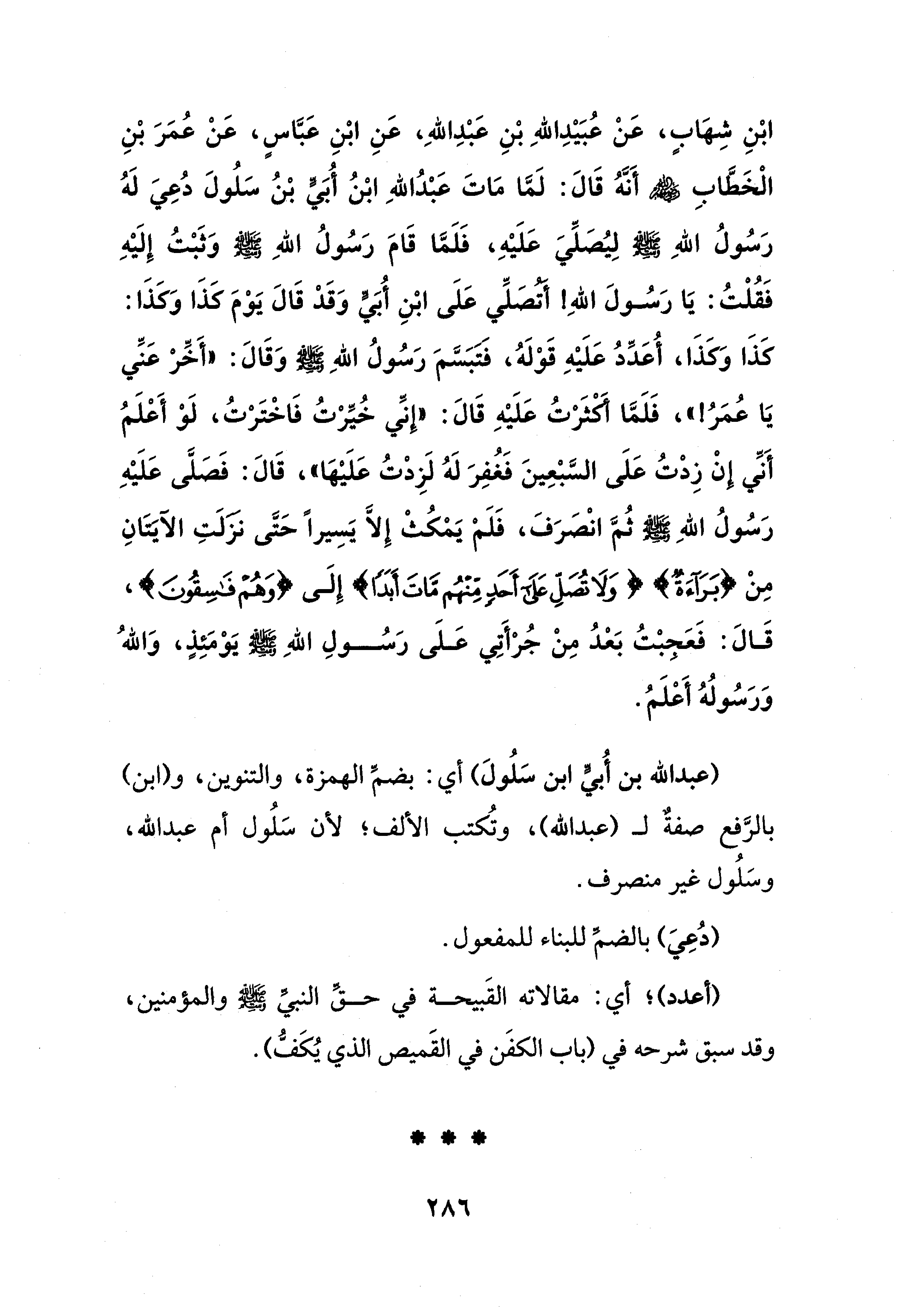 ابْنِ شِهَابٍ، عَنْ عُبَيْدِ اللهِ بْنِ عَبْدِ اللهِ، عَنِ ابْنِ عَبَّاسٍ، عَنْ عُمَرَ بْنِ الْخَطَّابِ - رضي الله عنهم - أَنَّهُ قَالَ: لَمَّا مَاتَ عَبْدُ اللهِ ابْنُ أُبَيٍّ بْنُ سَلُولَ دُعِيَ لَهُ رَسُولُ اللهِ - صلى الله عليه وسلم - لِيُصَلِّيَ عَلَيْهِ، فَلَمَّا قَامَ رَسُولُ اللهِ - صلى الله عليه وسلم - وَثَبْتُ إِلَيْهِ فَقُلْتُ: يَا رَسُولَ اللهِ! أَتُصَلِّي عَلَى ابْنِ أُبَيٍّ وَقَدْ قَالَ يَوْمَ كَذَا وَكَذَا: كَذَا وَكَذَا، أُعَدِّدُ عَلَيْهِ قَوْلَهُ، فَتَبَسَّمَ رَسُولُ اللهِ - صلى الله عليه وسلم - وَقَالَ: "أَخِّرْ عَنِّي يَا عُمَرُ! "، فَلَمَّا أَكْثَرْتُ عَلَيْهِ قَالَ: "إِنِّي خُيِّرْتُ فَاخْتَرْتُ، لَوْ أَعْلَمُ أَنِّي إِنْ زِدْتُ عَلَى السَّبْعِينَ فَغُفِرَ لَهُ لَزِدْتُ عَلَيْهَا"، قَالَ: فَصَلَّى عَلَيْهِ رَسُولُ اللهِ - صلى الله عليه وسلم - ثُمَّ انْصَرَفَ، فَلَمْ يَمْكُثْ إِلَّا يَسِيرًا حَتَّى نَزَلَتِ الآيَتَانِ مِنْ {بَرَآءَةٌ} {وَلَا تُصَلِّ عَلَى أَحَدٍ مِنْهُم مَّاتَ أَبَدًا} إِلَى {وَهُمْ فَسِقُون}، قَالَ: فَعَجبْتُ بَعْدُ مِنْ جُرْأَتِي عَلَى رَسُولِ اللهِ - صلى الله عليه وسلم - يَوْمَئِذٍ، وَاللهُ وَرَسُولُهُ أَعْلَمُ.