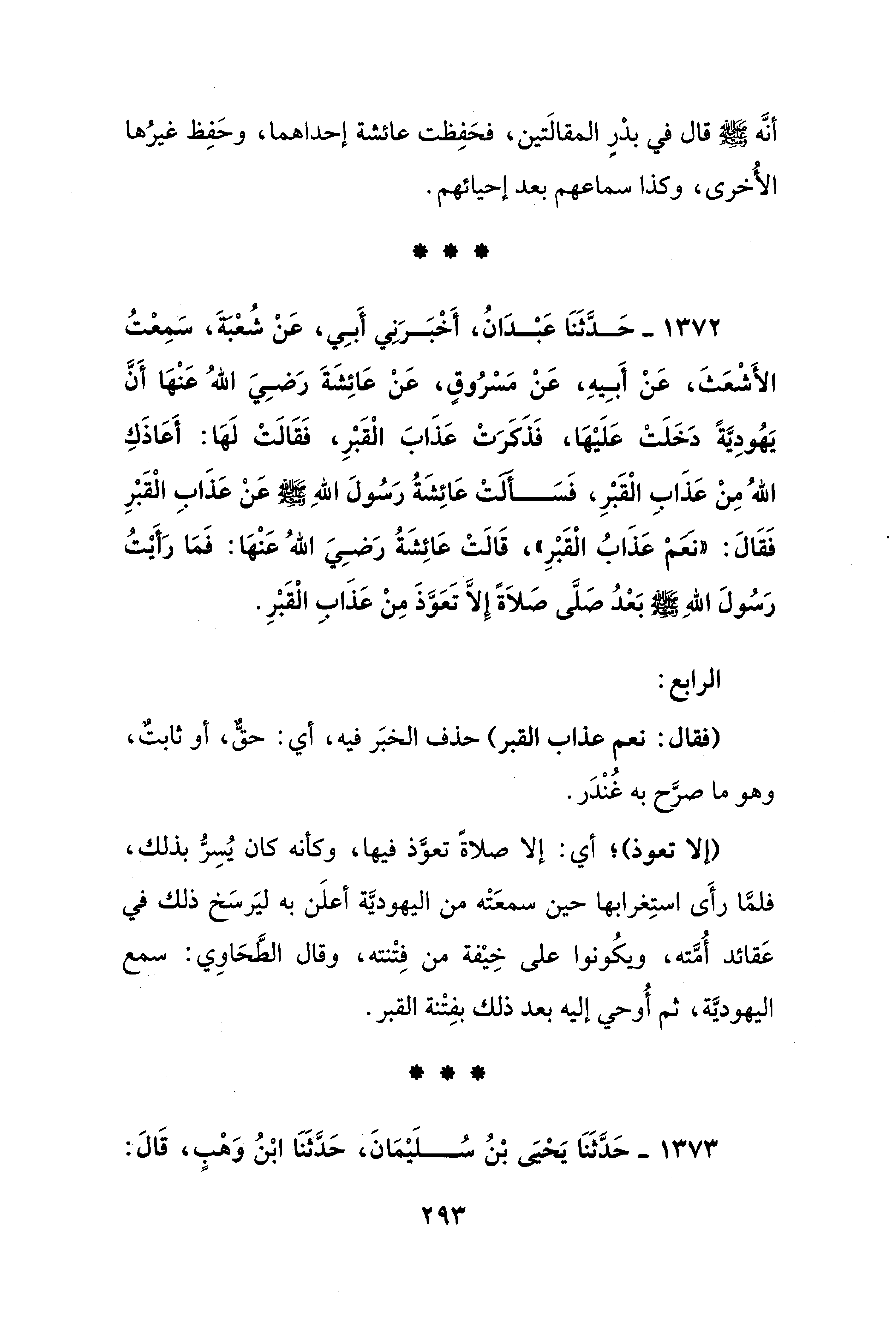 1372 - حَدَّثَنَا عَبْدَانُ، أَخْبَرَنِي أَبِي، عَنْ شُعْبَةَ، سَمِعْتُ الأَشْعَثَ، عَنْ أَبِيهِ، عَنْ مَسْرُوقٍ، عَنْ عَائِشَةَ - رضي الله عنها - أَنَّ يَهُودِيَّةً دَخَلَتْ عَلَيْهَا، فَذَكَرَتْ عَذَابَ الْقَبْرِ، فَقَالَتْ لَهَا: أَعَاذَكِ اللهُ مِنْ عَذَابِ الْقَبْرِ، فَسَأَلَتْ عَائِشَةُ رَسُولَ اللهِ - صلى الله عليه وسلم - عَنْ عَذَابِ الْقَبْرِ فَقَالَ: "نَعَمْ عَذَابُ الْقَبْرِ"، قَالَتْ عَائِشَةُ - رضي الله عنها -: فَمَا رَأَيْتُ رَسُولَ اللهِ - صلى الله عليه وسلم - بَعْدُ صَلَّى صَلاَةً إِلَّا تَعَوَّذَ مِنْ عَذَابِ الْقَبْرِ.