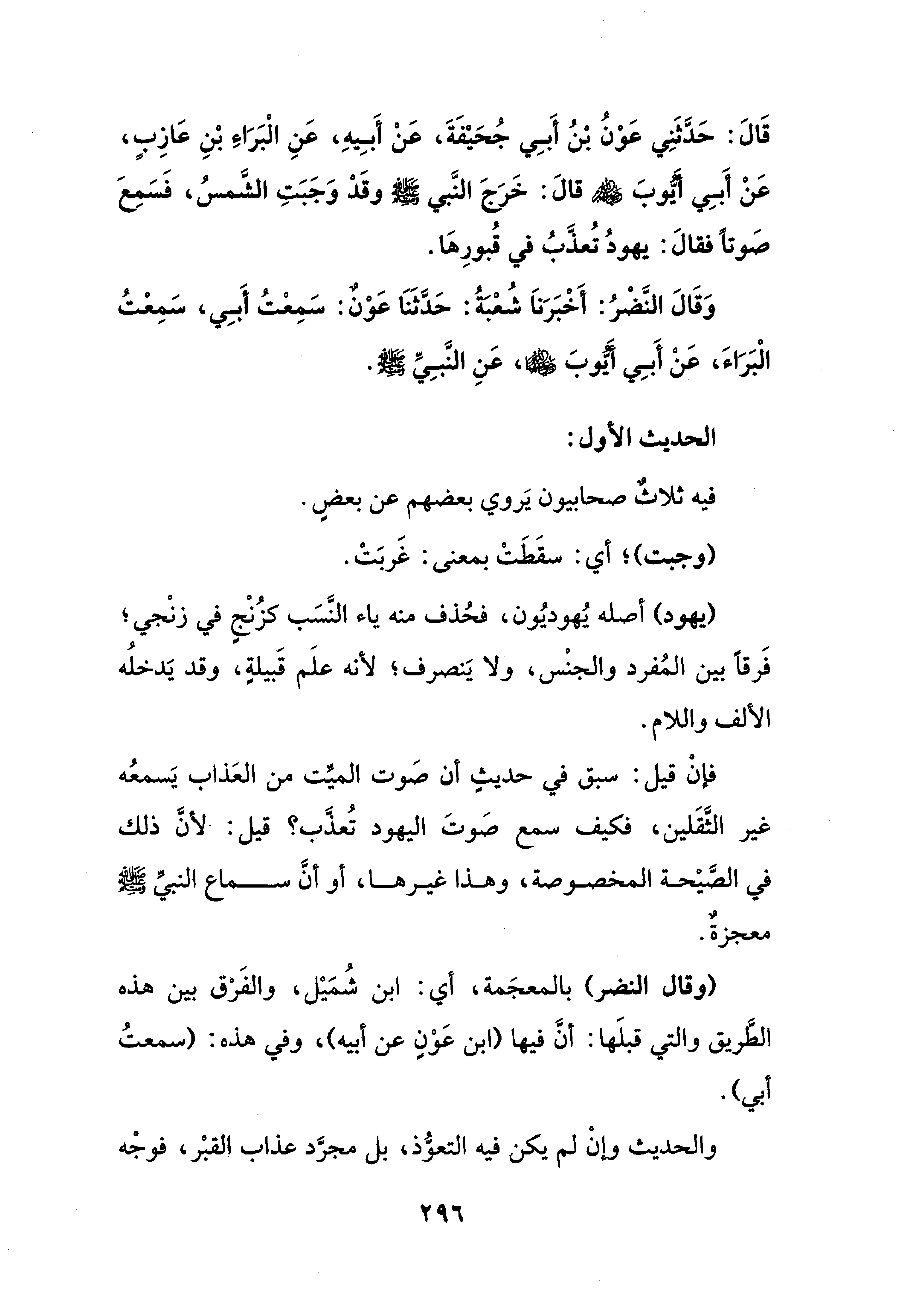 قَالَ: حَدَّثَنِي عَوْنُ بْنُ أَبِي جُحَيْفَةَ، عَنْ أَبِيهِ، عَنِ الْبَرَاءِ بْنِ عَازِبٍ، عَنْ أَبِي أَيُّوبَ - رضي الله عنه - قالَ: خَرَجَ النَّبي - صلى الله عليه وسلم - وقَدْ وَجَبَتِ الشَّمسُ، فَسَمِعَ صَوتًا فقالَ: يهودُ تُعذَّبُ في قُبورِهَا.