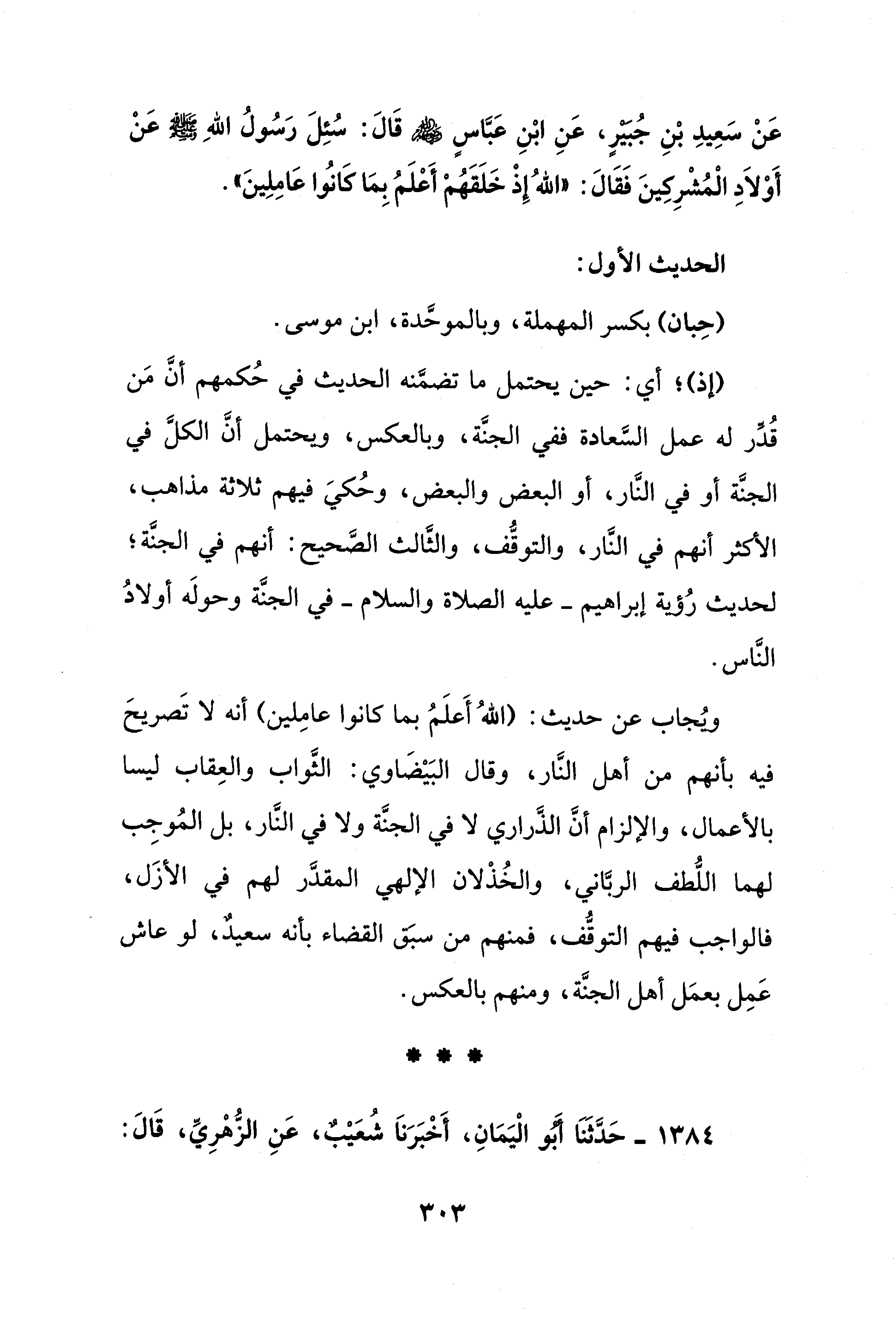 عَنْ سَعِيدِ بْنِ جُبَيْرٍ، عَنِ ابْنِ عَبَّاسٍ - رضي الله عنه - قَالَ: سُئِلَ رَسُولُ اللهِ - صلى الله عليه وسلم - عَنْ أَوْلاَدِ الْمُشْرِكِينَ فَقَالَ: "اللهُ إِذْ خَلَقَهُمْ أَعْلَمُ بِمَا كَانُوا عَامِلِينَ".
