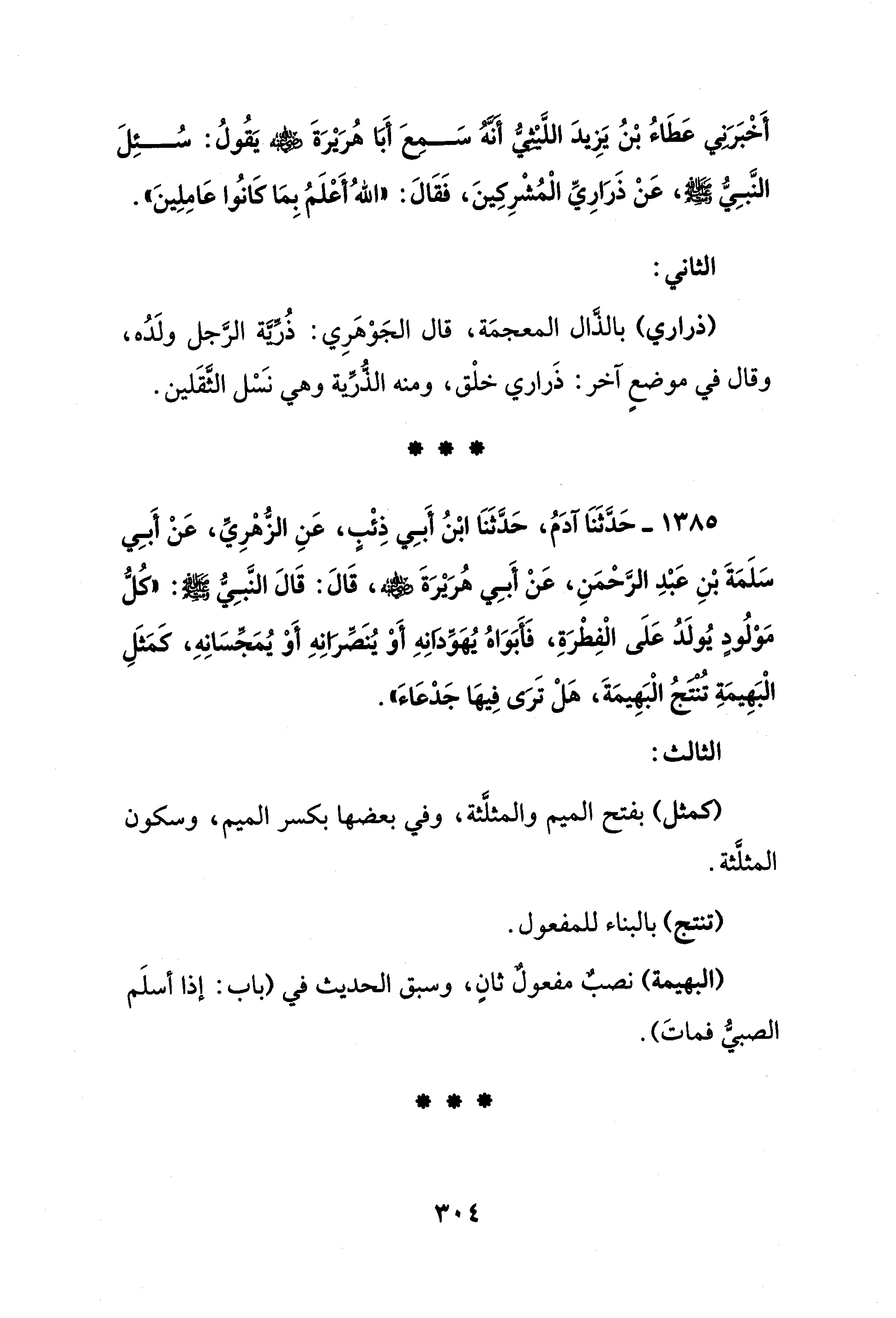 1385 - حَدَّثَنَا آدَمُ، حَدَّثَنَا ابْنُ أَبِي ذِئْبٍ، عَنِ الزُّهْرِيِّ، عَنْ أَبِي سَلَمَةَ بْنِ عَبْدِ الرَّحْمَنِ، عَنْ أَبِي هُرَيْرَةَ - رضي الله عنه -، قَالَ: قَالَ النَّبِيُّ - صلى الله عليه وسلم -: "كُلُّ مَوْلُودٍ يُولَدُ عَلَى الْفِطْرَةِ، فَأَبَوَاهُ يُهَوِّدَانِهِ أَوْ يُنَصِّرَانِهِ أَوْ يُمَجِّسَانِهِ، كمَثَلِ الْبَهِيمَةِ تُنْتَجُ الْبَهِيمَةَ، هَلْ تَرَى فِيهَا جَدْعَاءَ".