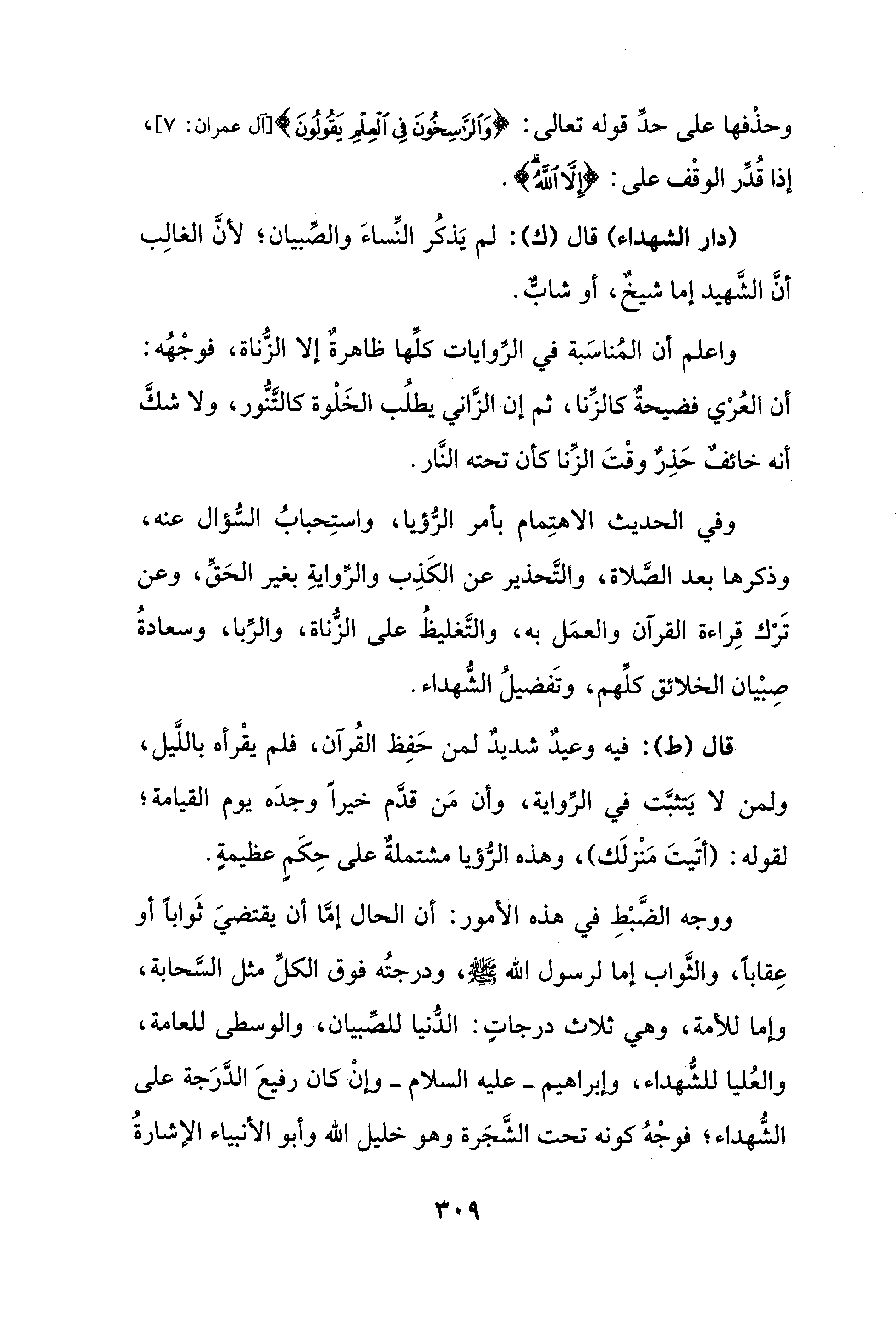 ووجه الضَّبْطِ في هذه الأمور: أن الحال إمَّا أن يقتضيَ ثَوابًا أو عِقابًا، والثَّواب إما لرسول الله - صلى الله عليه وسلم -، ودرجتُه فوق الكلِّ مثل السَّحابة، وإما للأمة، وهي ثلاث درجاتٍ: الدُّنيا للصِّبيان، والوسطى للعامة، والعُليا للشُّهداء، وإبراهيم - عليه السلام - وإنْ كان رفيعَ الدَّرَجة على الشُّهداء؛ فوجْهُ كونه تحت الشَّجَرة وهو خليل الله وأبو الأنبياء الإشارةُ