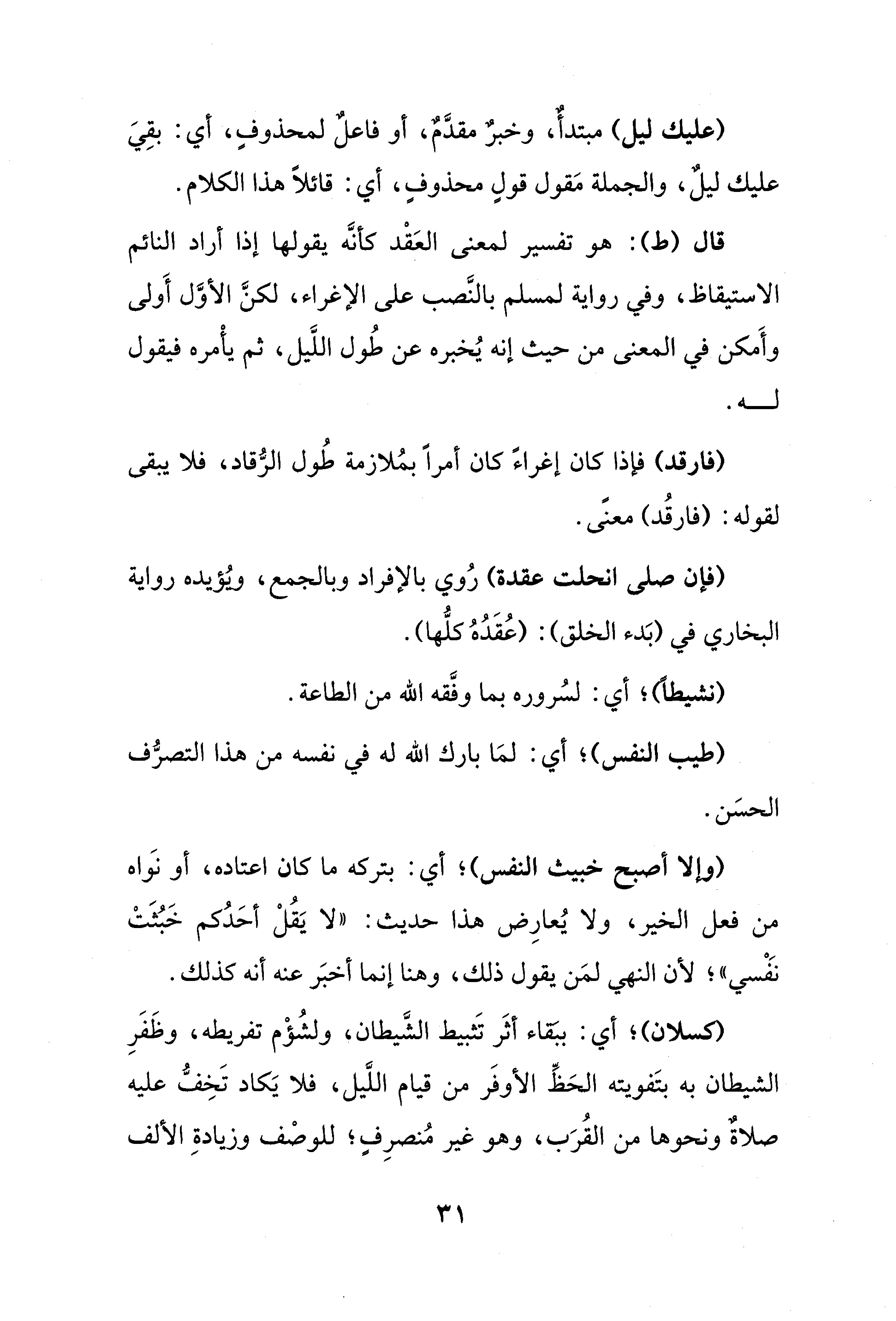 قال (ط): هو تفسير لمعنى العَقْد كأنَّه يقولها إذا أراد النائم الاستيقاظ، وفي رواية لمسلم بالنَّصب على الإغراء، لكنَّ الأوَّل أَولى وأَمكن في المعنى من حيث إنه يُخبره عن طُول اللَّيل، ثم يأمره فيقول له.