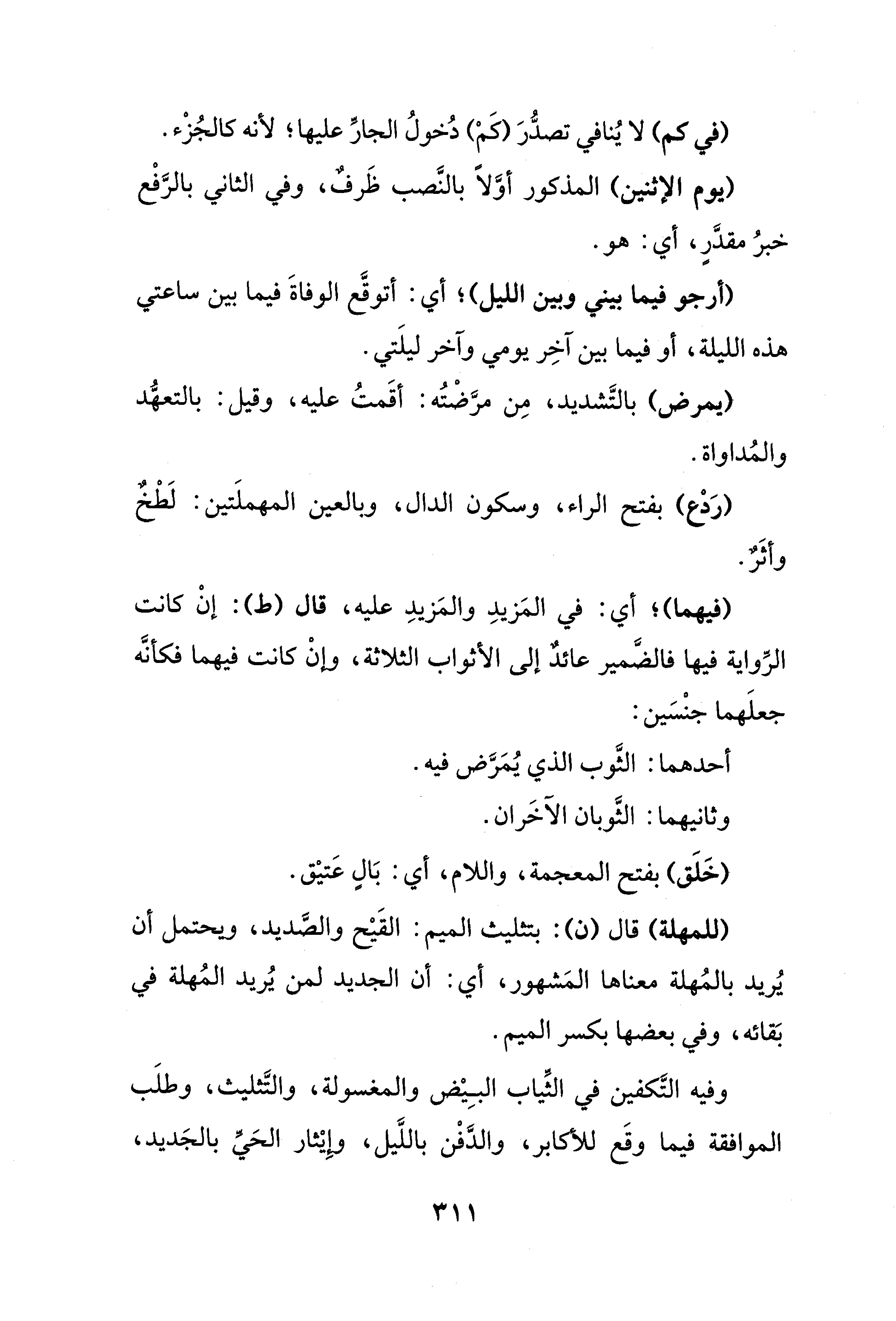 وفيه التَّكفين في الثِّياب البِيْض والمغسولة، والتَّثليث، وطلَب الموافقة فيما وقَع للأكابر، والدَّفْن باللَّيل، وإِيْثار الحَيِّ بالجَديد،