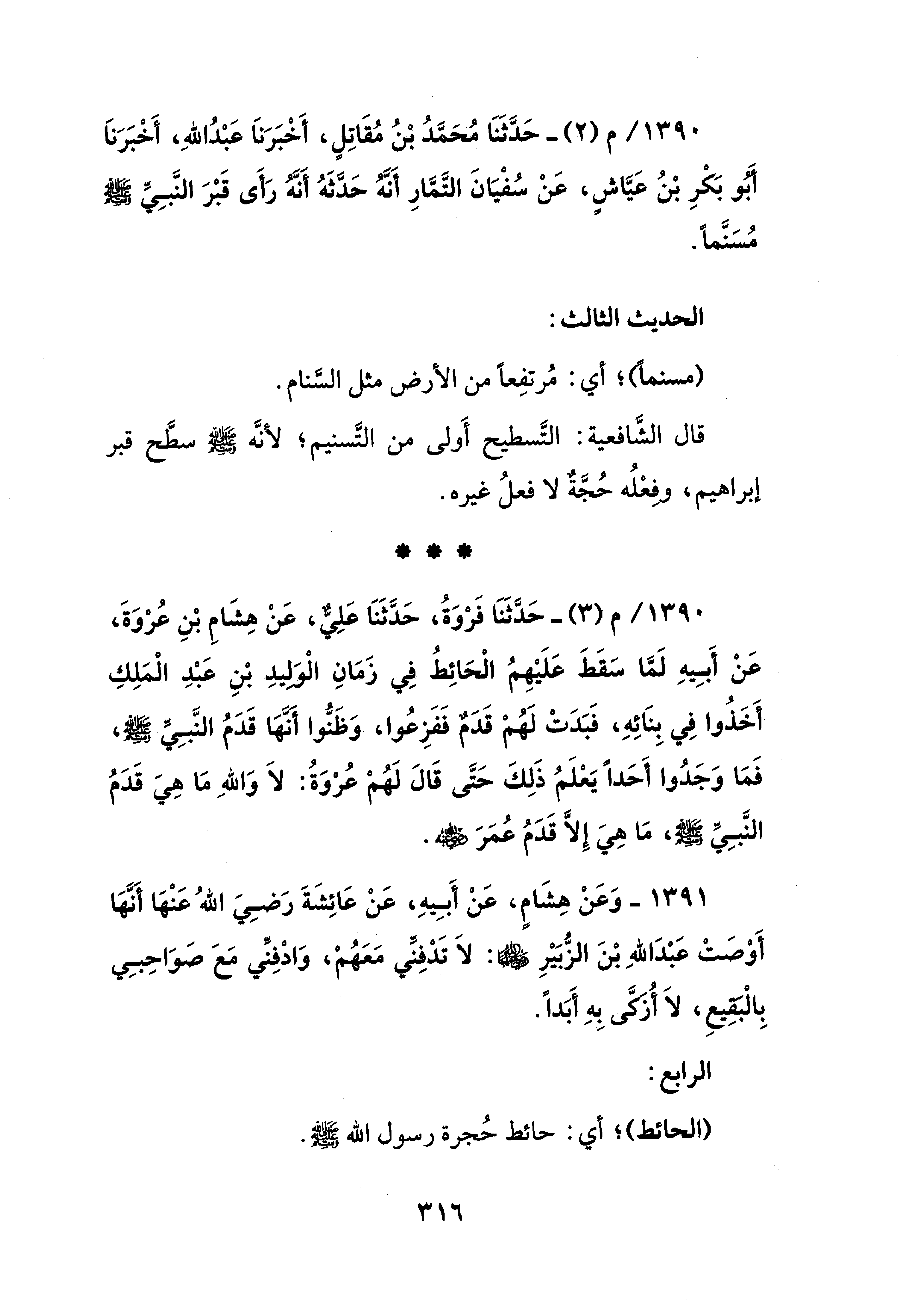 1390 / -م (2) - حَدَّثَنَا مُحَمَّدُ بْنُ مُقَاتِلٍ، أَخْبَرَناَ عَبْدُ اللهِ، أَخْبَرَناَ أَبُو بَكْرِ بْنُ عَيَّاشٍ، عَنْ سُفْيَانَ التَّمَّارِ أَنَّهُ حَدَّثَهُ أَنَّهُ رَأَى قَبْرَ النَّبِيِّ - صلى الله عليه وسلم - مُسَنَّمًا.