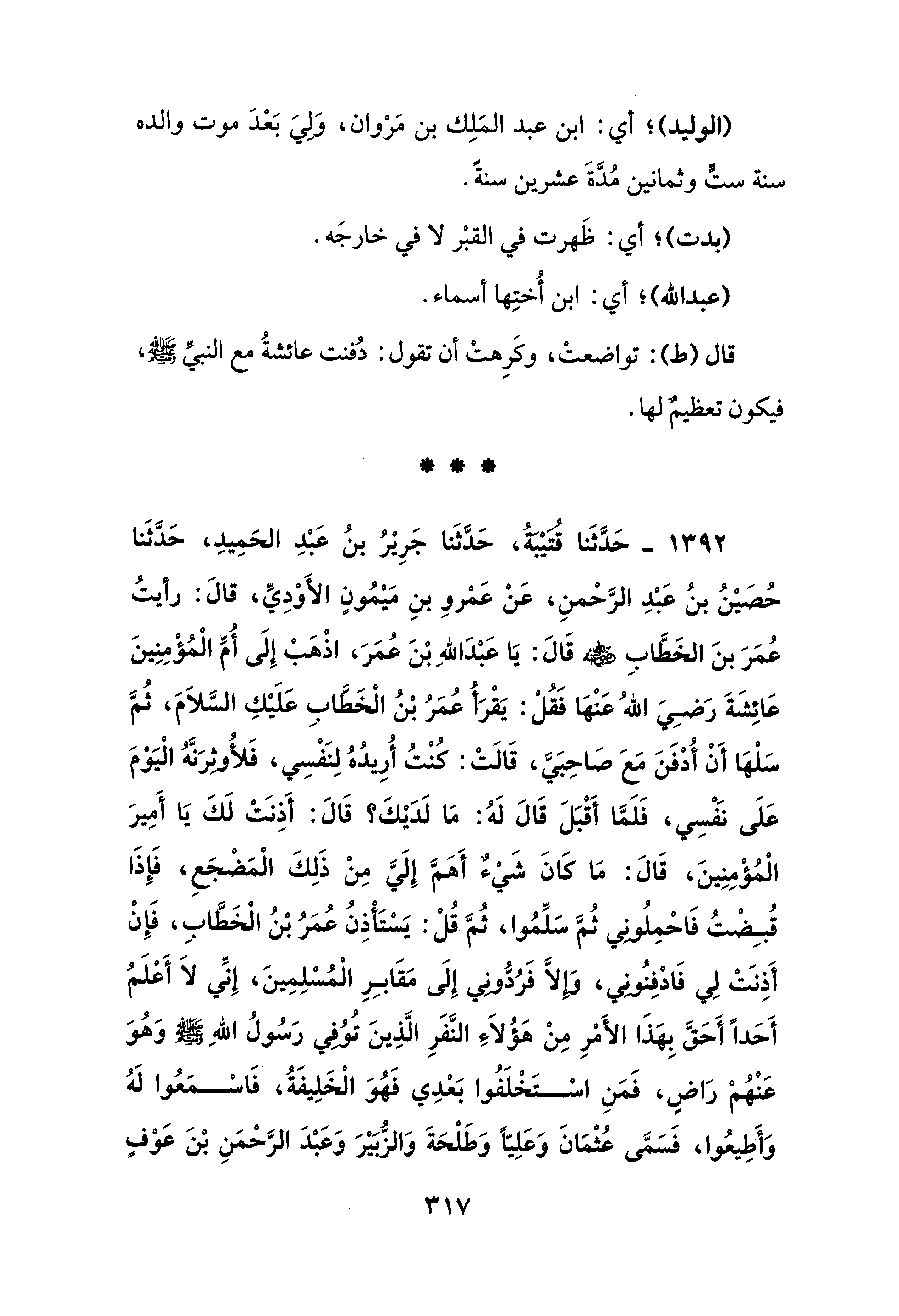 1392 - حَدَّثَنا قُتَيْبَةُ، حَدَّثَنا جَرِيْرُ بنُ عَبْدِ الحَمِيدِ، حَدَّثَنا حُصَيْنُ بنُ عَبْدِ الرَّحْمنِ، عَنْ عَمْروِ بنِ مَيْمُونٍ الأَوْدِيِّ، قالَ: رأيتُ عُمَرَ بنَ الخَطَّابِ - رضي الله عنه - قَالَ: يَا عَبْدَ اللهِ بْنَ عُمَرَ، اذْهَبْ إِلَى أُمِّ الْمُؤْمِنِينَ عَائِشَةَ - رضي الله عنها - فَقُلْ: يَقْرَأُ عُمَرُ بْنُ الْخَطَّابِ عَلَيْكِ السَّلاَمَ، ثُمَّ سَلْهَا أَنْ أُدْفَنَ مَعَ صَاحِبَيَّ، قَالَتْ: كُنْتُ أُرِيدُهُ لِنَفْسِي، فَلأُوثِرَنَّهُ الْيَوْمَ عَلَى نَفْسِي، فَلَمَّا أَقْبَلَ قَالَ لَهُ: مَا لَدَيْكَ؟ قَالَ: أَذِنَتْ لَكَ يَا أَمِيرَ الْمُؤْمِنِينَ، قَالَ: مَا كَانَ شَيْءٌ أَهَمَّ إِلَيَّ مِنْ ذَلِكَ الْمَضْجَعِ، فَإِذَا قُبِضْتُ فَاحْمِلُونِي ثُمَّ سَلِّمُوا، ثُمَّ قُلْ: يَسْتَأْذِنُ عُمَرُ بْنُ الْخَطَّابِ، فَإِنْ أَذِنَتْ لِي فَادْفِنُونِي، وإِلَّا فَرُدُّونِي إِلَى مَقَابِرِ الْمُسْلِمِينَ، إِنِّي لاَ أَعْلَمُ أَحَدًا أَحَقَّ بِهَذَا الأَمْرِ مِنْ هَؤُلاَءِ النَّفَرِ الَّذِينَ تُوُفِي رَسُولُ اللهِ - صلى الله عليه وسلم - وَهُوَ عَنْهُمْ رَاضٍ، فَمَنِ اسْتَخْلَفُوا بَعْدِي فَهُوَ الْخَلِيفَةُ، فَاسْمَعُوا لَهُ وَأَطِيعُوا، فَسَمَّى عُثْمَانَ وَعَلِيًّا وَطَلْحَةَ وَالزُّبَيْرَ وَعَبْدَ الرَّحْمَنِ بْنَ عَوْفٍ