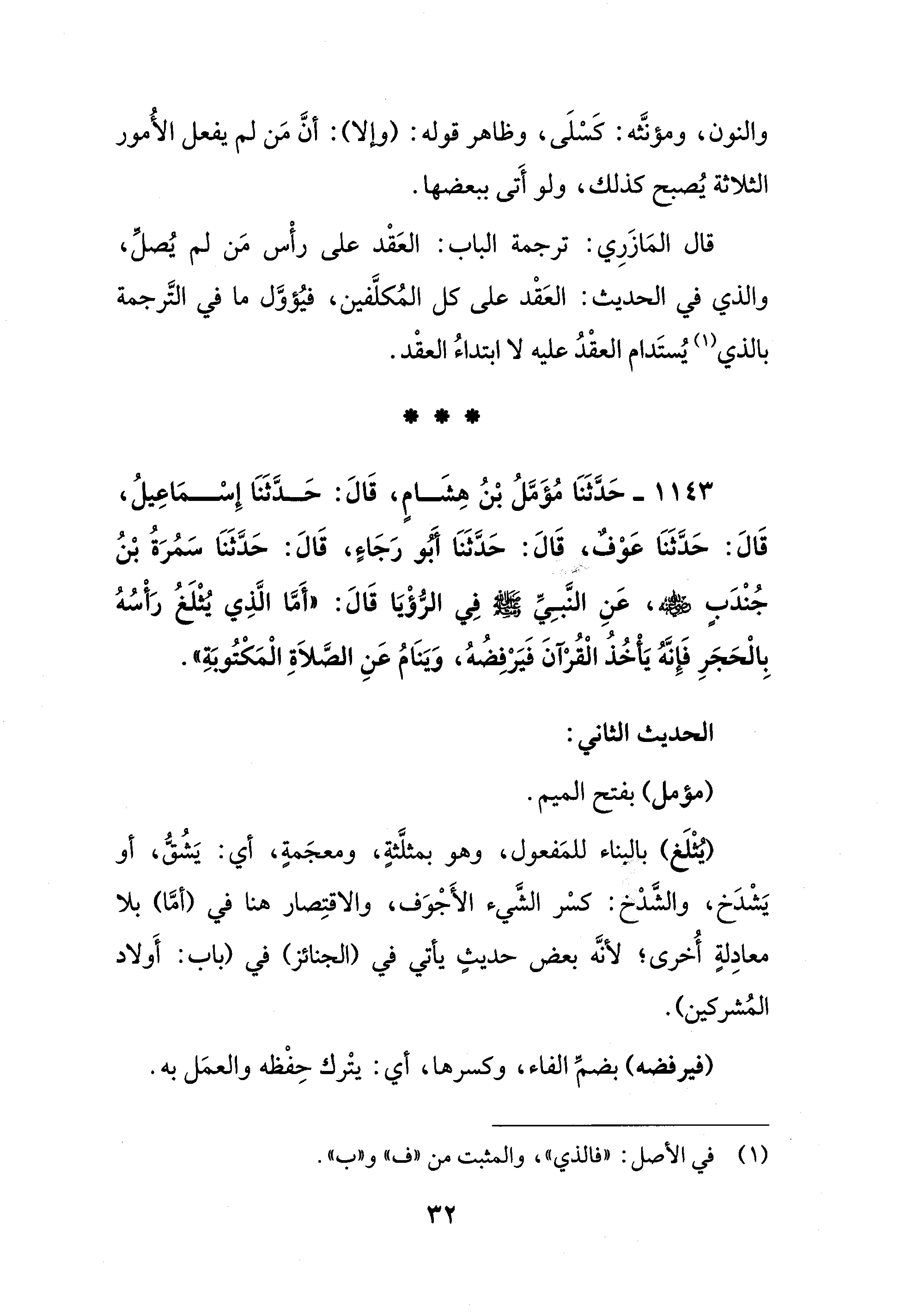 1143 - حَدَّثَنَا مُؤَمَّلُ بْنُ هِشَامٍ، قَالَ: حَدَّثَنَا إِسْمَاعِيلُ، قَالَ: حَدَّثَنَا عَوْفٌ، قَالَ: حَدَّثَنَا أَبُو رَجَاءً، قَالَ: حَدَّثَنَا سَمُرَةُ بْنُ جُنْدَبٍ - رضي الله عنه -، عَنِ النَّبِيِّ فِي الرُّؤْيَا قَالَ: "أَمَّا الَّذِي يثلَغُ رَأْسُهُ بِالْحَجَرِ فَإِنَّهُ يَأْخُذُ الْقُرْآنَ فَيَرْفِضُهُ، وَيَنَامُ عَنِ الصَّلاَةِ الْمَكْتُوبَةِ".