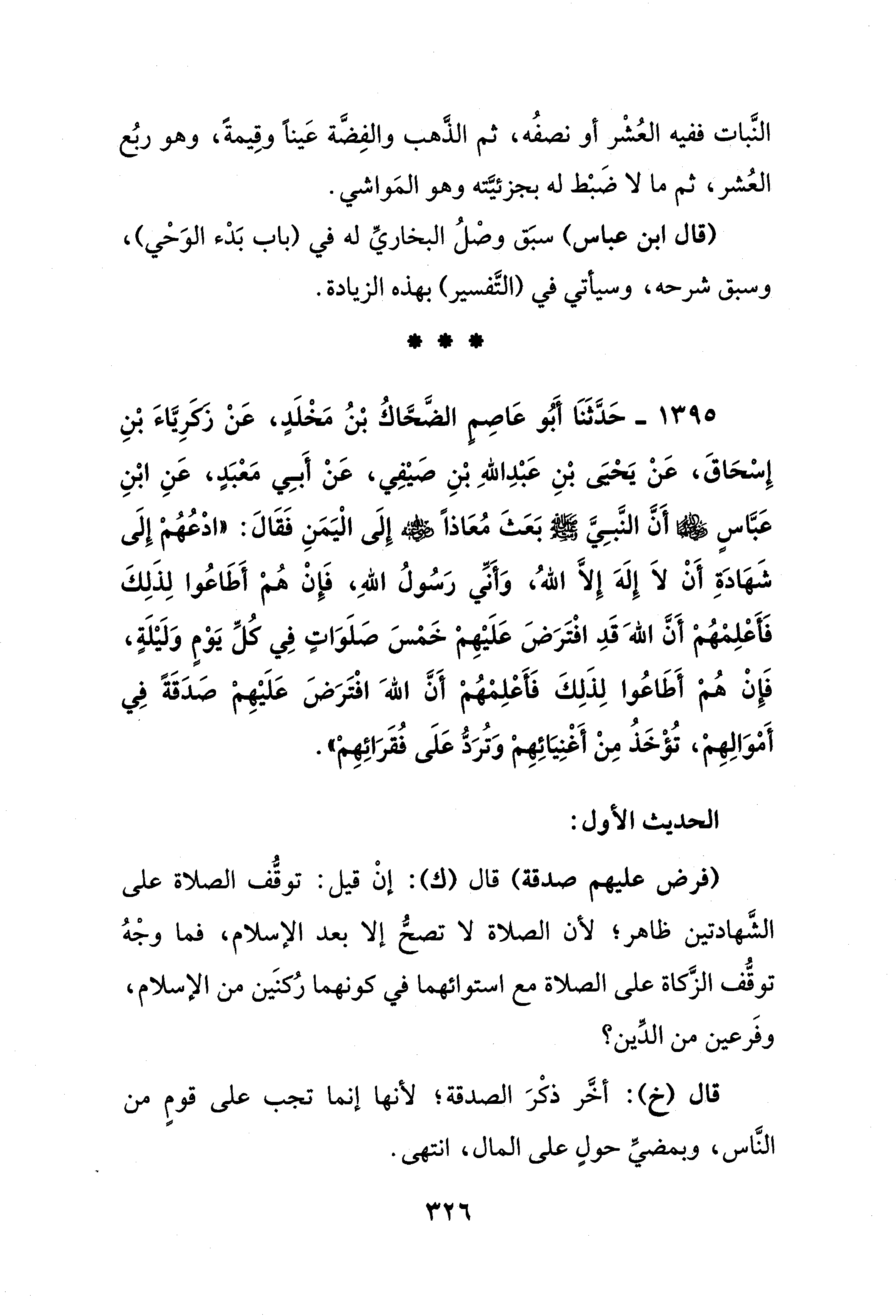 1395 - حَدَّثَنَا أَبُو عَاصِمٍ الضَّحَّاكُ بْنُ مَخْلَدٍ، عَنْ زَكَرِيَّاءَ بْنِ إِسْحَاقَ، عَنْ يَحْيَى بْنِ عَبْدِ اللهِ بْنِ صيْفِي، عَنْ أَبِي مَعْبَدٍ، عَنِ ابْنِ عَبَّاسٍ - رضي الله عنهما - أَنَّ النَّبِيَّ - صلى الله عليه وسلم - بَعَثَ مُعَاذًا - رضي الله عنه - إِلَى الْيَمَنِ فَقَالَ: "ادْعُهُمْ إِلَى شَهَادَةِ أَنْ لاَ إِلَهَ إلَّا اللهُ، وَأنِّي رَسُولُ اللهِ، فَإِنْ هُمْ أَطَاعُوا لِذَلِكَ فَأَعْلِمْهُمْ أَنَّ اللهَ قَدِ افْتَرَضَ عَلَيْهِمْ خَمْسَ صَلَوَاتٍ فِي كُلِّ يَوْمٍ وَلَيْلَةٍ، فَإِنْ هُمْ أَطَاعُوا لِذَلِكَ فَأَعْلِمْهُمْ أَنَّ اللهَ افْتَرَضَ عَلَيْهِمْ صَدَقَةً فِي أَمْوَالِهِمْ، تُؤْخَذُ مِنْ أَغْنِيَائِهِمْ وَتُرَدُّ عَلَى فُقَرَائِهِمْ".