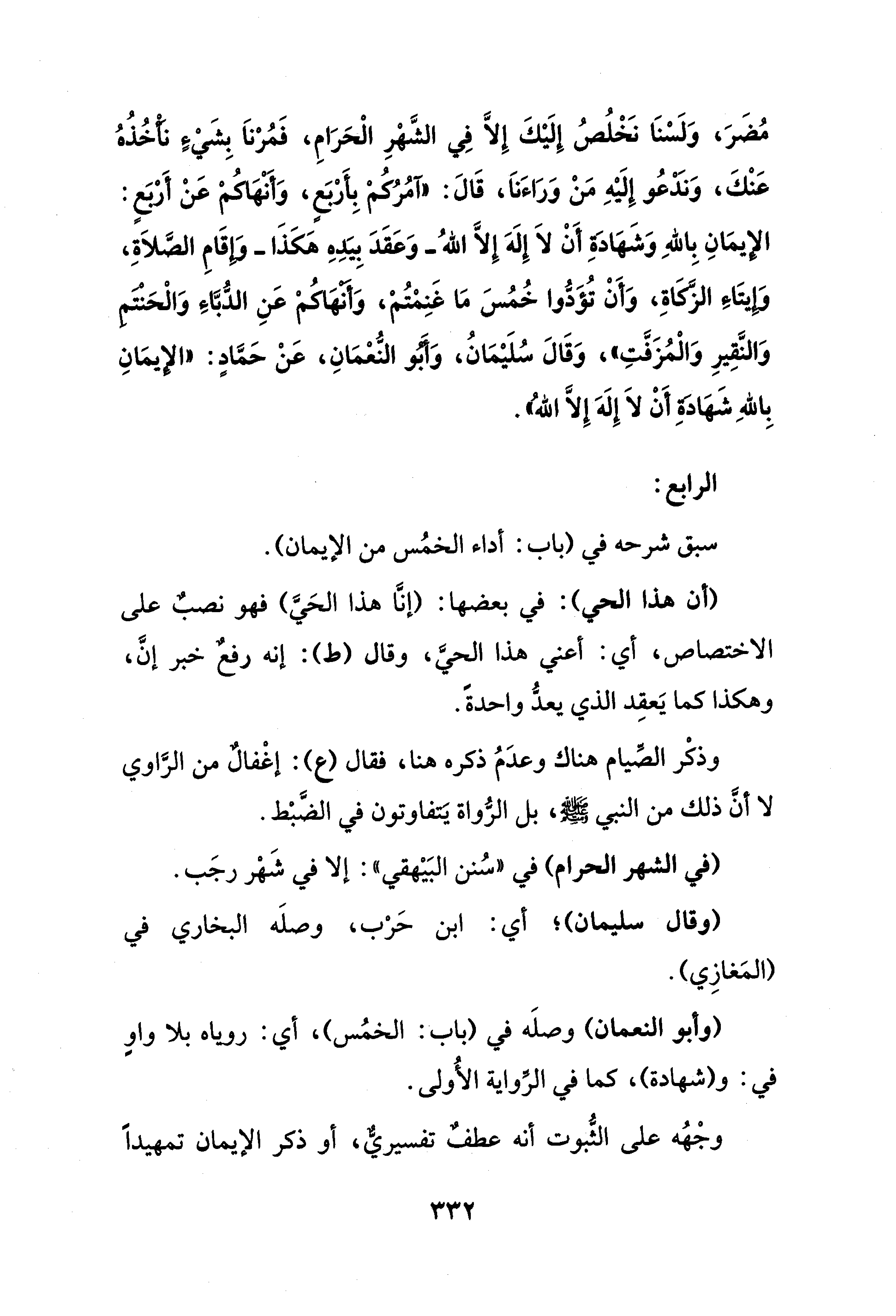 مُضَرَ، وَلَسْنَا نخلُصُ إِلَيْكَ إِلَّا فِي الشَّهْرِ الْحَرَامِ، فَمُرْناَ بِشَيْءٍ نأْخُذُهُ عَنْكَ، وَنَدْعُو إِلَيْهِ مَنْ وَرَاءَناَ، قَالَ: "آمُرُكُمْ بِأَرْبَعٍ، وَأنهَكمْ عَنْ أَرْبَعٍ: الإيمَانِ بِاللهِ وَشَهَادَةِ أَنْ لاَ إِلَهَ إِلَّا اللهُ -وَعَقَدَ بِيَدِهِ هَكَذَا- وَإِقَامِ الصَّلاَةِ، وَإِيتَاءِ الزكَّاَةِ، وَأَنْ تُؤَدُّوا خُمُسَ مَا غَنِمْتُمْ، وَأنهَاكُمْ عَنِ الدُّبَّاءَ وَالْحَنْتَمِ وَالنَّقِيرِ وَالْمُزَفَّتِ"، وَقَالَ سُلَيْمَانُ، وَأَبُو النُّعْمَانِ، عَنْ حَمَّادٍ: "الإِيمَانِ بِاللهِ شَهَادَةِ أَنْ لاَ إِلَهَ إِلَّا اللهُ".