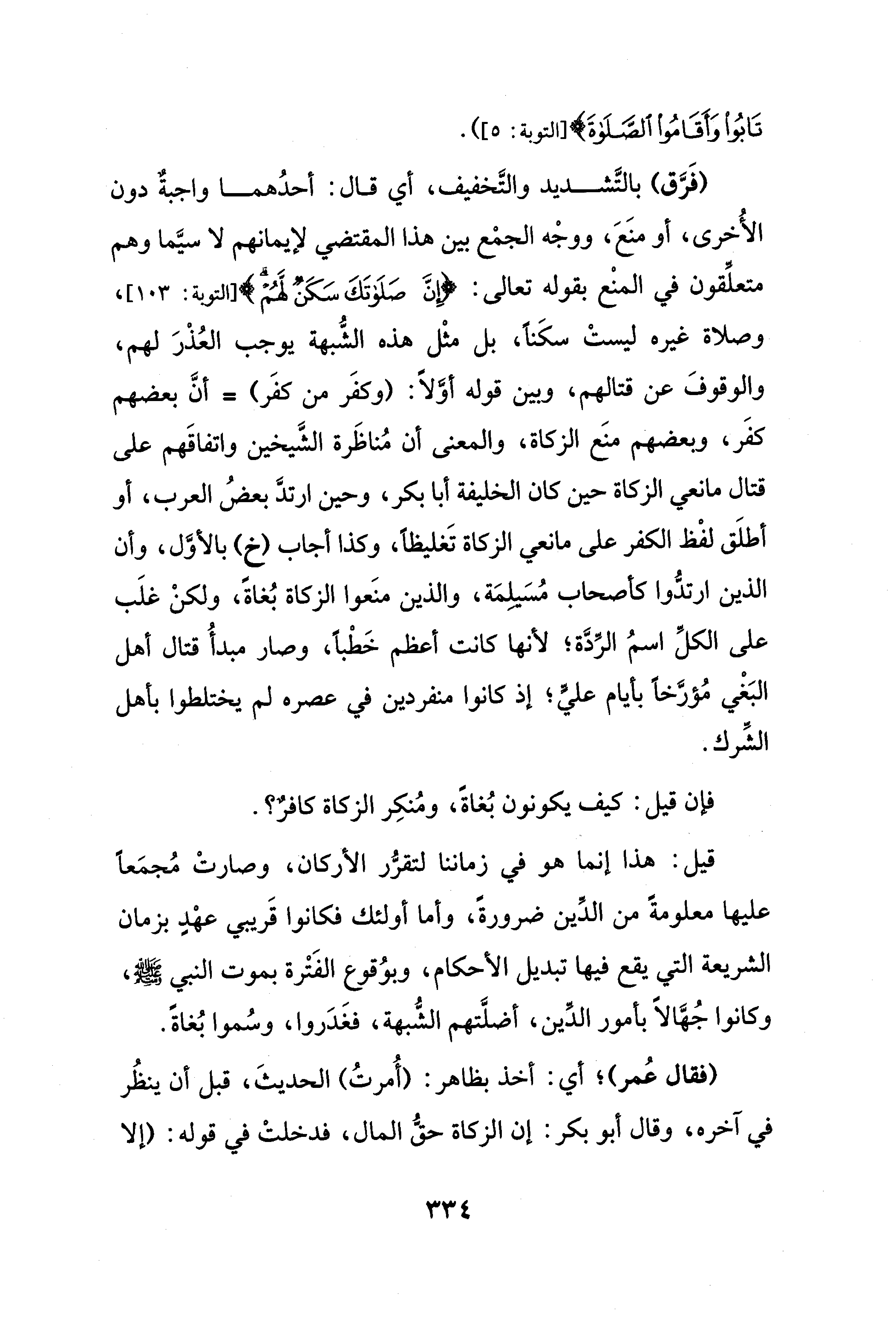 (فَرَّق) بالتَّشديد والتَّخفيف، أي قال: أحدُهما واجبةٌ دون الأُخرى، أو منَعَ، ووجْه الجمْع بين هذا المقتضي لإيمانهم لا سيَّما وهم متعلِّقون في المنْع بقوله تعالى: {إِنَّ صَلَاتَكَ سَكَنٌ لَهُمْ} [التوبة: 103]، وصلاة غيره ليستْ سكَنًا، بل مثْل هذه الشُّبهة يوجب العُذْرَ لهم، والوقوفَ عن قتالهم، وبين قوله أوَّلًا: (وكفَر من كفَر) = أنَّ بعضهم كفَر، وبعضهم منع الزكاة، والمعنى أن مُناظَرة الشَّيخين واتفاقَهم على قتال مانعي الزكاة حين كان الخليفة أبا بكر، وحين ارتدَّ بعضُ العرب، أو أطلَق لفْظ الكفر على مانعي الزكاة تَغليظًا، وكذا أجاب (خ) بالأوَّل، وأن الذين ارتدُّوا كأصحاب مُسَيلِمَة، والذين منَعوا الزكاة بُغاةً، ولكنْ غلَب على الكلِّ اسمُ الرِّدَّة؛ لأنها كانت أعظم خَطْبًا، وصار مبدأُ قتال أهل البَغْي مُؤرَّخًا بأيام عليٍّ؛ إذ كانوا منفردين في عصره لم يختلطوا بأهل الشِّرك.