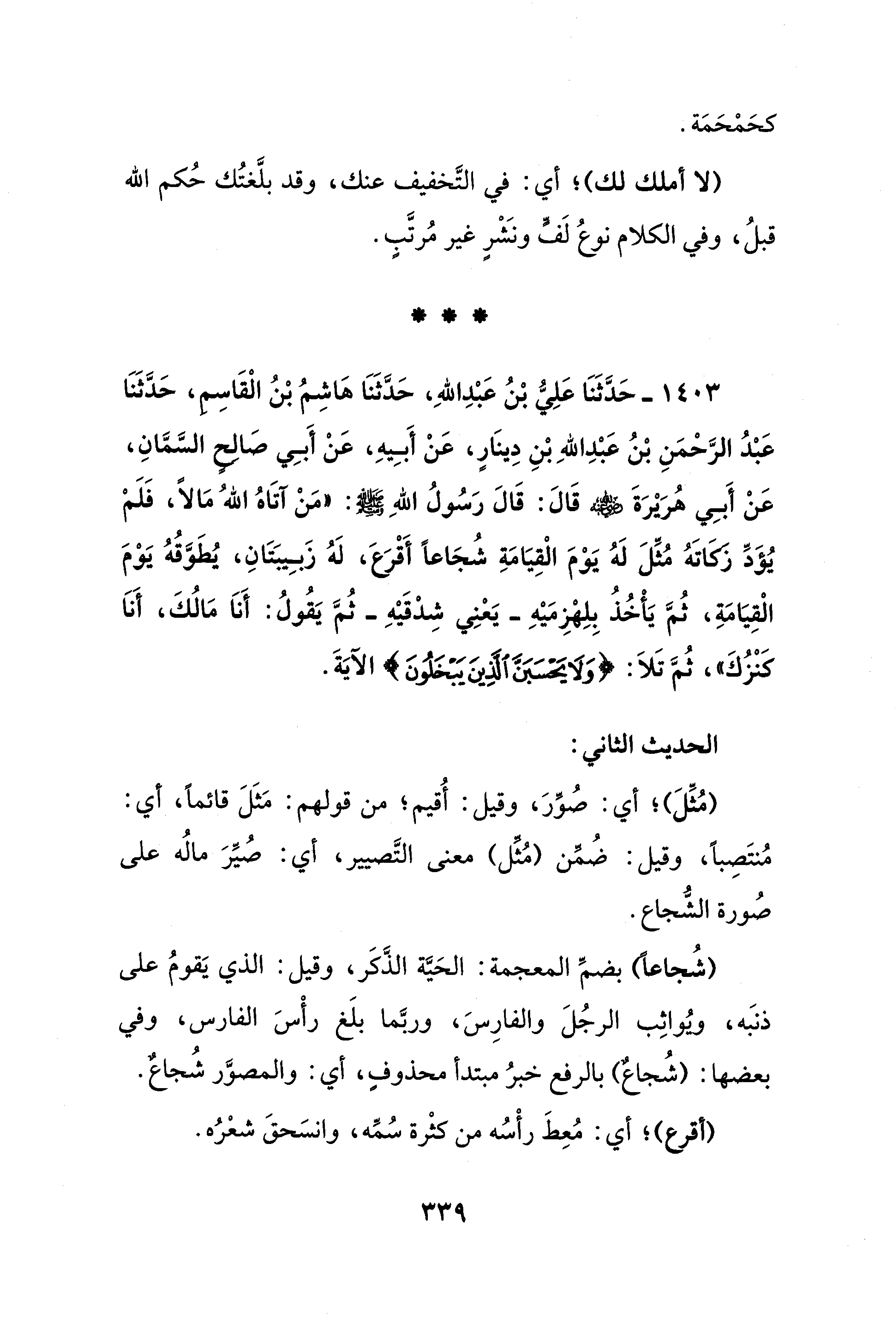 1403 - حَدَّثَنَا عَلِيُّ بْنُ عَبْدِ اللهِ، حَدَّثَنَا هَاشِمُ بْنُ الْقَاسِمِ، حَدَّثَنَا عَبْدُ الرَّحْمَنِ بْنُ عَبْدِ اللهِ بْنِ دِينَارٍ، عَنْ أَبِيهِ، عَنْ أَبِي صَالِحٍ السَّمَّانِ، عَنْ أَبِي هُرَيْرَةَ - رضي الله عنه - قَالَ: قَالَ رَسُولُ اللهِ - صلى الله عليه وسلم -: "مَنْ آتَاهُ اللهُ مَالًا، فَلَمْ يُؤَدِّ زَكَاتَهُ مُثِّلَ لَهُ يَوْمَ الْقِيَامَةِ شُجَاعًا أَقْرَعَ، لَهُ زَبِيبَتَانِ، يُطَوَّقُهُ يَوْمَ الْقِيَامَةِ، ثُمَّ يَأْخُذُ بِلِهْزِمَيْهِ -يَعْنِي شِدْقَيْهِ- ثُمَّ يَقُولُ: أَناَ مَالُكَ، أَناَ كَنْزُكَ"، ثُمَّ تَلاَ: {وَلَا يَحْسَبَنَّ الَّذِينَ يَبْخَلُونَ} الآيَةَ.