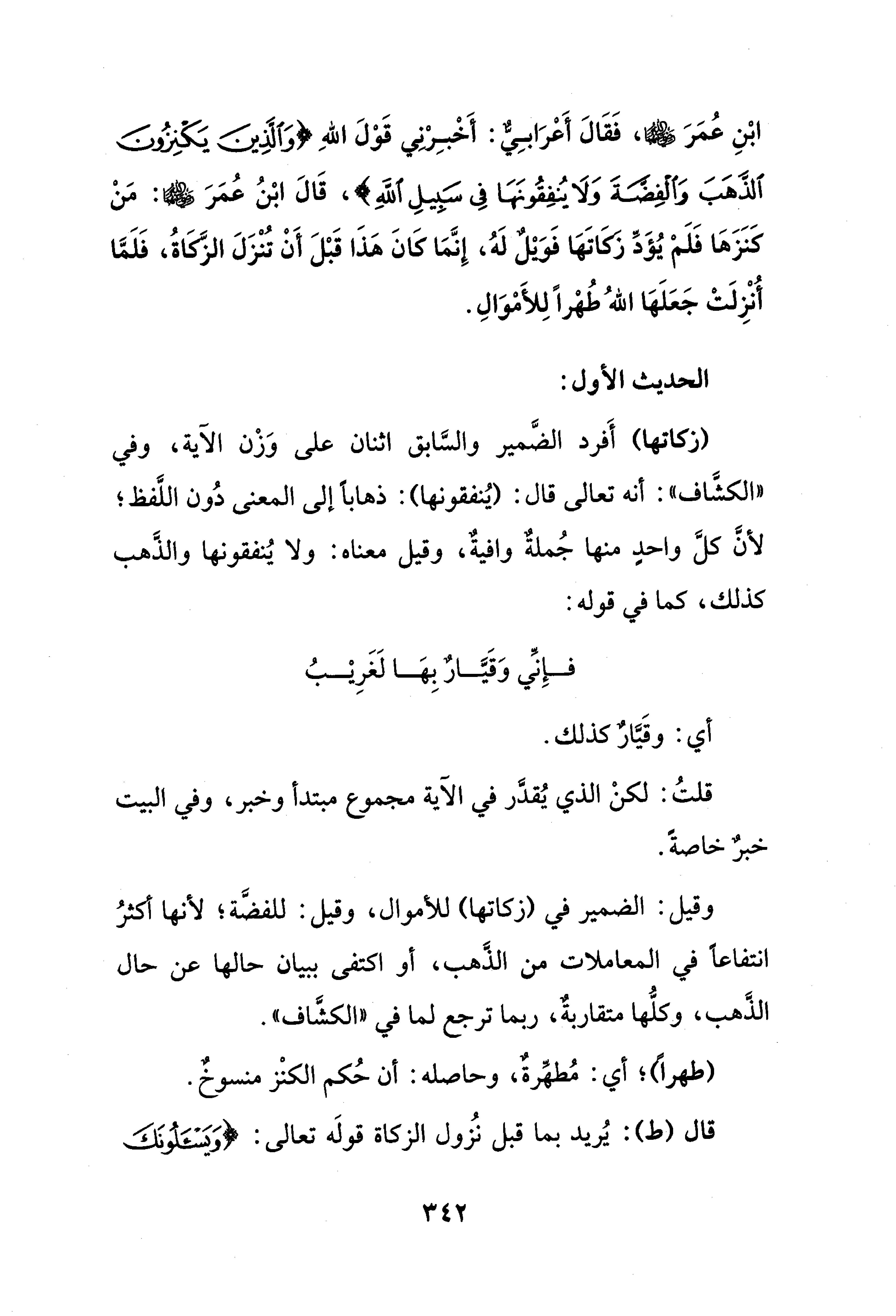 ابْنِ عُمَرَ - رضي الله عنهما -، فَقَالَ أَعْرَابِيٌّ: أَخْبِرْني قَوْلَ اللهِ {وَالَّذِينَ يَكْنِزُونَ الذَّهَبَ وَالْفِضَّةَ وَلَا يُنْفِقُونَهَا فِي سَبِيلِ اللَّهِ} قَالَ ابْنُ عُمَرَ - رضي الله عنهما -: مَنْ كَنَزَهَا فَلَمْ يُؤَدِّ زَكَاتَهَا فَويلٌ لَهُ، إِنَّمَا كَانَ هَذَا قَبْلَ أَنْ تُنْزَلَ الزَّكَاةُ، فَلَمَّا أُنْزِلَتْ جَعَلَهَا اللهُ طُهْرًا لِلأَمْوَالِ.