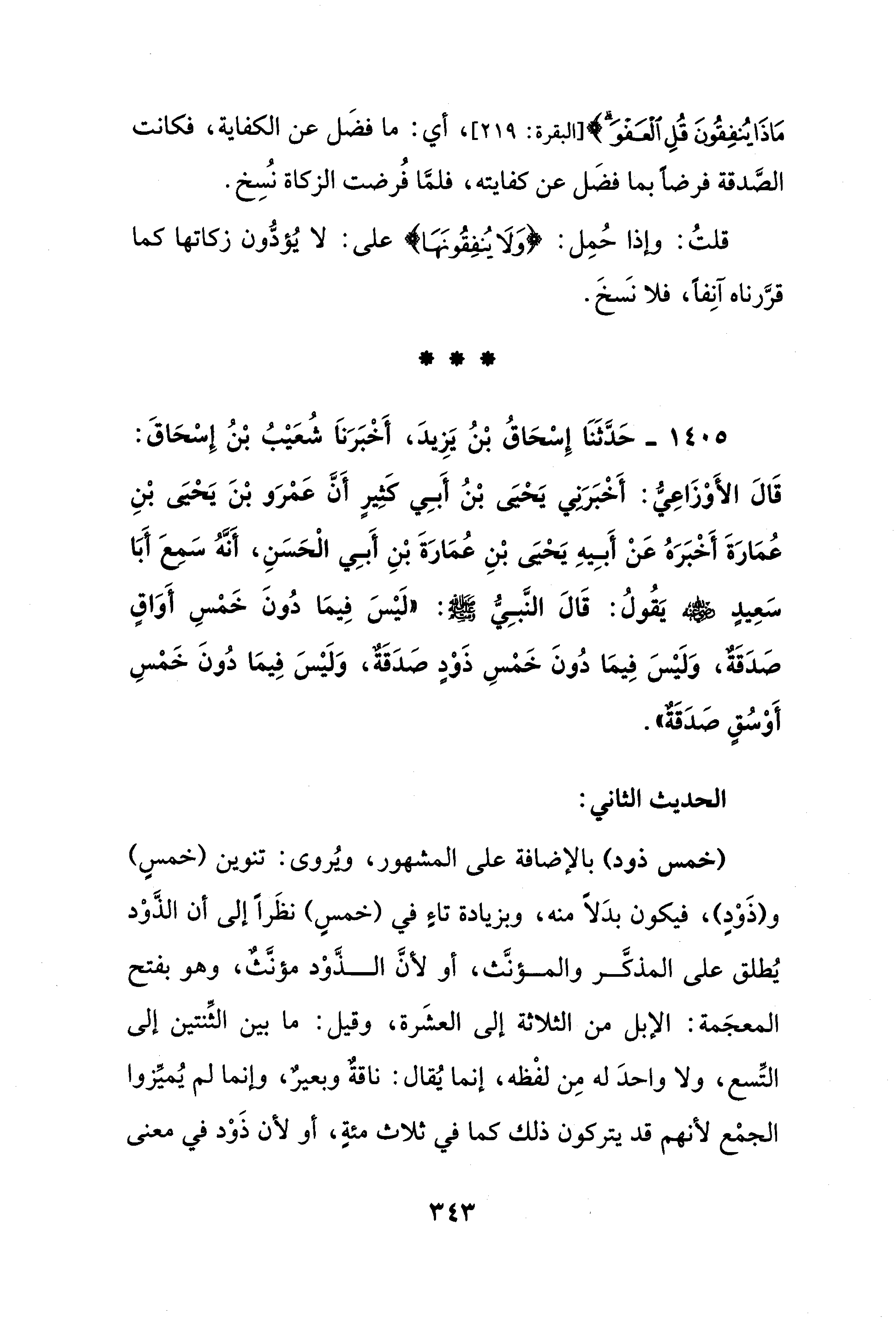 1405 - حَدَّثَنَا إِسْحَاقُ بْنُ يَزِيدَ، أَخْبَرَناَ شُعَيْبُ بْنُ إسْحَاقَ: قَالَ الأَوْزَاعِيُّ: أَخْبَرَنِي يَحْيَى بْنُ أَبِي كَثِيرٍ أَنَّ عَمْرَو بْنَ يَحْيَى بْنِ عُمَارَةَ أَخْبَرَهُ عَنْ أَبِيهِ يَحْيَى بْنِ عُمَارَةَ بْنِ أَبِي الْحَسَنِ، أَنَّهُ سَمعَ أَبَا سَعِيدٍ - رضي الله عنه - يَقُولُ: قَالَ النَّبِيُّ - صلى الله عليه وسلم -: "لَيْسَ فِيمَا دُونَ خَمْسِ أَوَاقٍ صَدَقَةٌ، وَلَيْسَ فِيمَا دُونَ خَمْسِ ذَوْدٍ صَدَقَةٌ، وَلَيْسَ فِيمَا دُونَ خَمْسِ أَوْسُقٍ صَدَقَةٌ".