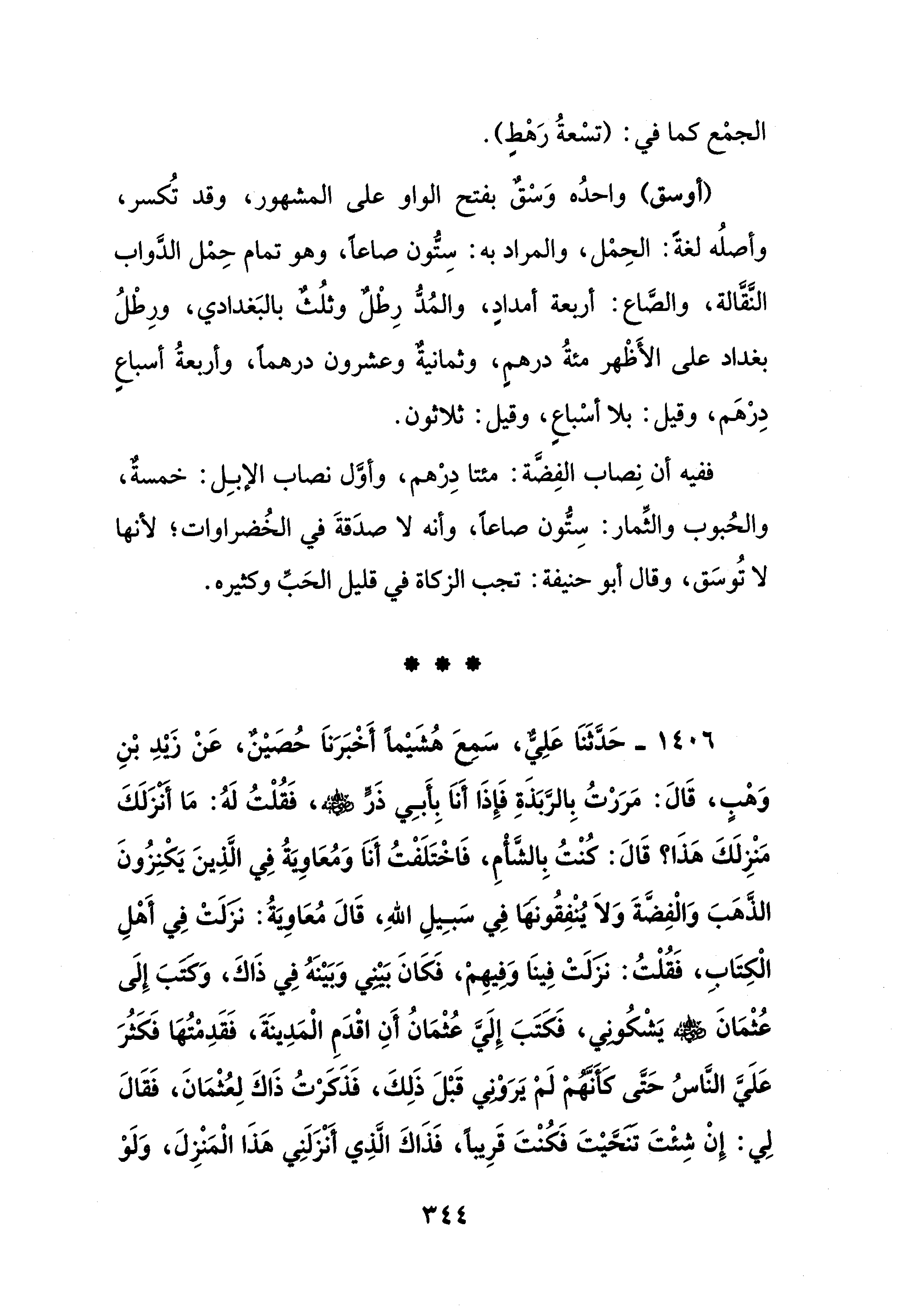 ففيه أن نِصاب الفِضَّة: مئتا دِرْهم، وأوَّل نصاب الإبِل: خمسةٌ، والحُبوب والثِّمار: سِتُّون صاعًا، وأنه لا صدَقةَ في الخُضراوات؛ لأنها لا تُوسَق، وقال أبو حنيفة: تجب الزكاة في قليل الحَبِّ وكثيره.