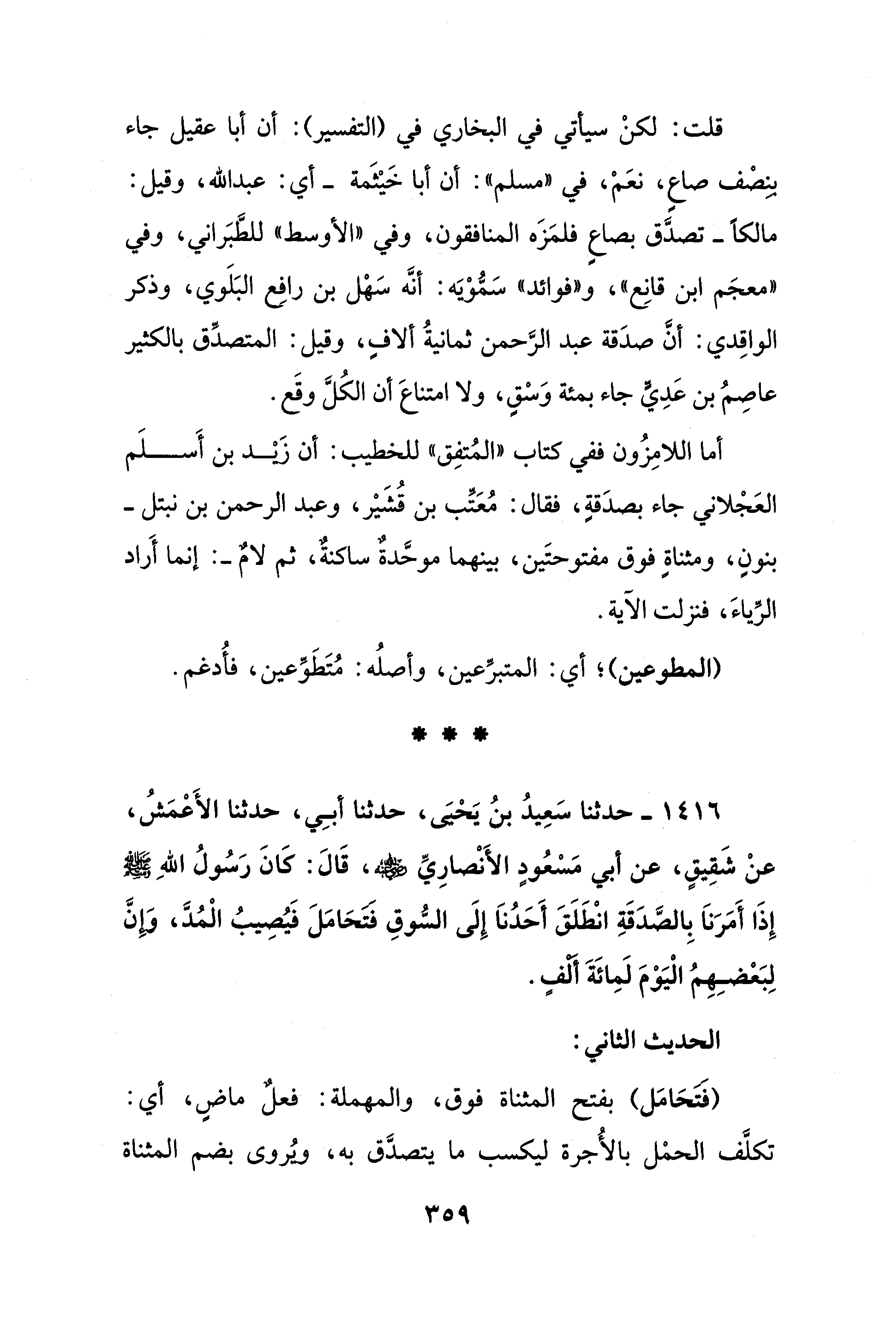 1416 - حدثنا سَعِيدُ بنُ يَحْيَى، حدثنا أبِي، حدثنا الأَعْمَشُ، عنْ شَقِيقٍ، عن أبي مَسْعُودٍ الأَنْصارِيِّ - رضي الله عنه -، قَالَ: كَانَ رَسُولُ اللهِ - صلى الله عليه وسلم - إِذَا أَمَرَناَ بِالصَّدَقَةِ انْطَلَقَ أَحَدُناَ إِلَى السُّوقِ فتحَامَلَ فَيُصِيبُ الْمُدَّ، وَإِنَّ لِبَعْضِهِمُ الْيَوْمَ لَمِائَةَ ألفٍ.