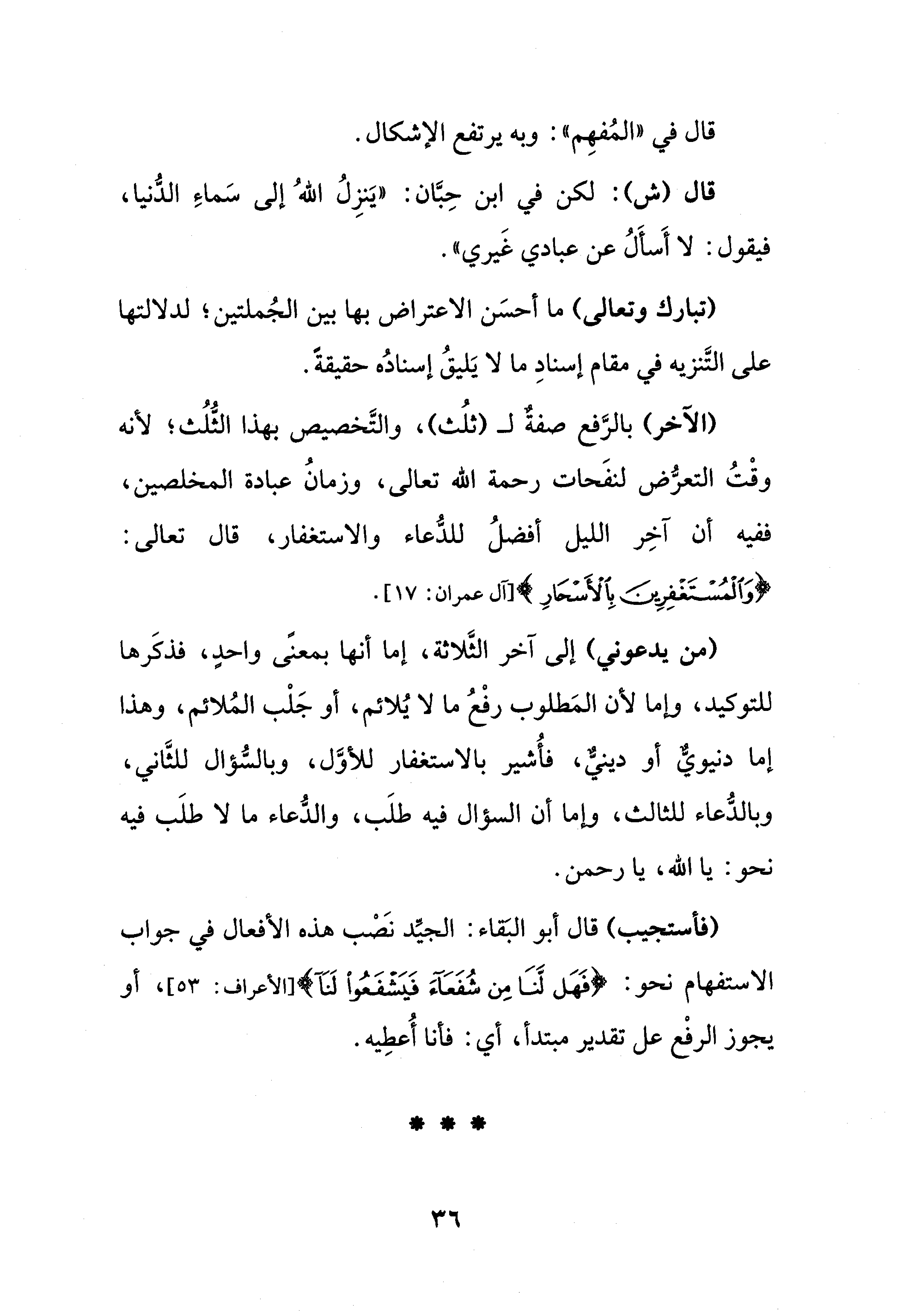 (الآخر) بالرَّفع صفةٌ لـ (ثلُث)، والتَّخصيص بهذا الثُّلُث؛ لأنه وقْتُ التعرُّض لنفَحات رحمة الله تعالى، وزمانُ عبادة المخلصين، ففيه أن آخِر الليل أفضلُ للدُّعاء والاستغفار، قال تعالى: {وَالْمُسْتَغْفِرِينَ بِالْأَسْحَارِ} [آل عمران: 17].