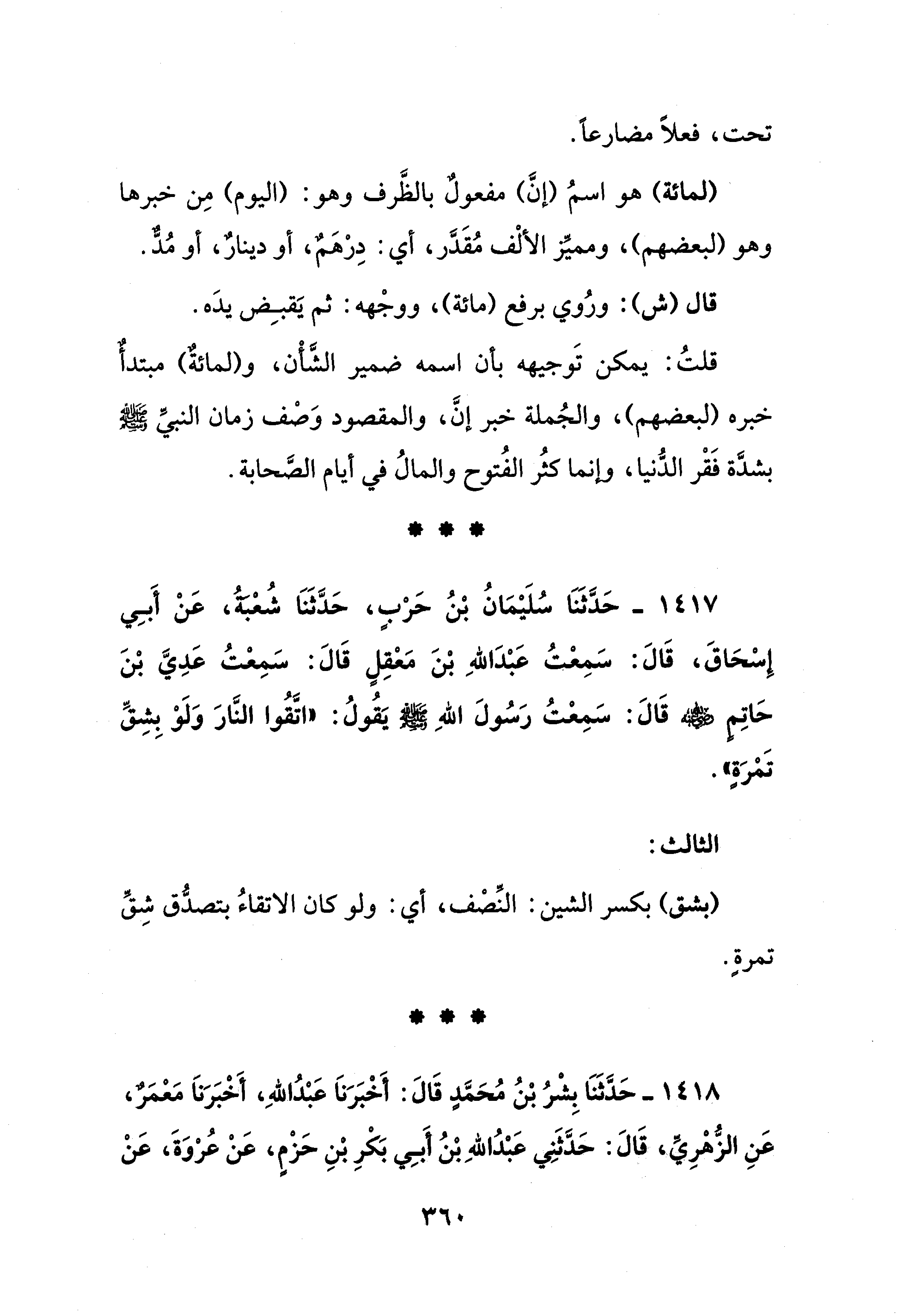 1417 - حَدَّثَنَا سُلَيْمَانُ بْنُ حَرْبٍ، حَدَّثَنَا شُعْبةُ، عَنْ أَبِي إِسْحَاقَ، قَالَ: سَمِعْتُ عَبْدَ اللهِ بْنَ مَعْقِلٍ قَالَ: سَمِعْتُ عَدِيَّ بْنَ حَاتِمٍ - رضي الله عنه - قَالَ: سَمِعْتُ رَسُولَ اللهِ - صلى الله عليه وسلم - يَقُولُ: "اتَّقُوا النَّارَ وَلَوْ بِشِقِّ تَمْرَةٍ".