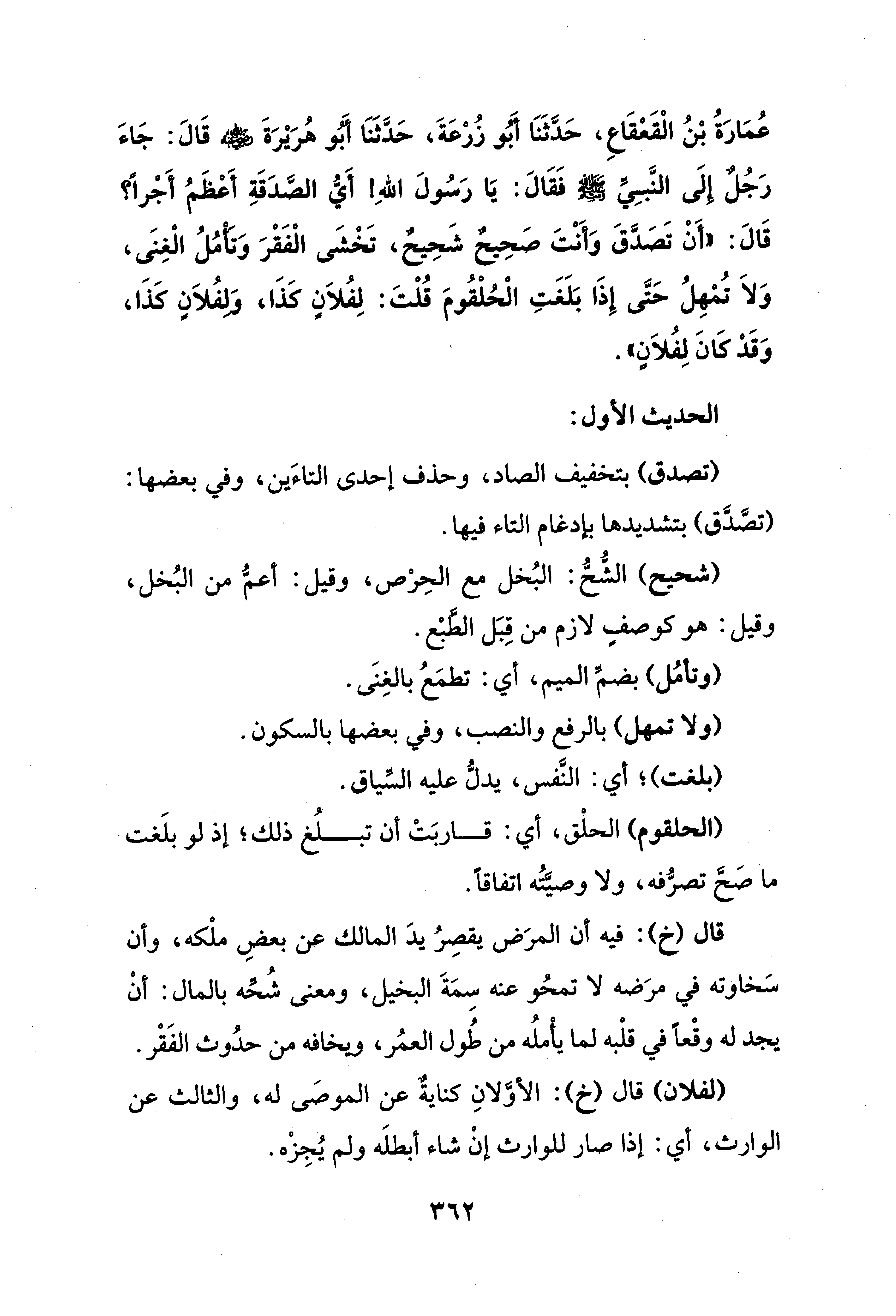 عُمَارَةُ بْنُ الْقَعْقَاعِ، حَدَّثَنَا أَبُو زُرْعَةَ، حَدَّثَنَا أَبُو هُرَيْرَةَ - رضي الله عنه - قَالَ: جَاءَ رَجُل إِلَى النَّبِيِّ - صلى الله عليه وسلم - فَقَالَ: يَا رَسُولَ اللهِ! أَيُّ الصَّدَقَةِ أَعْظَمُ أَجْرًا؟ قَالَ: "أَنْ تَصَدَّقَ وَأَنْتَ صَحِيحٌ شَحِيحٌ، تَخْشَى الْفَقْرَ وَتأْمُلُ الْغنَى، وَلاَ تُمْهِلُ حَتَّى إِذَا بَلَغَتِ الْحُلْقُومَ قُلْتَ: لِفُلاَنٍ كَذَا، وَلِفُلاَنٍ كَذَا، وَقَدْ كَانَ لِفُلاَنٍ".