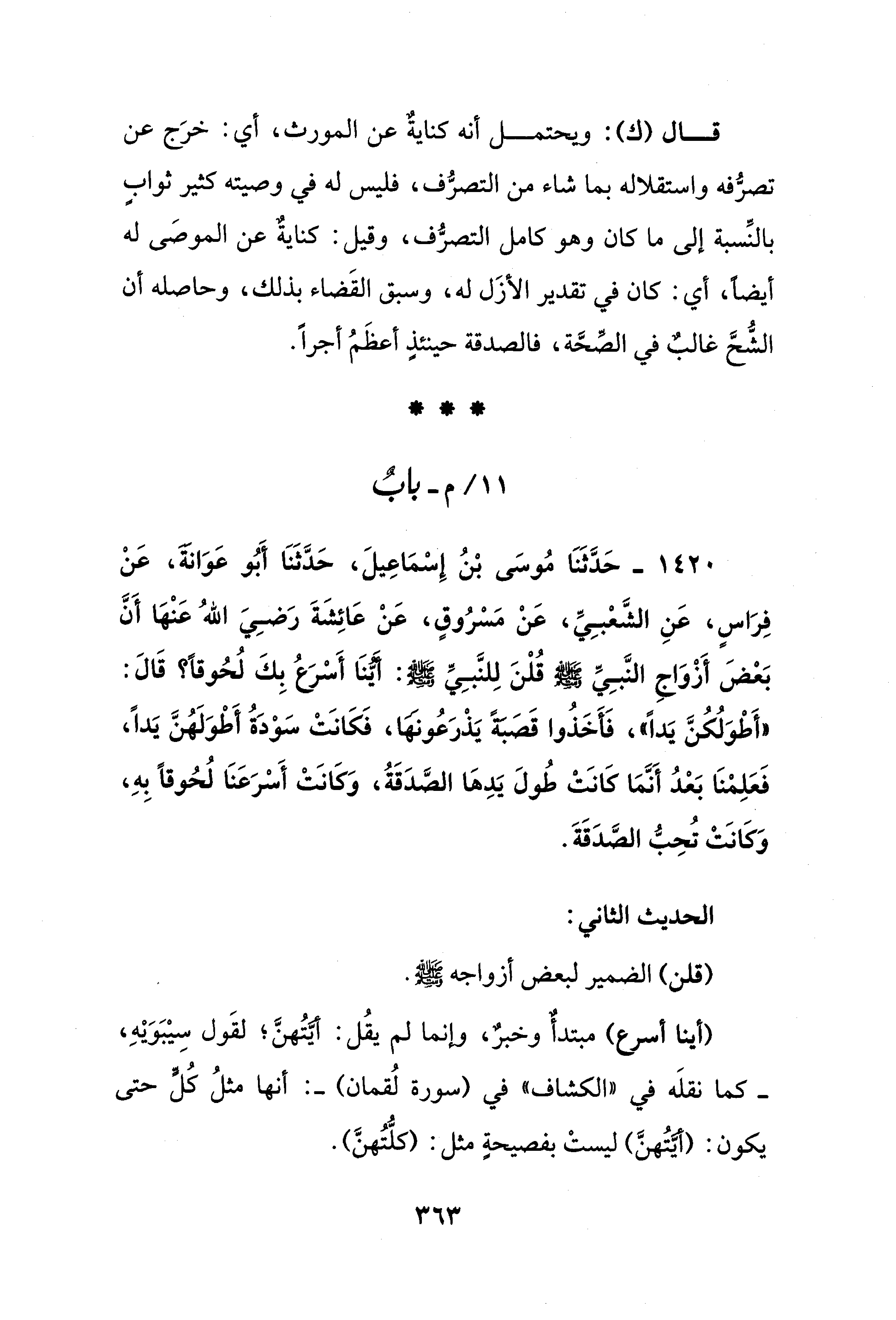 1420 - حَدَّثَنَا مُوسَى بْنُ إِسْمَاعِيلَ، حَدَّثَنَا أَبُو عَوَانة، عَنْ فِرَاسٍ، عَنِ الشَّعْبِيِّ، عَنْ مَسْرُوقٍ، عَنْ عَائِشَةَ رَضِيَ اللهُ عَنْهَا أَنَّ بَعْضَ أَزْوَاجِ النَّبِيِّ - صلى الله عليه وسلم - قُلْنَ لِلنَّبِيِّ - صلى الله عليه وسلم - أَيُّنَا أَسْرَعُ بِكَ لُحُوقًا؟ قَالَ: "أَطْوَلُكُنَّ يَدًا"، فَأَخَذُوا قَصَبَةً يَذْرَعُونَهَا، فَكَانَتْ سَوْدَةُ أَطْوَلَهُنَّ يَدًا، فَعَلِمْنَا بَعْدُ أَنَّمَا كَانَتْ طُولَ يَدِهَا الصَّدَقَةُ، وَكَانَتْ أَسْرَعَنَا لُحُوقًا بِهِ، وَكَانَتْ تُحِبُّ الصَّدَقَةَ.