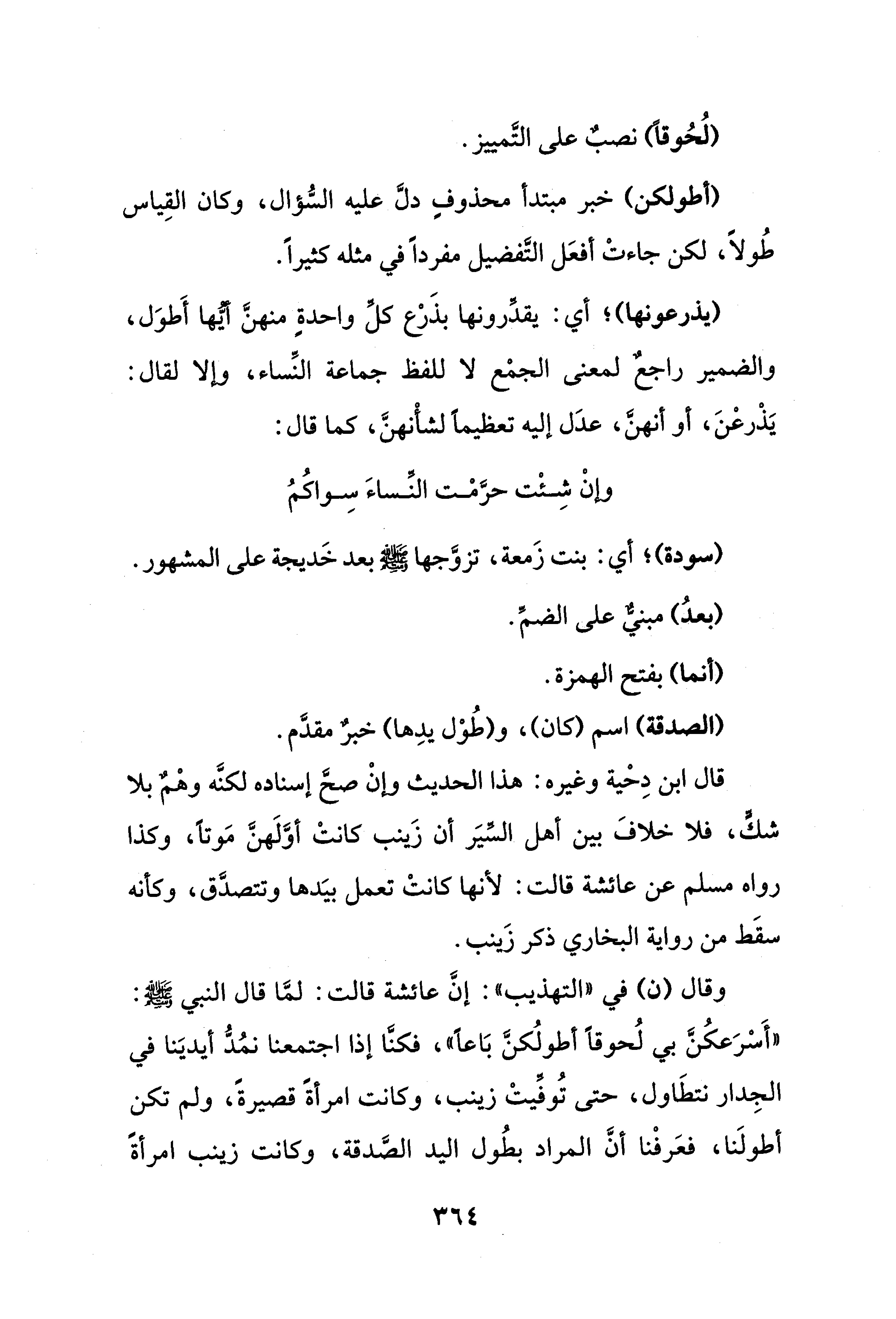 وقال (ن) في "التهذيب": إنَّ عائشة قالت: لمَّا قال النبي - صلى الله عليه وسلم -: "أَسْرَعكُنَّ بي لُحوقًا أطولُكنَّ بَاعًا"، فكنَّا إذا اجتمعنا نمُدُّ أيديَنا في الجِدار نتطَاول، حتى تُوفِّيتْ زينب، وكانت امرأةً قصيرةً، ولم تكن أطولَنا، فعَرفْنا أنَّ المراد بطُول اليد الصَّدقة، وكانت زينب امرأةً