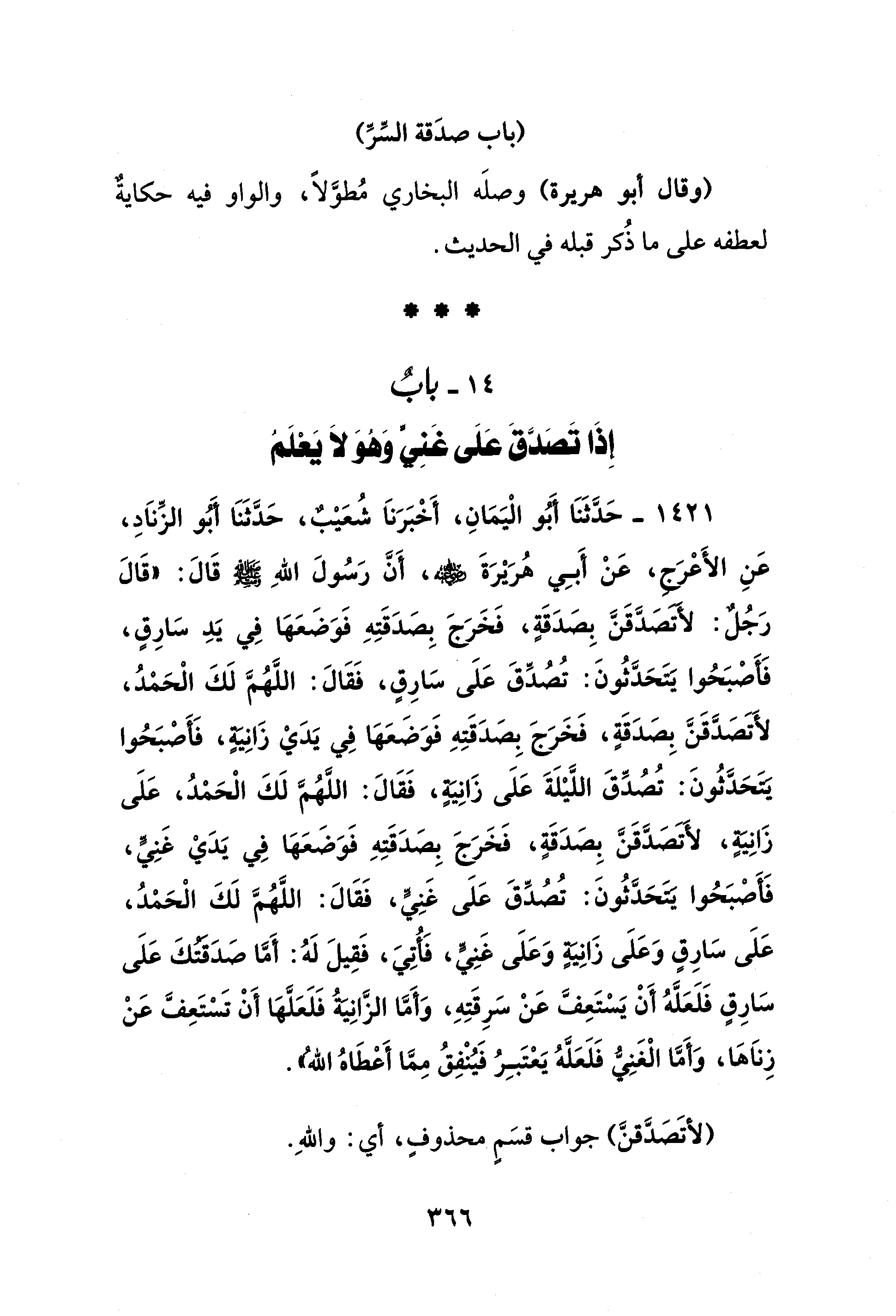 1421 - حَدَّثَنَا أَبُو الْيَمَانِ، أَخْبَرَناَ شُعَيْبٌ، حَدَّثَنَا أَبُو الزِّناَدِ، عَنِ الأَعْرَجِ، عَنْ أَبِي هُرَيْرَةَ - رضي الله عنه -، أَنَّ رَسُولَ اللهِ - صلى الله عليه وسلم - قَالَ: "قَالَ رَجُلٌ: لأَتصَدَّقَنَّ بِصَدَقَةٍ، فَخَرَجَ بِصَدَقَتِهِ فَوَضَعَهَا فِي يَدِ سَارِقٍ، فَأصْبَحُوا يَتَحَدَّثُونَ: تُصُدِّقَ عَلَى سَارِقٍ، فَقَالَ: اللَّهُمَّ لَكَ الْحَمْدُ، لأَتَصَدَّقَنَّ بِصَدَقَةٍ، فَخَرَجَ بِصَدَقَتِهِ فَوَضَعَهَا فِي يَدَيْ زَانِيَةٍ، فَأَصْبَحُوا يَتَحَدثُونَ: تُصُدِّقَ اللَّيْلَةَ عَلَى زَانِيَةٍ، فَقَالَ: اللَّهُمَّ لَكَ الْحَمْدُ، عَلَى زَانِيةٍ، لأَتصَدَّقَنَّ بِصَدَقَةٍ، فَخَرَجَ بِصَدَقَتِهِ فَوَضَعَهَا فِي يَدَيْ غَنِيٍّ، فَأَصْبَحُوا يَتَحَدَّثُونَ: تُصُدِّقَ عَلَى غَنِيٍّ، فَقَالَ: اللَّهُمَّ لَكَ الْحَمْدُ، عَلَى سَارِقٍ وَعَلَى زَانِيةٍ وَعَلَى غَنِيٍّ، فَأُتِيَ، فَقِيلَ لَهُ: أَمَّا صَدَقتكَ عَلَى سَارِقٍ فَلَعَلَّهُ أَنْ يَسْتَعِفَّ عَنْ سَرِقَتِهِ، وَأَمَّا الزَّانِيةُ فَلَعَلَّهَا أَنْ تَسْتَعِفَّ عَنْ زِنَاهَا، وَأَمَّا الْغَنِيُّ فَلَعَلَّهُ يَعْتَبِرُ فَيُنْفِقُ مِمَّا أَعْطَاهُ الله".