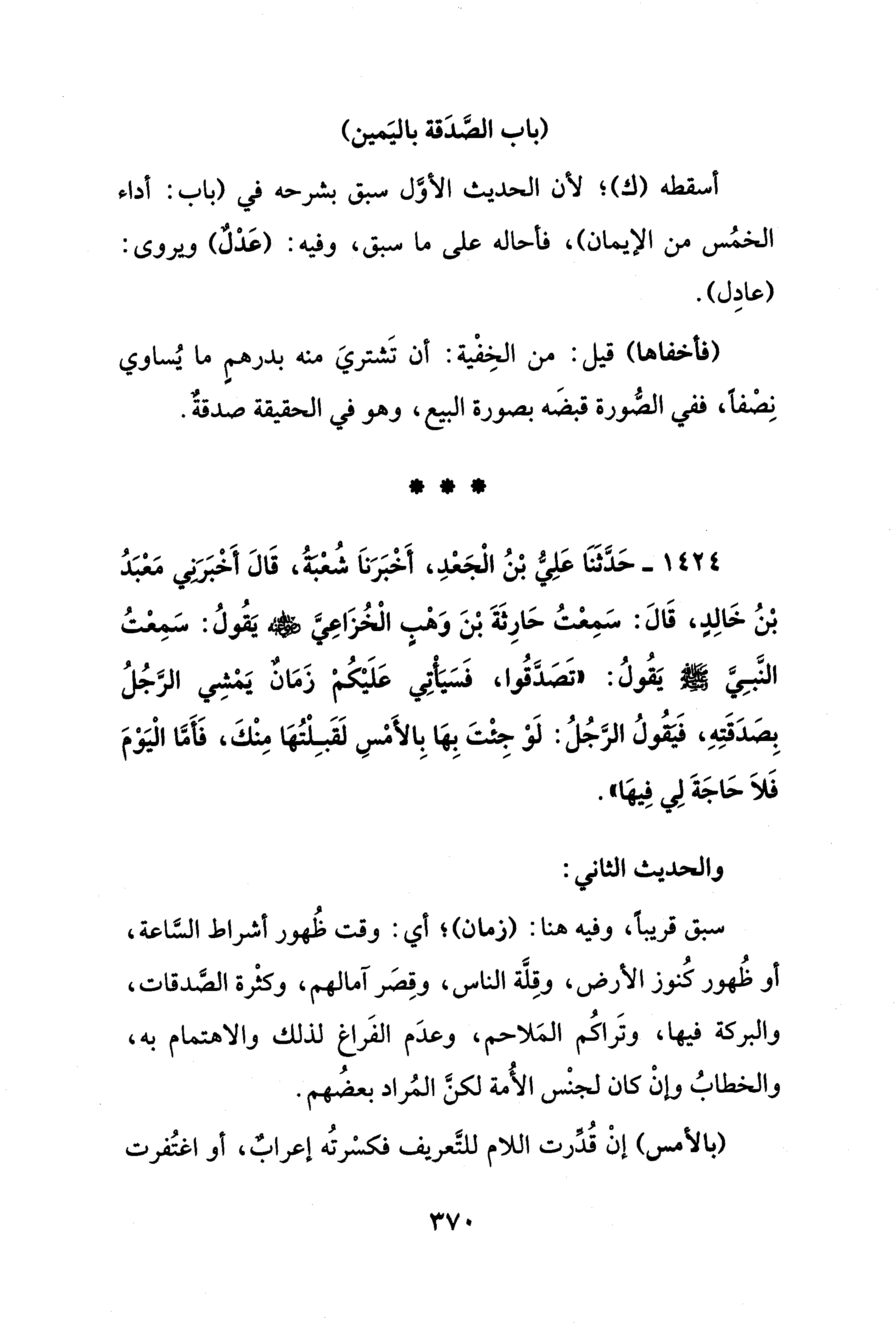 1424 - حَدَّثَنَا عَلِيُّ بْنُ الْجَعْدِ، أَخْبَرَناَ شُعْبَةُ، قَالَ أَخْبَرَني مَعْبَدُ بْنُ خَالِدٍ، قَالَ: سَمِعْتُ حَارِثَةَ بْنَ وَهْبٍ الْخُزَاعِيِّ - رضي الله عنه - يَقُولُ: سَمِعْتُ النَّبِيَّ - صلى الله عليه وسلم - يَقُولُ: "تَصَدَّقُوا، فَسَيَأْتِي عَلَيْكُمْ زَمَانٌ يَمْشِي الرَّجُلُ بِصَدَقَتِهِ، فَيَقُولُ الرَّجُلُ: لَوْ جِئْتَ بِهَا بِالأَمْسِ لَقَبِلْتُهَا مِنْكَ، فَأَمَّا الْيَوْمَ فَلاَ حَاجَةَ لِي فِيهَا".