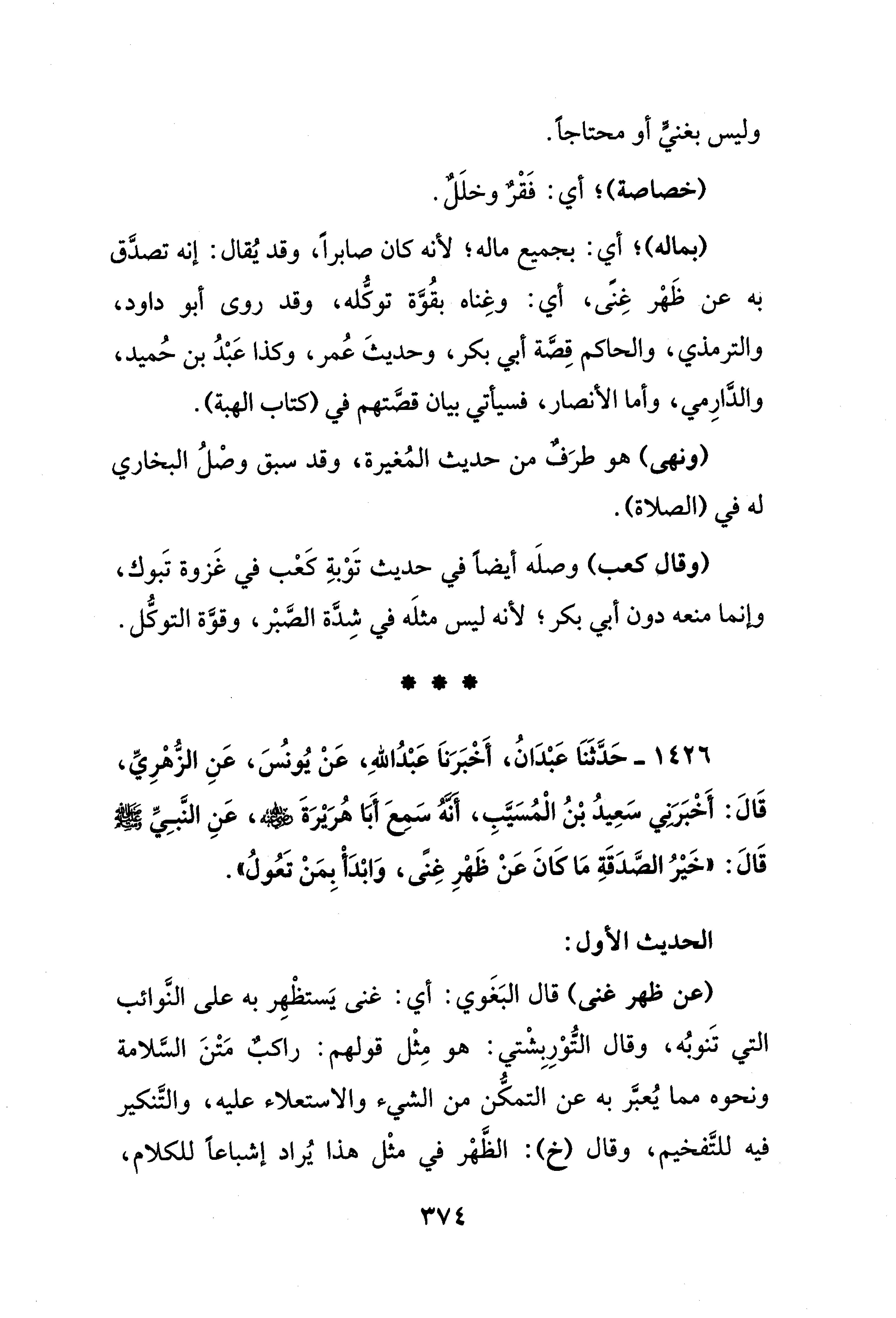 1426 - حَدَّثَنَا عَبْدَانُ، أَخْبَرَناَ عَبْدُ اللهِ، عَنْ يُونُسَ، عَنِ الزُّهْرِيِّ، قَالَ: أَخْبَرَني سَعِيدُ بْنُ الْمُسَيَّبِ، أنَّهُ سَمعَ أَبَا هُرَيْرَةَ - رضي الله عنه -، عَنِ النَّبِيِّ - صلى الله عليه وسلم - قَالَ: "خَيْرُ الصَّدَقَةِ مَا كَانَ عَنْ ظَهْرِ غِنًى، وَابْدَأْ بِمَنْ تَعُولُ".