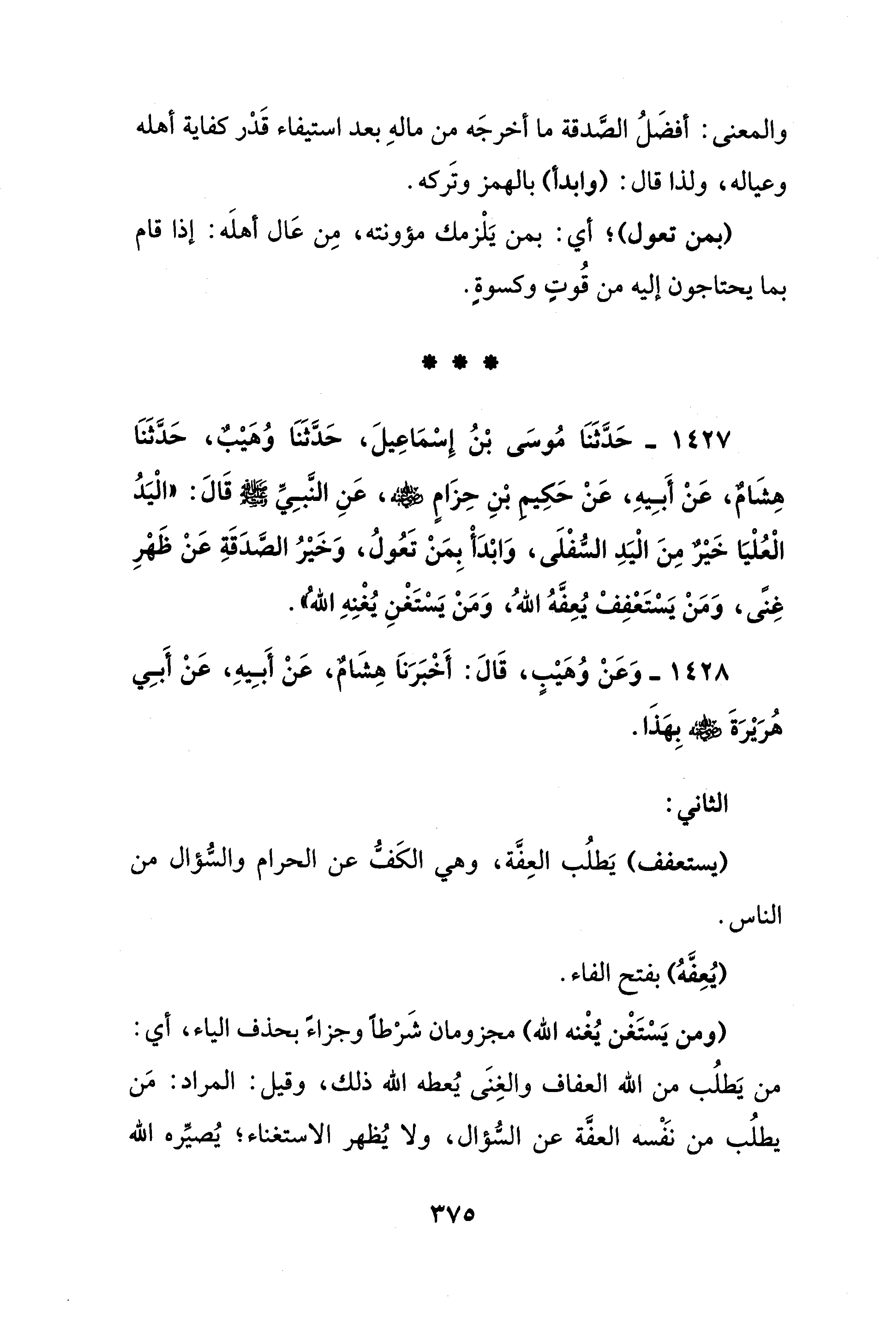 1427 - حَدَّثَنَا مُوسَى بْنُ إِسْمَاعِيلَ، حَدَّثَنَا وُهَيْبٌ، حَدَّثَنَا هِشَامٌ، عَنْ أَبِيهِ، عَنْ حَكِيم بْنِ حِزَامٍ - رضي الله عنه -، عَنِ النَّبِيِّ - صلى الله عليه وسلم - قَالَ: "الْيَدُ الْعُلْيَا خَيْرٌ مِنَ الْيَدِ السُّفْلَى، وَابْدَأْ بِمَنْ تَعُولُ، وَخَيْرُ الصَّدَقَةِ عَنْ ظَهْرِ غِنًى، وَمَنْ يَسْتَعْفِفْ يُعِفَّهُ اللهُ، وَمَنْ يَسْتَغْنِ يُغْنِهِ الله".