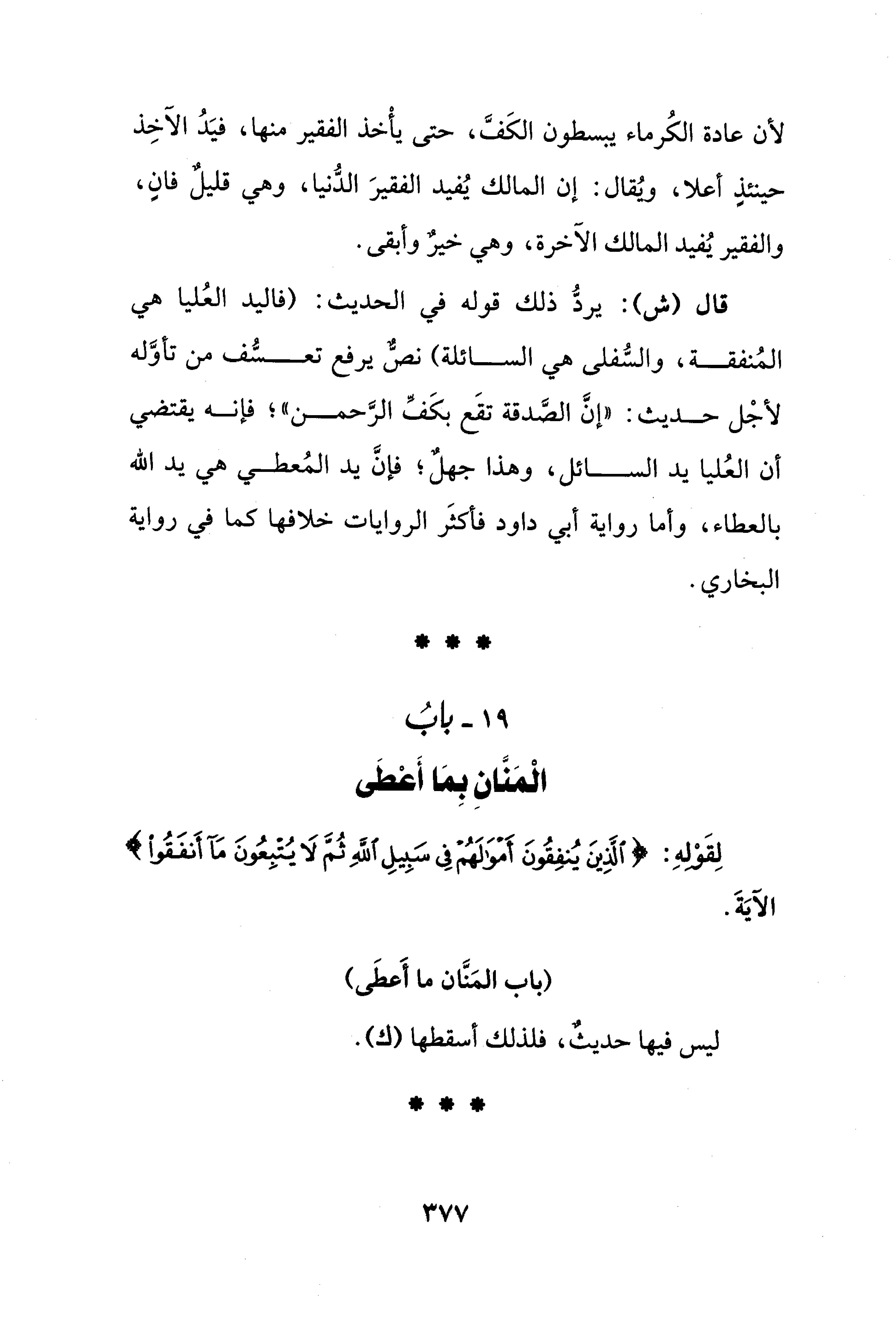 قال (ش): يردُّ ذلك قوله في الحديث: (فاليد العُليا هي المُنفقة، والسُّفلى هي السائلة) نصٌّ يرفع تعسُّف من تأوَّله لأجْل حديث: "إنَّ الصَّدقة تقَع بكَفِّ الرَّحمن"؛ فإنه يقتضي أن العُليا يد السائل، وهذا جهلٌ؛ فإنَّ يد المُعطي هي يد الله بالعطاء، وأما رواية أبي داود فأكثَر الروايات خلافها كما في رواية البخاري.