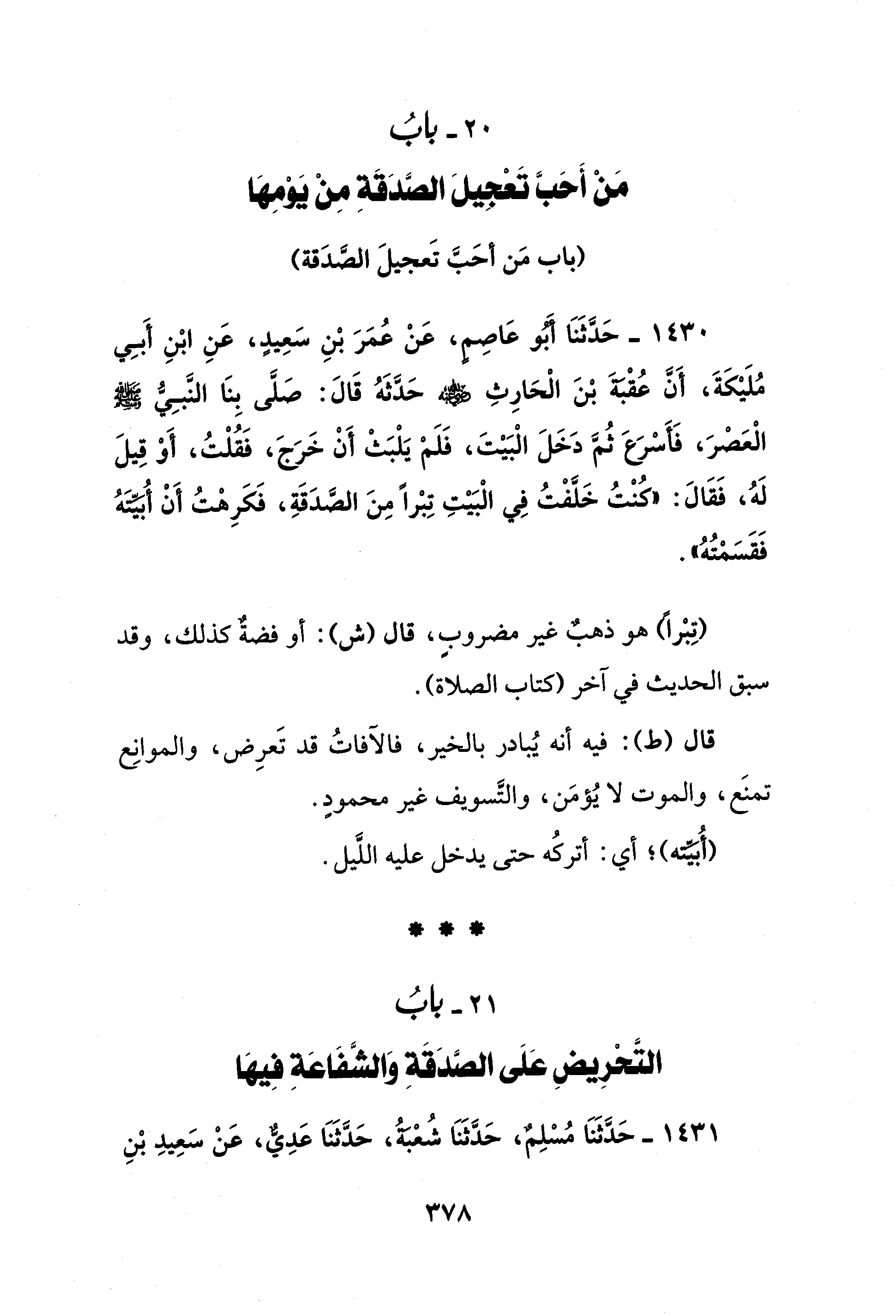 1430 - حَدَّثَنَا أَبَو عَاصِمٍ، عَنْ عُمَرَ بْنِ سَعِيدٍ، عَنِ ابْنِ أَبِي مُلَيْكَةَ، أَنَّ عُقْبَةَ بْنَ الْحَارِثِ - رضي الله عنه - حَدَّثَهُ قَالَ: صَلَّى بِنَا النَّبِيُّ - صلى الله عليه وسلم - الْعَصْرَ، فَأَسْرعَ ثُمَّ دَخَلَ الْبَيْتَ، فَلَمْ يَلْبَثْ أَنْ خَرَجَ، فَقُلْتُ، أَوْ قِيلَ لَهُ، فَقَالَ: "كنْتُ خَلَّفْتُ فِي الْبَيْتِ تِبْرًا مِنَ الصَّدَقَةِ، فَكَرِهْتُ أَنْ أُبَيِّتَهُ فَقَسَمْتُهُ".