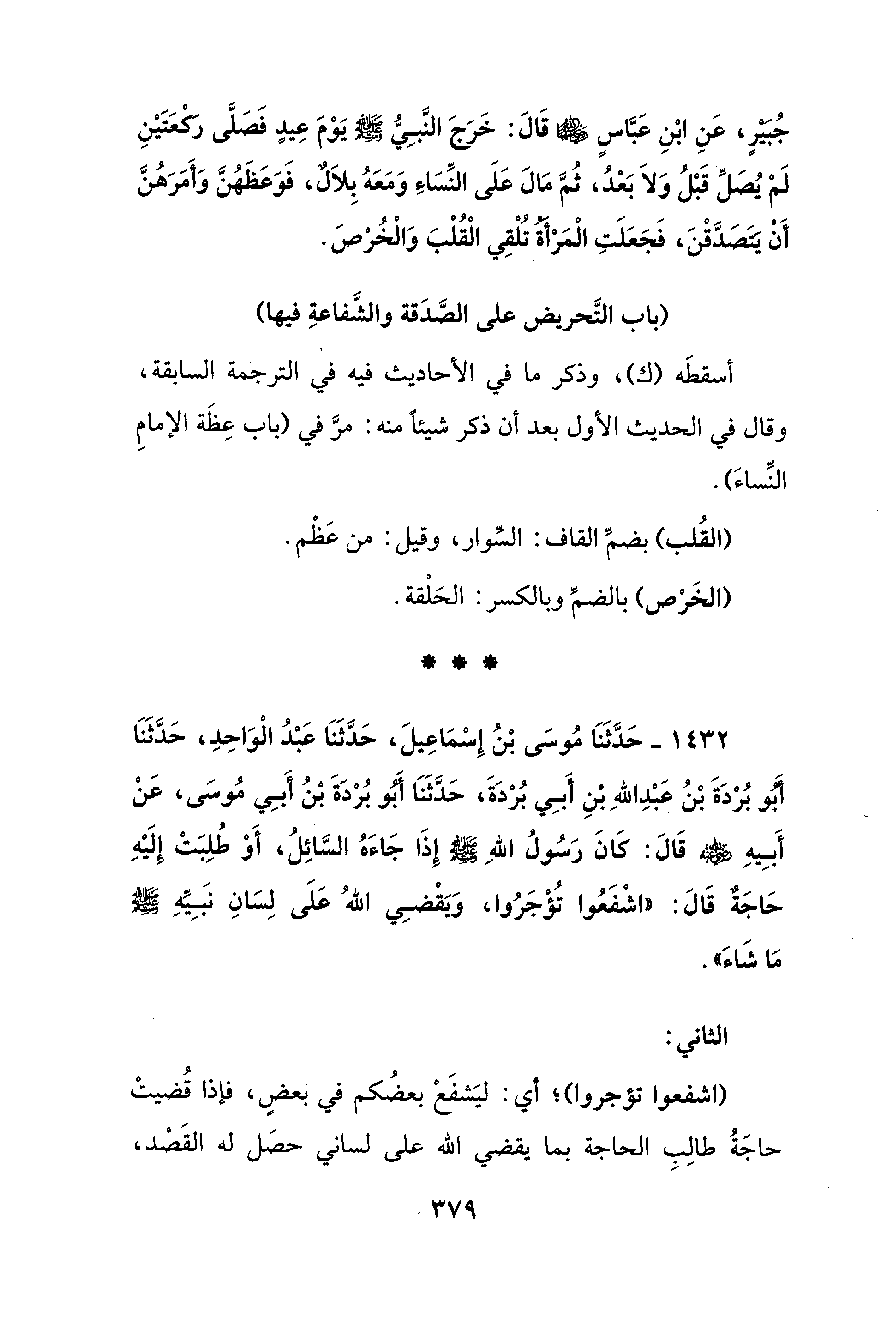 جُبَيْرٍ، عَنِ ابْنِ عَبَّاسٍ - رضي الله عنهما - قَالَ: خَرَجَ النَّبِيُّ - صلى الله عليه وسلم - يَوْمَ عِيدٍ فَصَلَّى ركعَتَيْنِ لَمْ يُصَلِّ قَبْلُ وَلاَ بَعْدُ، ثُمَّ مَالَ عَلَى النِّسَاءِ وَمَعَهُ بِلاَلٌ، فَوَعَظَهُنَّ وَأَمَرَهُنَّ أن يَتَصَدَّقْنَ، فَجَعَلَتِ الْمَرْأةُ تُلْقِي الْقُلْبَ وَالْخُرْصَ.