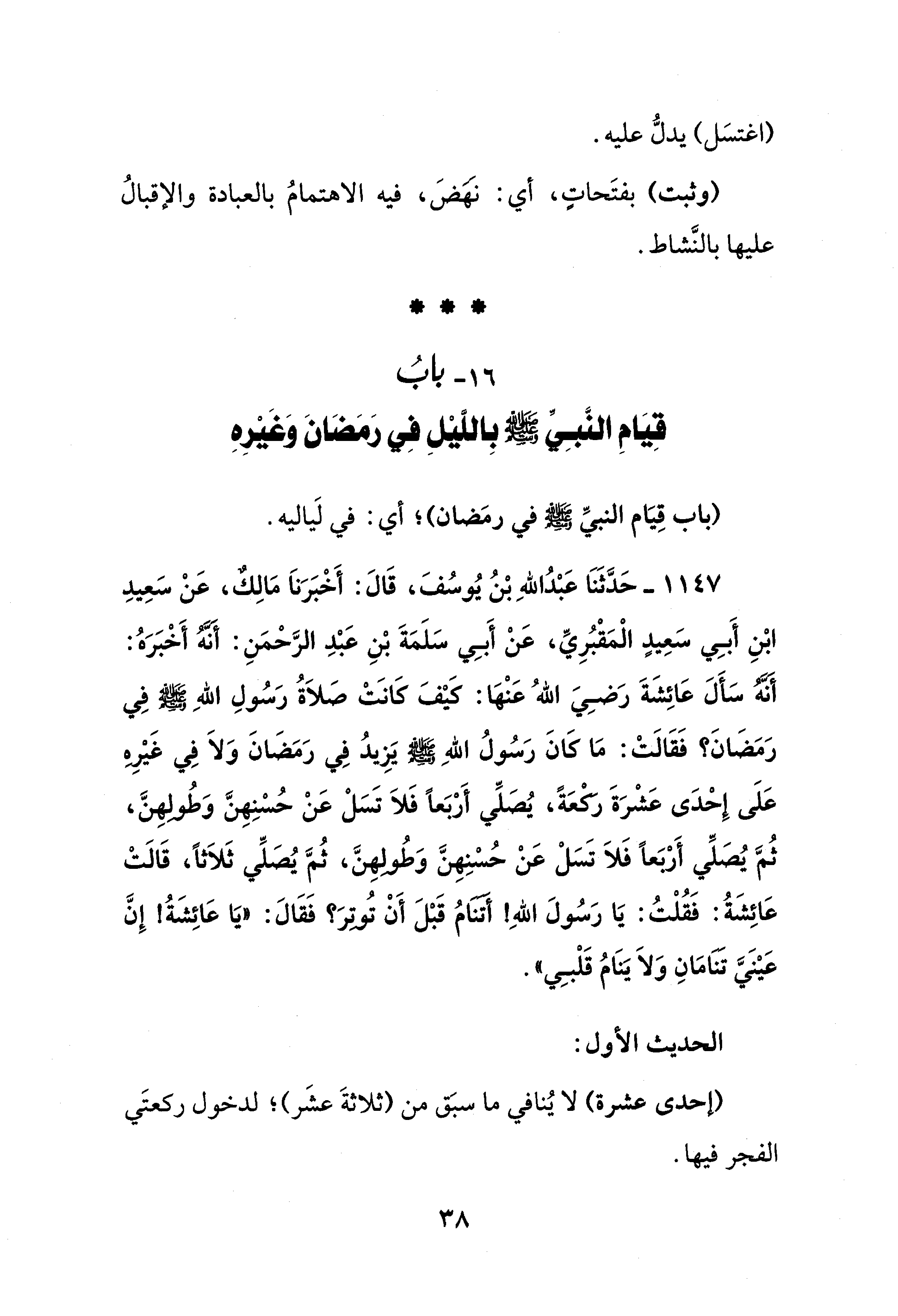 1147 - حَدَّثَنَا عَبْدُ اللهِ بْنُ يُوسُفَ، قَالَ: أَخْبَرَناَ مَالِكٌ، عَنْ سَعِيدِ ابْنِ أَبِي سَعِيدٍ الْمَقْبُرِيِّ، عَنْ أَبِي سَلَمَةَ بْنِ عَبْدِ الرَّحْمَنِ: أنه أَخْبَرَهُ: أنَّهُ سَأَلَ عَائِشَةَ رَضِيَ اللهُ عَنْهَا: كيْفَ كَانَتْ صَلاَةُ رَسُولِ اللهِ - صلى الله عليه وسلم - فِي رَمَضَانَ؟ فَقَالَتْ: مَا كَانَ رَسُولُ اللهِ - صلى الله عليه وسلم - يَزِيدُ فِي رَمَضَانَ وَلاَ فِي غَيْرِه عَلَى إِحْدَى عَشْرَةَ ركْعَةً، يُصَلِّي أَرْبَعًا فَلاَ تَسَلْ عَنْ حُسْنِهِنَّ وَطُولهِنَّ، ثُمَّ يُصَلِّي أَرْبَعًا فَلاَ تَسَلْ عَنْ حُسْنِهِنَّ وَطُولهِنَّ، ثُمَّ يُصَلِّي ثَلاَثًا، قَالَتْ عَائِشَةُ: فَقُلْتُ: يَا رَسُولَ اللهِ! أتنامُ قَبْلَ أَنْ تُوتِرَ؟ فَقَالَ: "يَا عَائِشَةُ! إِنَّ عَيْنَيَّ تنامَانِ وَلاَ يَنَامُ قَلْبِي".