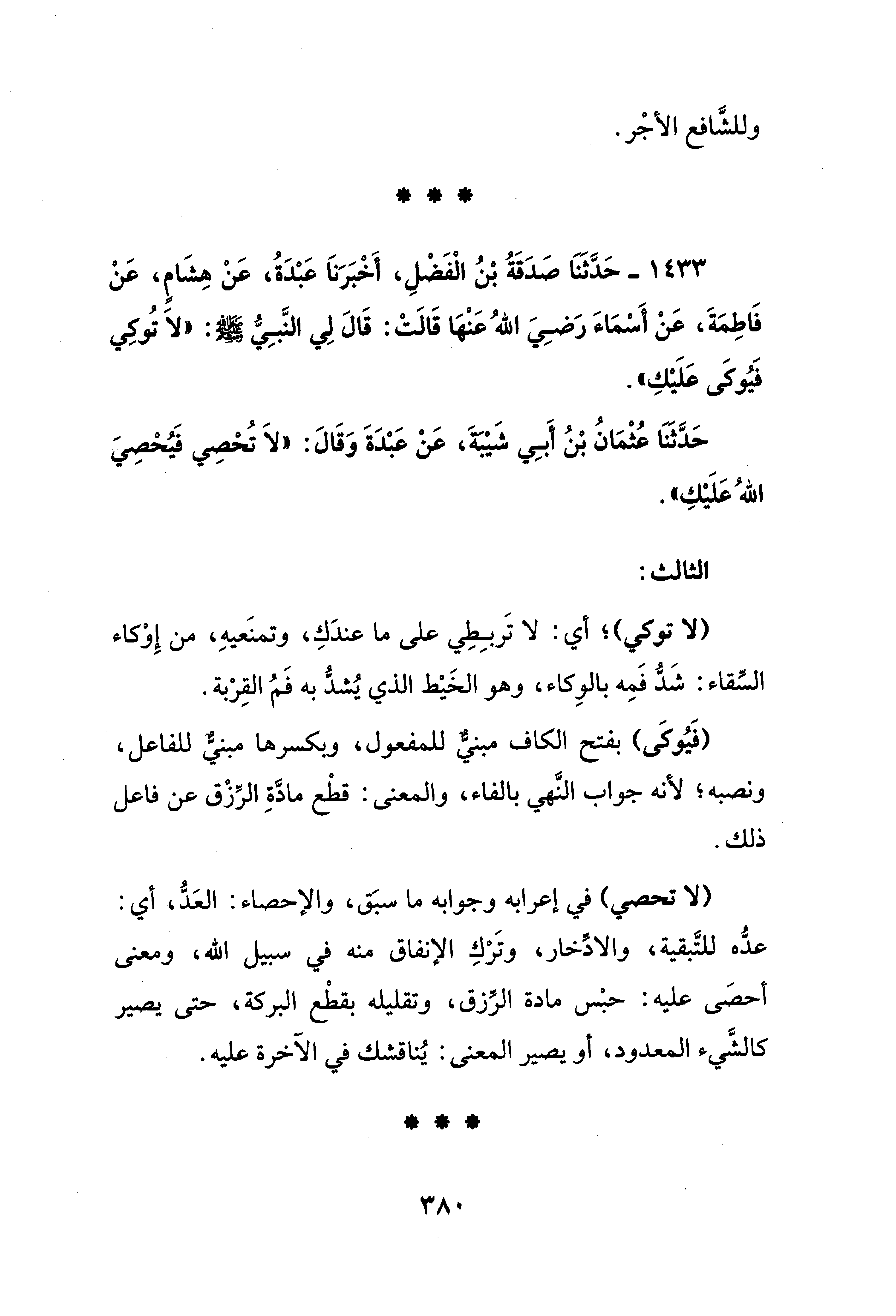 1433 - حَدَّثَنَا صَدَقَةُ بْنُ الْفَضْلِ، أَخْبَرَناَ عَبْدَةُ، عَنْ هِشَامٍ، عَنْ فَاطِمَةَ، عَنْ أَسْمَاءَ رَضِيَ اللهُ عَنْهَا قالَتْ: قَالَ لِي النَّبِيُّ - صلى الله عليه وسلم -: "لاَ تُوكِي فَيُوكَى عَلَيْكِ".