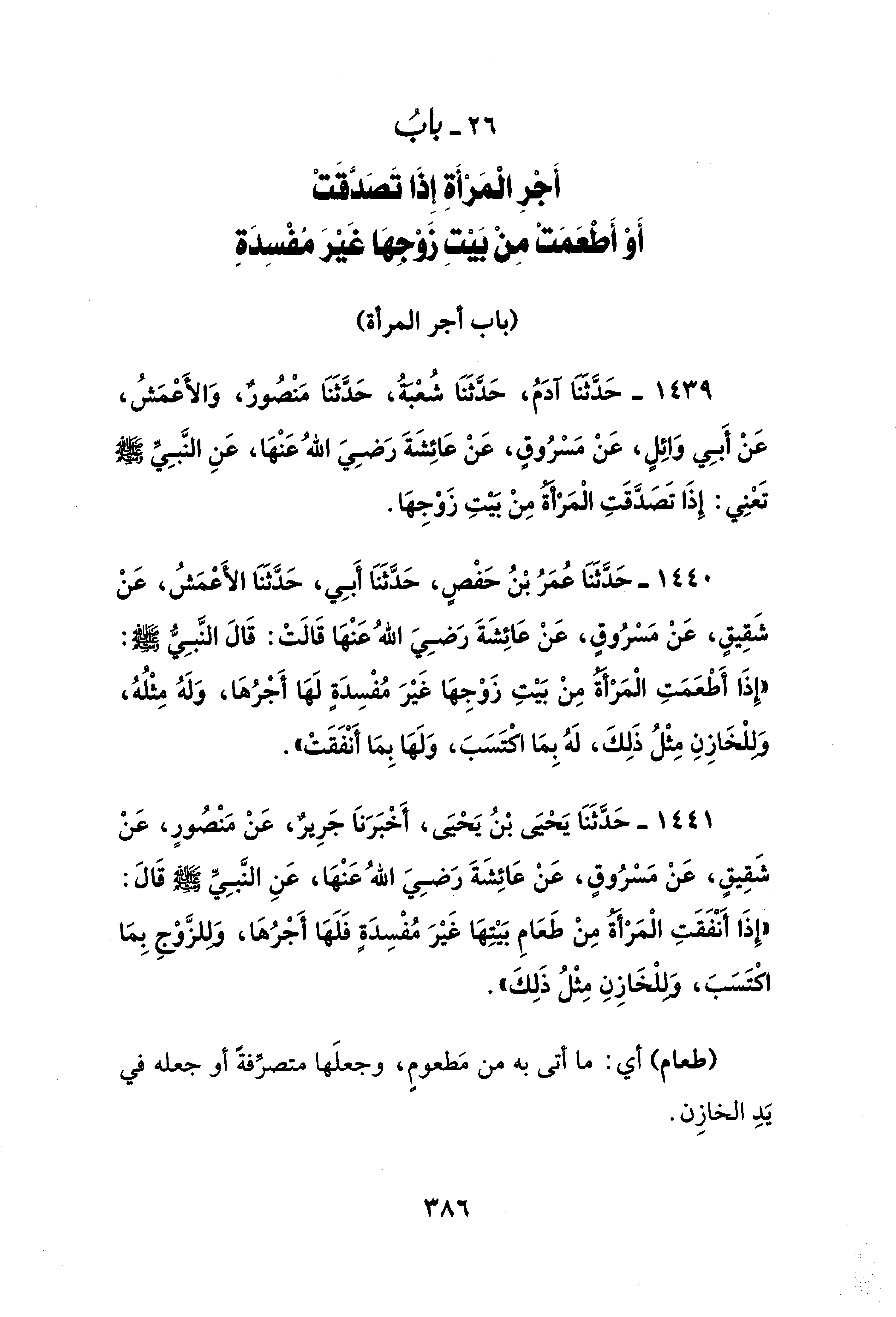 1439 - حَدثَنَا آدَمُ، حَدَّثَنَا شُعْبة، حَدَّثَنَا مَنْصُور، وَالأَعْمَشُ، عَنْ أَبِي وَائِلٍ، عَنْ مَسْرُوقٍ، عَنْ عَائِشَةَ رَضِيَ اللهُ عَنْهَا، عَنِ النَّبِيِّ - صلى الله عليه وسلم - تَعْنِي: إِذَا تَصَدَّقَتِ الْمَرْأَةُ مِنْ بَيْتِ زَوْجِهَا.