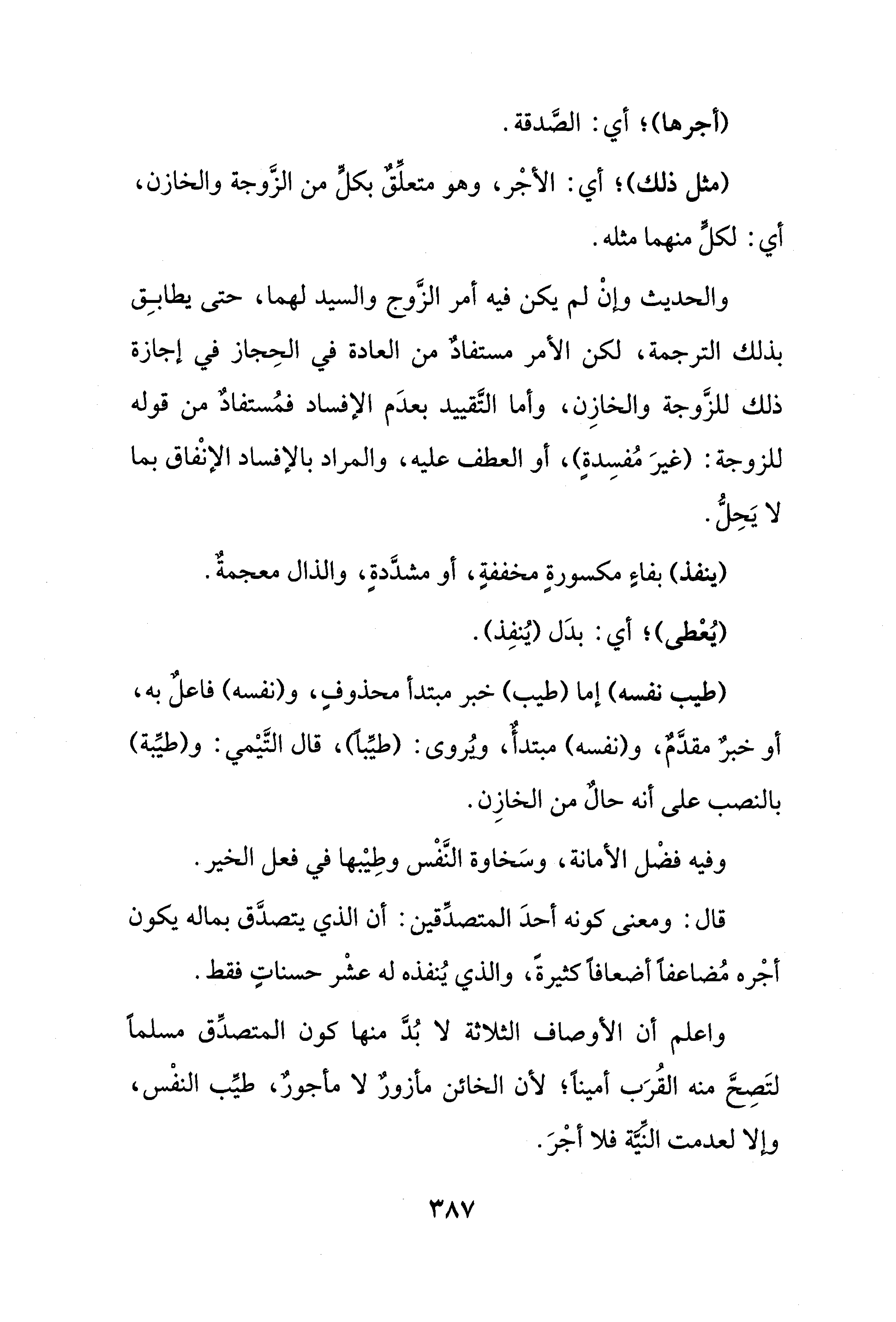 واعلم أن الأوصاف الثلاثة لا بُدَّ منها كون المتصدِّق مسلمًا لتَصِحَّ منه القُرَب أمينًا؛ لأن الخائن مأزورٌ لا مأجورٌ، طيِّب النفْس، وإلا لعدمت النِّيَّة فلا أجْرَ.
