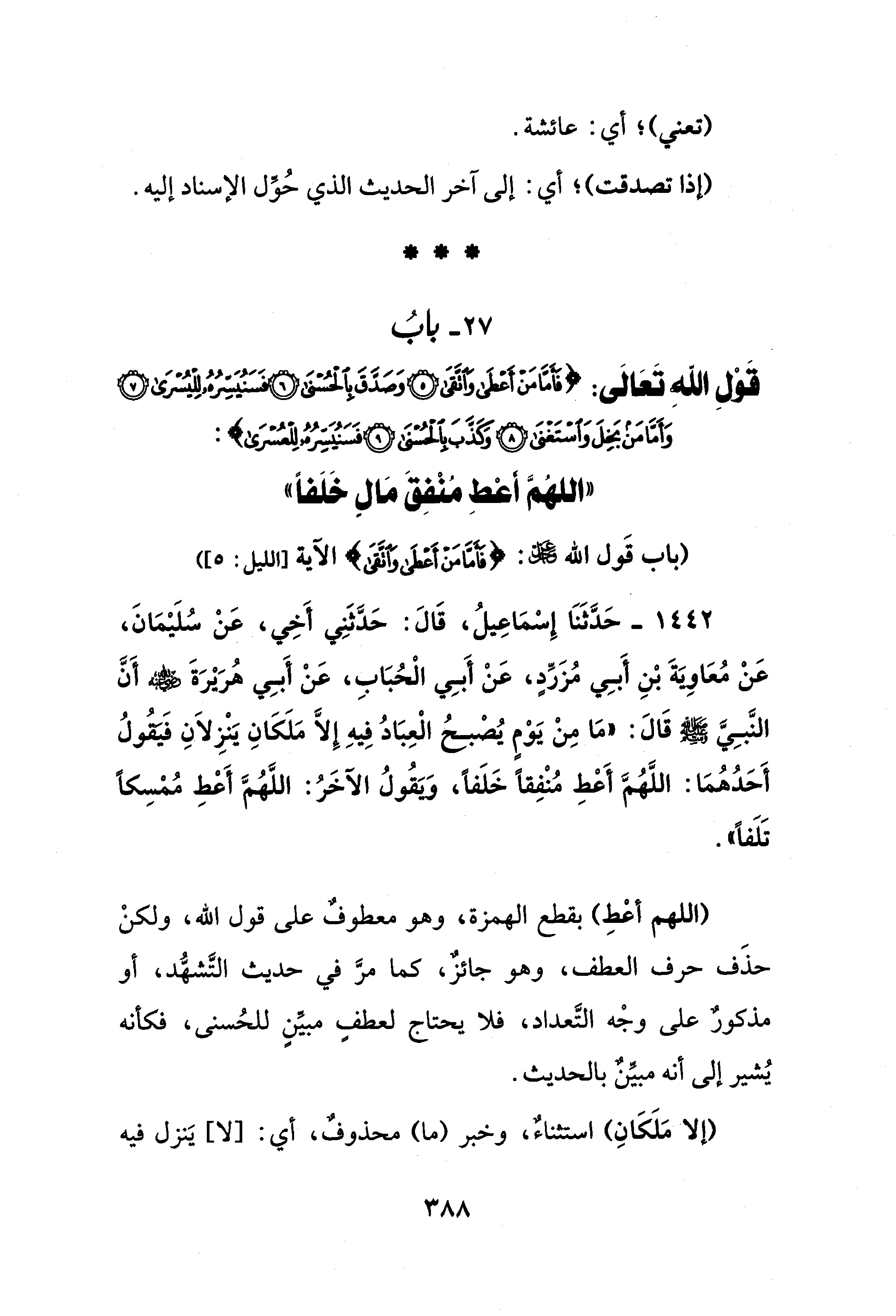 (اللهم أعْطِ) بقطع الهمزة، وهو معطوفٌ على قول الله، ولكنْ حذَف حرف العطف، وهو جائزٌ، كما مرَّ في حديث التَّشهُّد، أو مذكورٌ على وجْه التَّعداد، فلا يحتاج لعطفٍ مبيِّنٍ للحُسنى، فكأنه يُشير إلى أنه مبيِّنٌ بالحديث.