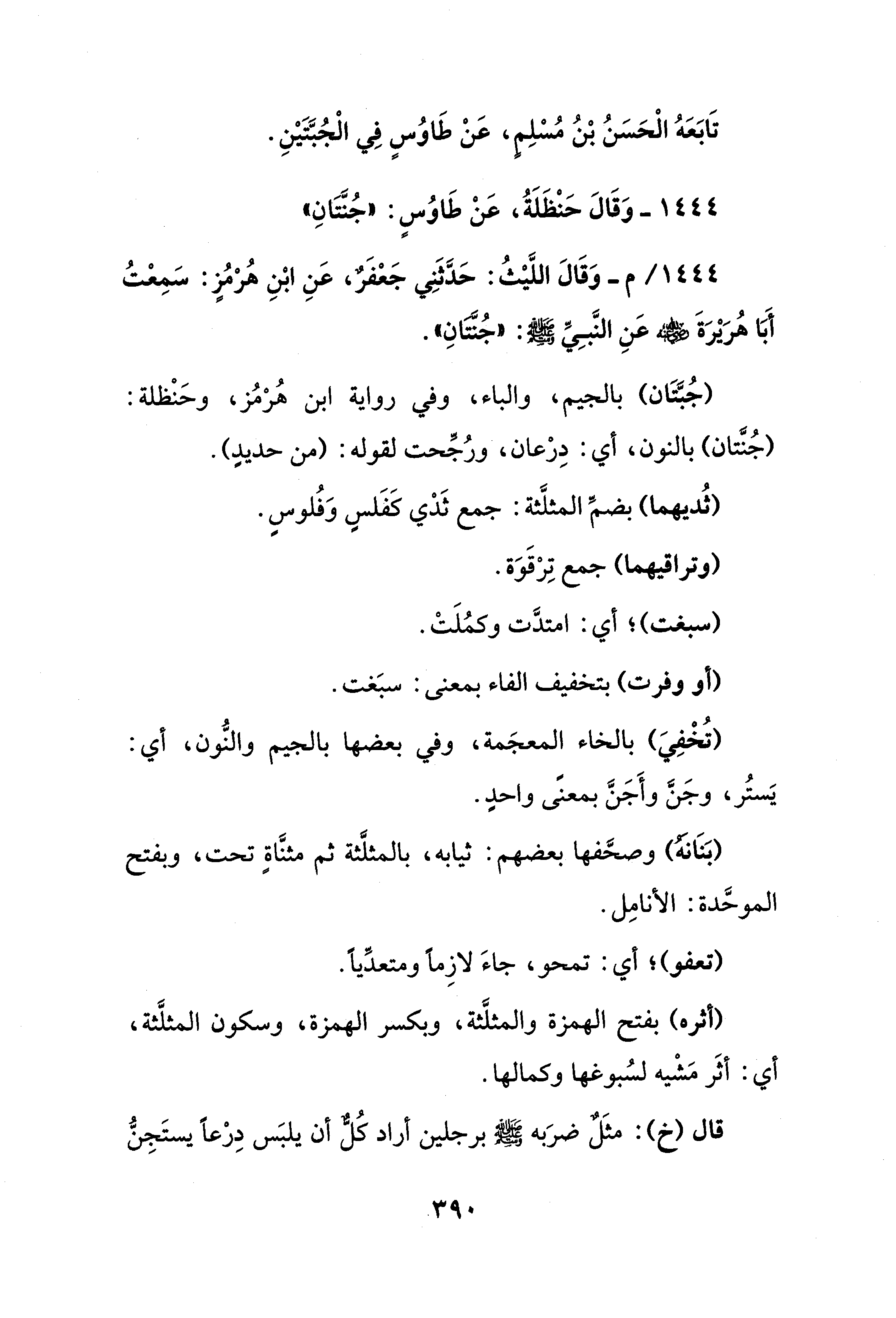 1444 / -م - وَقَالَ اللَّيْثُ: حَدَّثَنِي جَعْفَرٌ، عَنِ ابْنِ هُرْمُزٍ: سَمِعْتُ أَبَا هُرَيرَةَ - رضي الله عنه - عَنِ النَّبِيِّ - صلى الله عليه وسلم -: "جُنَّتانِ".